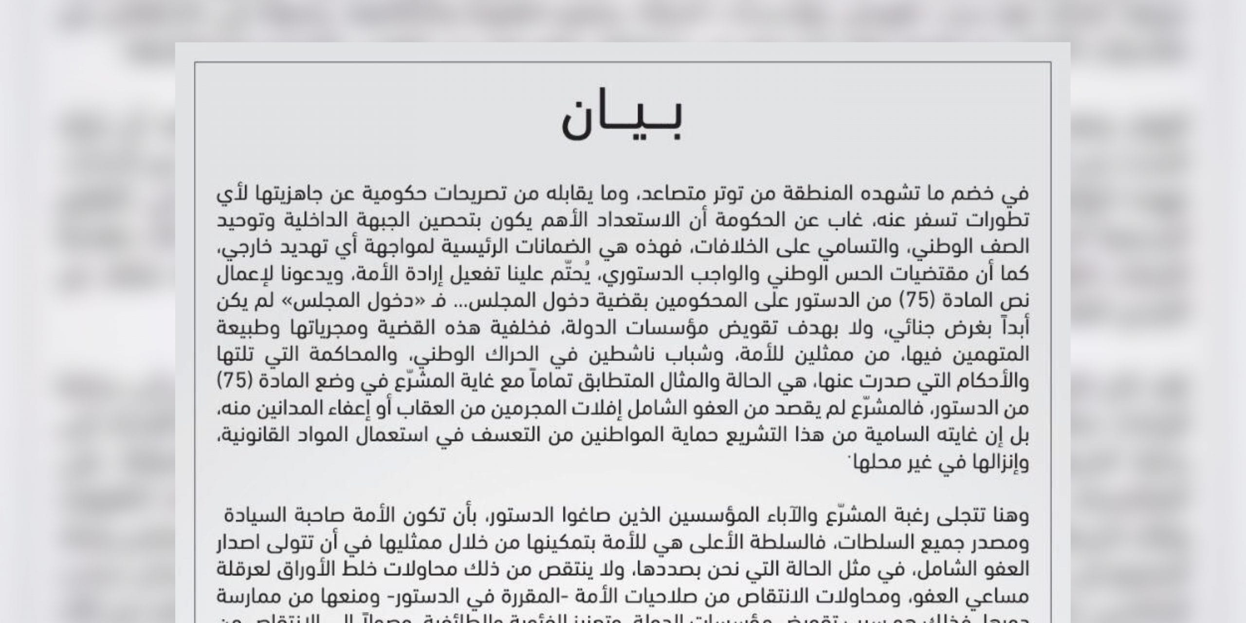 أصدر عدد من الناشطين السياسيين بياناً صحفيا أكدوا فيه أن الواجب في ظل الأوضاع الإقليمية المحيطة أن يتم تمكين الأمة من ممارسة دورها الأصيل وتفعيل المادة 75 من الدستور بإصدار قانون العفو الشامل عن المدانين في قضية دخول المجلس والمحكوم عليهم بقضايا الرأي والتعبير.