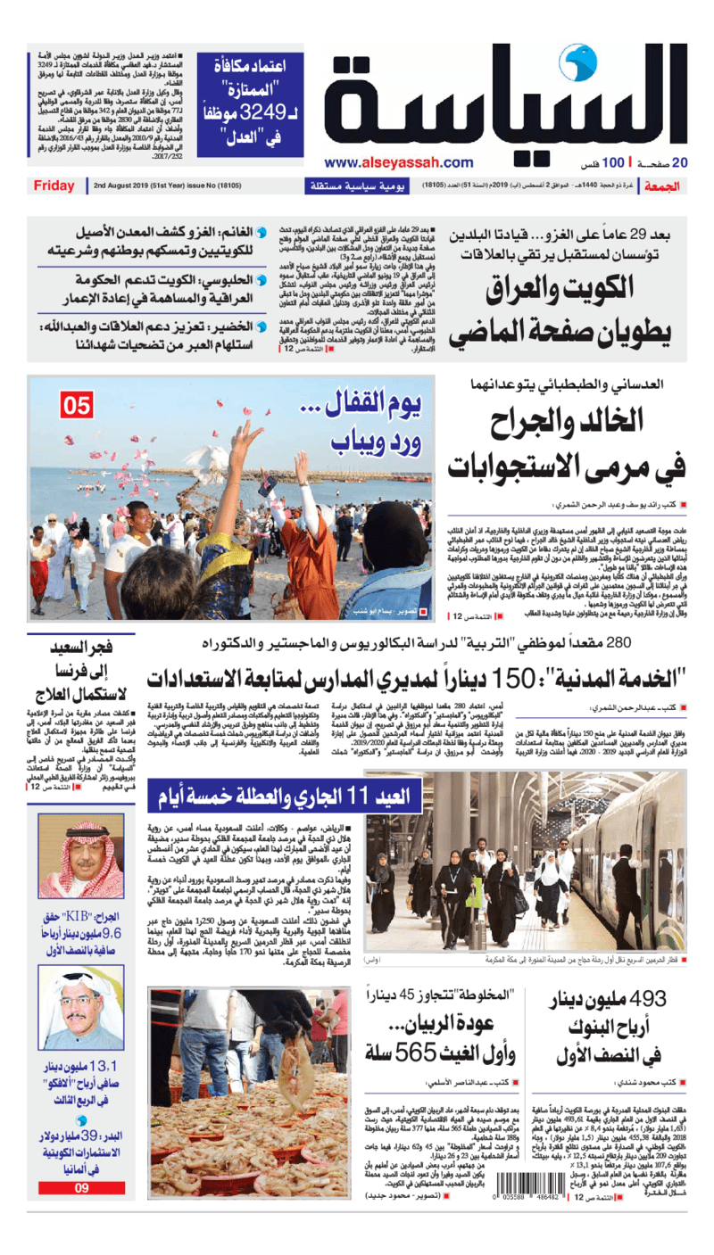 آخر الأخبار جرائم وقضايا “الجمارك” تضبط 29 ألف علبة مشروبات كحولية قادمة من دولة آسيوية في ميناء الشويخ 9 يونيو، 2024 محليات ممثلة عن دولة الكويت الطبيبة الكويتية أسماء الكندري تشارك في المؤتمر العالمي للمناظير في إيطاليا 8 يونيو، 2024 محليات “الصحة”: اكتمال وصول فريق الخدمات الطبية ببعثة الحج الكويتية لمكة المكرمة 8 يونيو، 2024 محليات “الصحة” تحدد 8 مراكز للصحة المدرسية لاستقبال الطلبة المبتعثين 8 يونيو، 2024 عربي وعالمي “الصحة العالمية”: تسجيل أول وفاة لشخص مصاب بـ«أنفلونزا الطيور» 7 يونيو، 2024 محليات عناوين الصحف الكويتية ليوم الجمعة 02 أغسطس 2019 محرر المحليات2 أغسطس، 2019أضف تعليق1 دقائق جريدة الجريدة جريدة الأنباء جريدة السياسة جريدة الوطن جريدة الراي جريدة النهار الوسومTop عناوين الصحف المحلية من الممكن أن يعجبك جرائم وقضايا “الجمارك” تضبط 29 ألف علبة مشروبات كحولية قادمة من دولة آسيوية في ميناء الشويخ محليات ممثلة عن دولة الكويت الطبيبة الكويتية أسماء الكندري تشارك في المؤتمر العالمي للمناظير في إيطاليا محليات “الصحة”: اكتمال وصول فريق الخدمات الطبية ببعثة الحج الكويتية لمكة المكرمة محليات “الصحة” تحدد 8 مراكز للصحة المدرسية لاستقبال الطلبة المبتعثين عربي وعالمي “الصحة العالمية”: تسجيل أول وفاة لشخص مصاب بـ«أنفلونزا الطيور» تكنولوجيا رش السحب بملح البحر.. تجربة “ثورية” لتبريد كوكب الأرض أضف تعليق أضغط هنا لإضافة تعليق إلغاء الردالتعليقالاسم البريد الإلكتروني الموقع الإلكتروني Δ هذا الموقع يستخدم خدمة أكيسميت للتقليل من البريد المزعجة. اعرف المزيد عن كيفية التعامل مع بيانات التعليقات الخاصة بك processed.