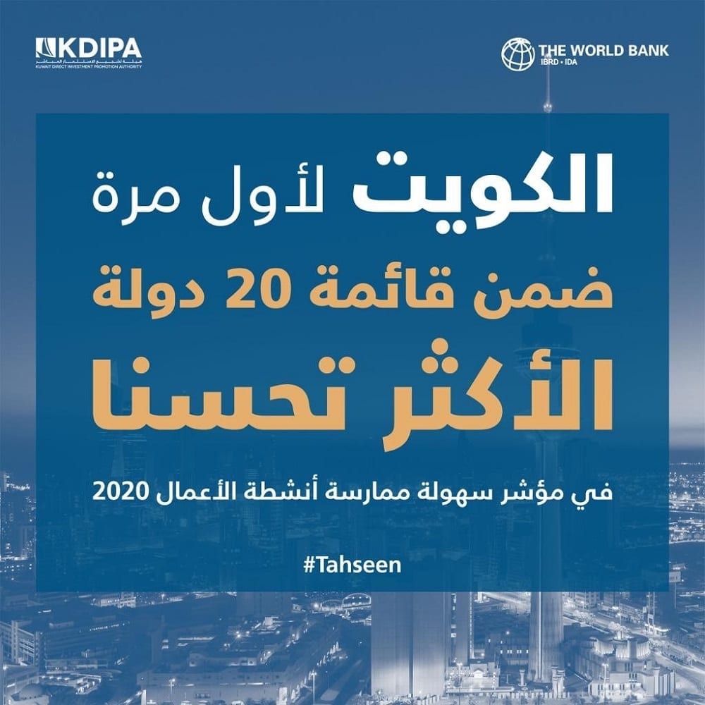 قالت هيئة تشجيع الاستثمار المباشر الكويتية اليوم الجمعة ان فريق تقرير الأعمال لدى مجموعة البنك الدولي اعلن أن “الكويت جاءت ولأول مرة ضمن قائمة 20 دولة الاكثر تحسنا في مؤشر سهولة ممارسة أنشطة الأعمال 2020 وذلك من أصل 190 دولة يضمها المؤشر الذي سيصدر في تقرير الاعمال 2020 بنهاية أكتوبر المقبل”.