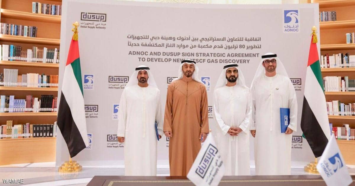 وقال الشيخ محمد بن راشد آل مكتوم نائب رئيس الدولة رئيس مجلس الوزراء حاكم دبي، في حسابه على موقع “تويتر”، إنه “شهد مع الشيخ محمد بن زايد ولي عهد أبوظبي نائب القائد الأعلى للقوات المسلحة، توقيع اتفاقية بين شركتي “أدنوك” و”دوساب” لتطوير أحد أكبر حقول الغاز المكتشفة بين إمارتي أبوظبي و دبي” .