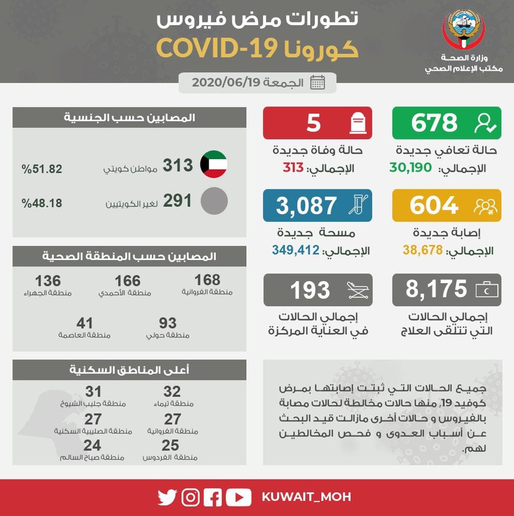 أعلنت وزارة الصحة الكويتية اليوم الجمعة تسجيل 604 إصابات جديدة بمرض كورونا المستجد (كوفيد 19) خلال ال24 ساعة الماضية ليرتفع بذلك إجمالي عدد الحالات المسجلة في البلاد إلى 38678 حالة في حين تم تسجيل 5 حالات وفاة إثر اصابتها بالمرض ليصبح مجموع حالات الوفاة المسجلة حتى اليوم 313 حالة.