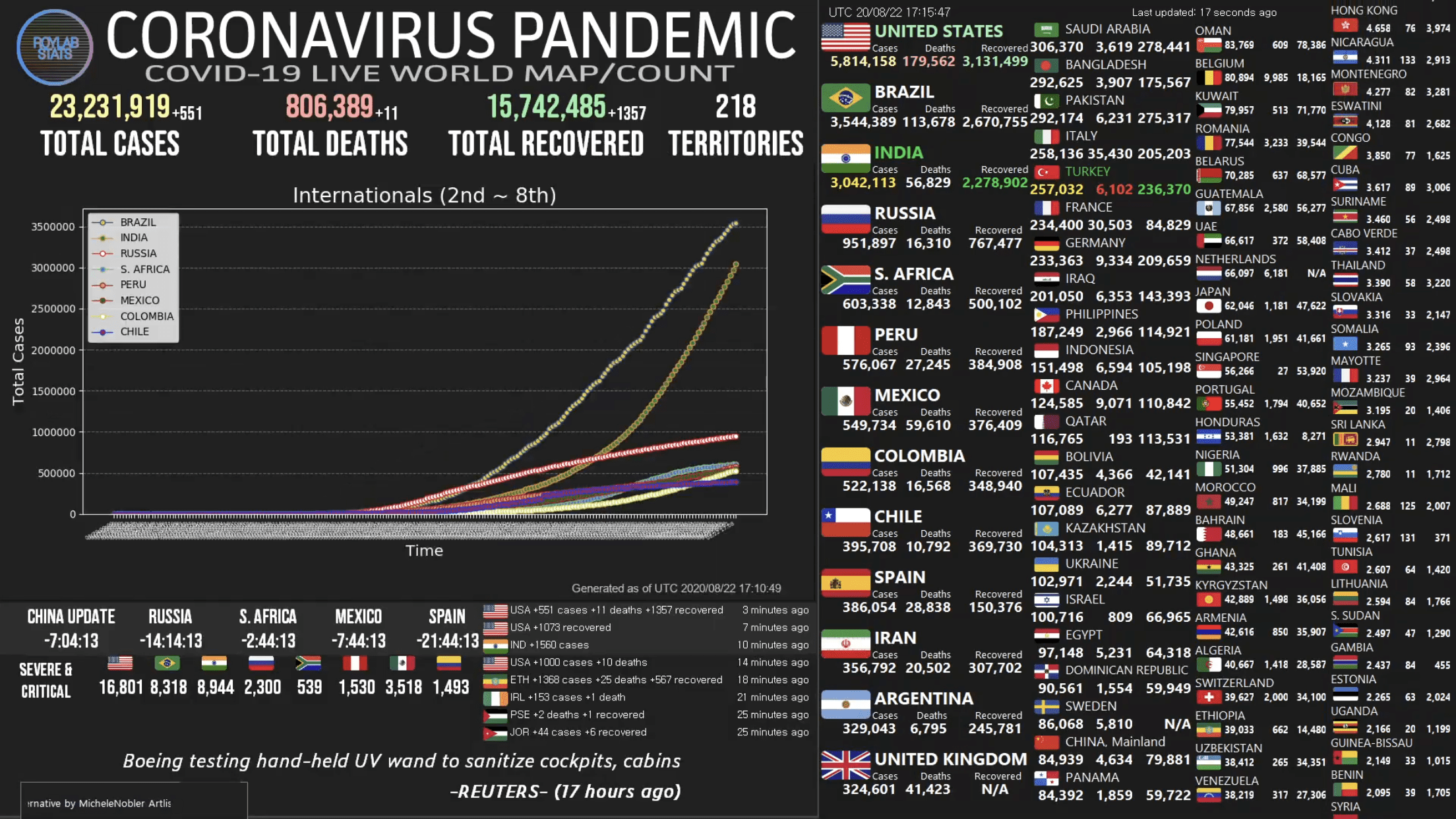 وبحسب حصيلة نشرها المركز التابع للجامعة والمتخصص برصد الجائحة محليا وعالميا سجلت 800283 وفاة ناجمة عن الاصابة بالفيروس حول العالم.