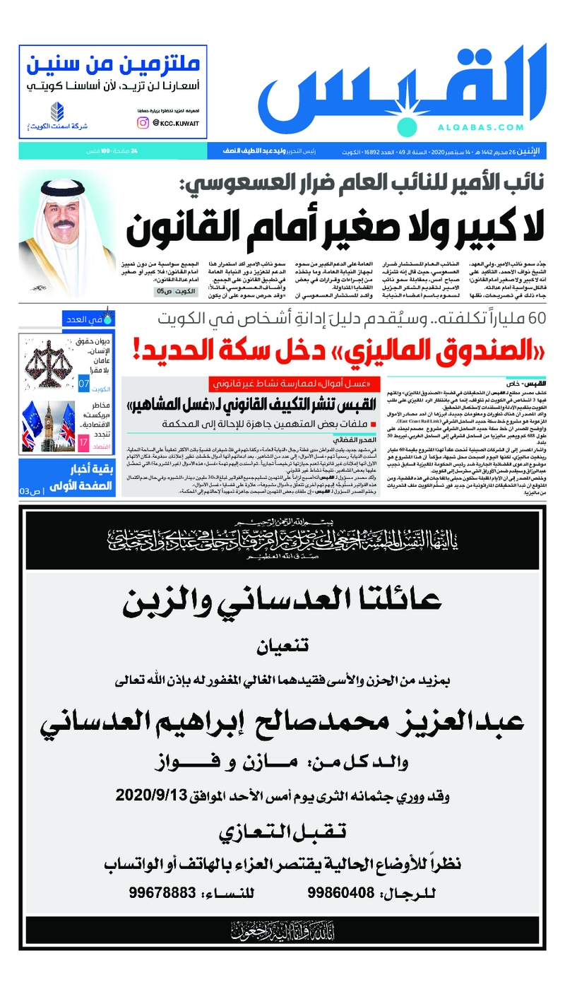 آخر الأخبار جرائم وقضايا “الجمارك” تضبط 29 ألف علبة مشروبات كحولية قادمة من دولة آسيوية في ميناء الشويخ 9 يونيو، 2024 محليات ممثلة عن دولة الكويت الطبيبة الكويتية أسماء الكندري تشارك في المؤتمر العالمي للمناظير في إيطاليا 8 يونيو، 2024 محليات “الصحة”: اكتمال وصول فريق الخدمات الطبية ببعثة الحج الكويتية لمكة المكرمة 8 يونيو، 2024 محليات “الصحة” تحدد 8 مراكز للصحة المدرسية لاستقبال الطلبة المبتعثين 8 يونيو، 2024 عربي وعالمي “الصحة العالمية”: تسجيل أول وفاة لشخص مصاب بـ«أنفلونزا الطيور» 7 يونيو، 2024 محليات عناوين الصحف الكويتية ليوم الاثنين 14 سبتمبر 2020 محرر المحليات14 سبتمبر، 2020أضف تعليق1 دقائق جريدة الجريدة جريدة الأنباء جريدة القبس جريدة الوطن جريدة الراي جريدة الوسط الوسومTop عناوين الصحف المحلية من الممكن أن يعجبك جرائم وقضايا “الجمارك” تضبط 29 ألف علبة مشروبات كحولية قادمة من دولة آسيوية في ميناء الشويخ محليات ممثلة عن دولة الكويت الطبيبة الكويتية أسماء الكندري تشارك في المؤتمر العالمي للمناظير في إيطاليا محليات “الصحة”: اكتمال وصول فريق الخدمات الطبية ببعثة الحج الكويتية لمكة المكرمة محليات “الصحة” تحدد 8 مراكز للصحة المدرسية لاستقبال الطلبة المبتعثين عربي وعالمي “الصحة العالمية”: تسجيل أول وفاة لشخص مصاب بـ«أنفلونزا الطيور» تكنولوجيا رش السحب بملح البحر.. تجربة “ثورية” لتبريد كوكب الأرض أضف تعليق أضغط هنا لإضافة تعليق إلغاء الردالتعليقالاسم البريد الإلكتروني الموقع الإلكتروني Δ هذا الموقع يستخدم خدمة أكيسميت للتقليل من البريد المزعجة. اعرف المزيد عن كيفية التعامل مع بيانات التعليقات الخاصة بك processed.
