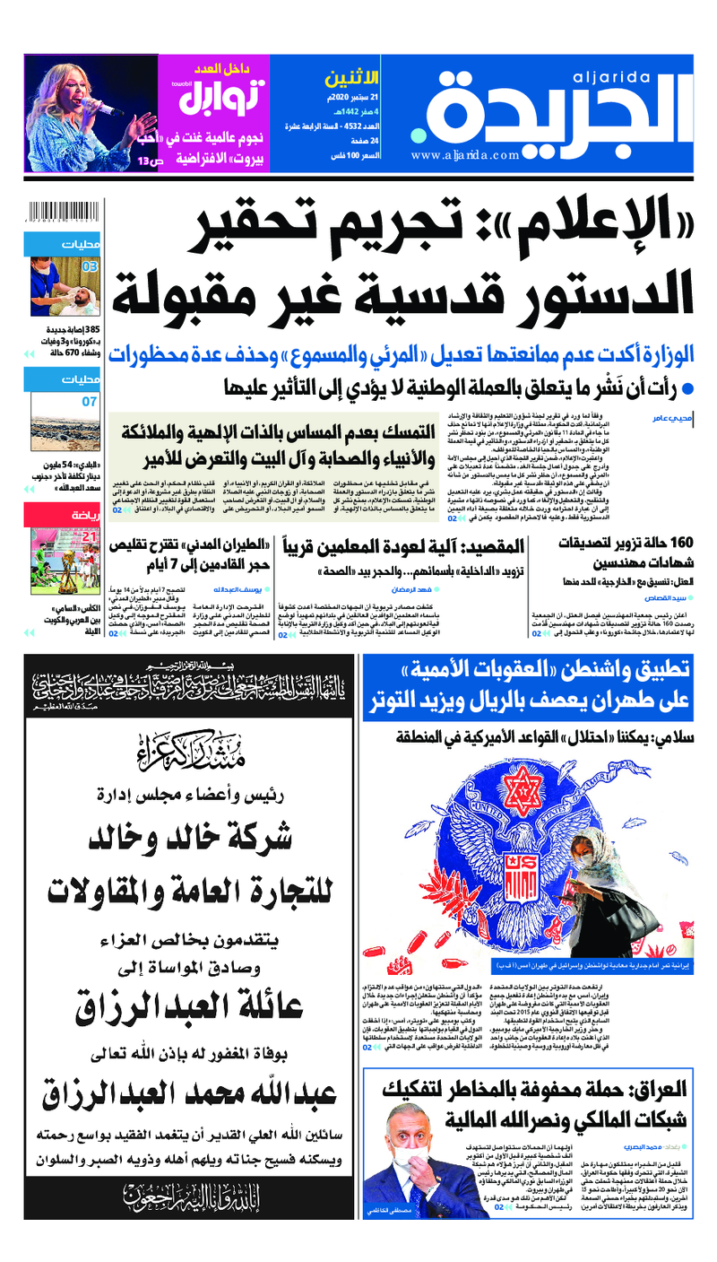 آخر الأخبار جرائم وقضايا “الجمارك” تضبط 29 ألف علبة مشروبات كحولية قادمة من دولة آسيوية في ميناء الشويخ 9 يونيو، 2024 محليات ممثلة عن دولة الكويت الطبيبة الكويتية أسماء الكندري تشارك في المؤتمر العالمي للمناظير في إيطاليا 8 يونيو، 2024 محليات “الصحة”: اكتمال وصول فريق الخدمات الطبية ببعثة الحج الكويتية لمكة المكرمة 8 يونيو، 2024 محليات “الصحة” تحدد 8 مراكز للصحة المدرسية لاستقبال الطلبة المبتعثين 8 يونيو، 2024 عربي وعالمي “الصحة العالمية”: تسجيل أول وفاة لشخص مصاب بـ«أنفلونزا الطيور» 7 يونيو، 2024 محليات عناوين الصحف الكويتية ليوم الاثنين 21 سبتمبر 2020 محرر المحليات21 سبتمبر، 2020أضف تعليق1 دقائق جريدة الجريدة جريدة الأنباء جريدة القبس جريدة الوطن جريدة الراي جريدة الوسط الوسومTop عناوين الصحف المحلية من الممكن أن يعجبك جرائم وقضايا “الجمارك” تضبط 29 ألف علبة مشروبات كحولية قادمة من دولة آسيوية في ميناء الشويخ محليات ممثلة عن دولة الكويت الطبيبة الكويتية أسماء الكندري تشارك في المؤتمر العالمي للمناظير في إيطاليا محليات “الصحة”: اكتمال وصول فريق الخدمات الطبية ببعثة الحج الكويتية لمكة المكرمة محليات “الصحة” تحدد 8 مراكز للصحة المدرسية لاستقبال الطلبة المبتعثين عربي وعالمي “الصحة العالمية”: تسجيل أول وفاة لشخص مصاب بـ«أنفلونزا الطيور» تكنولوجيا رش السحب بملح البحر.. تجربة “ثورية” لتبريد كوكب الأرض أضف تعليق أضغط هنا لإضافة تعليق إلغاء الردالتعليقالاسم البريد الإلكتروني الموقع الإلكتروني Δ هذا الموقع يستخدم خدمة أكيسميت للتقليل من البريد المزعجة. اعرف المزيد عن كيفية التعامل مع بيانات التعليقات الخاصة بك processed.
