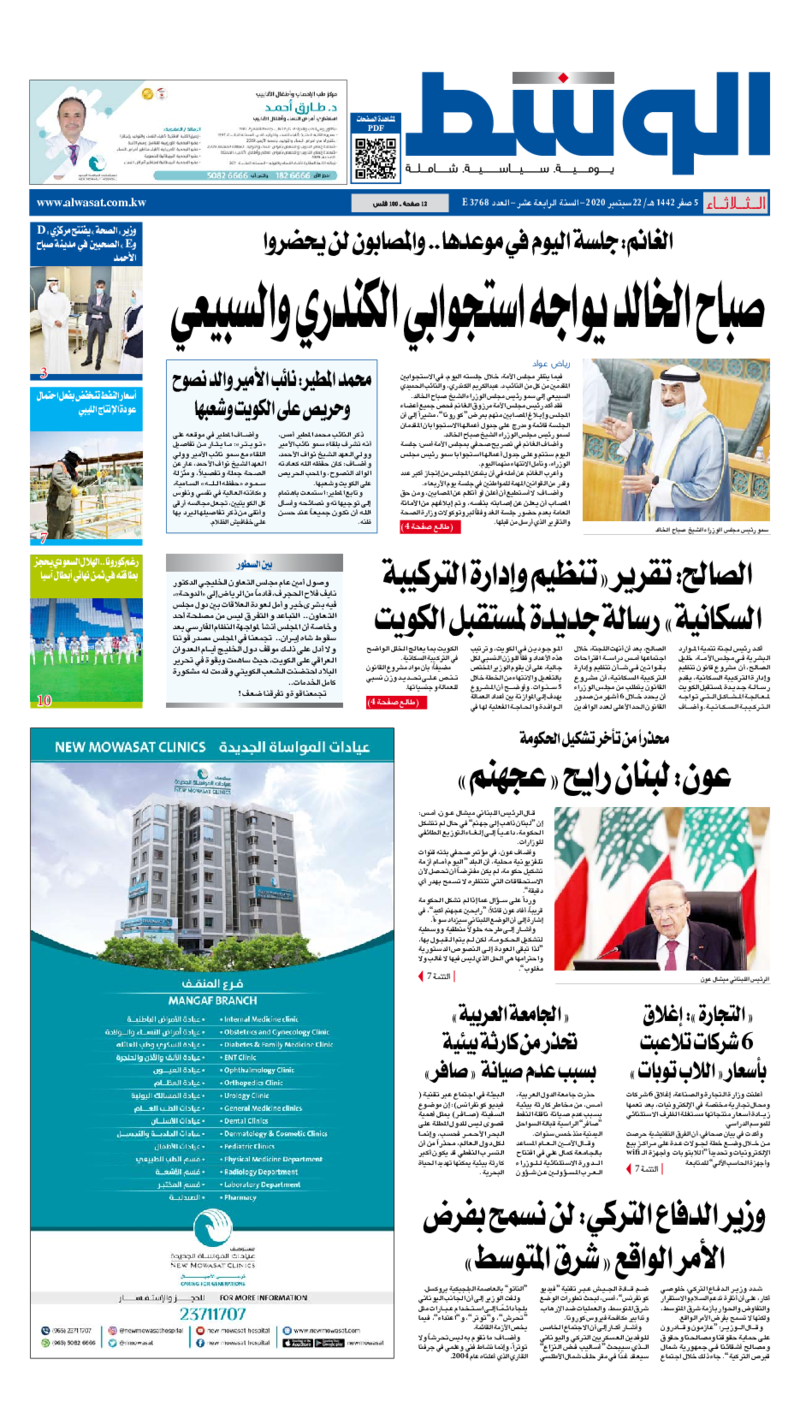 آخر الأخبار جرائم وقضايا “الجمارك” تضبط 29 ألف علبة مشروبات كحولية قادمة من دولة آسيوية في ميناء الشويخ 9 يونيو، 2024 محليات ممثلة عن دولة الكويت الطبيبة الكويتية أسماء الكندري تشارك في المؤتمر العالمي للمناظير في إيطاليا 8 يونيو، 2024 محليات “الصحة”: اكتمال وصول فريق الخدمات الطبية ببعثة الحج الكويتية لمكة المكرمة 8 يونيو، 2024 محليات “الصحة” تحدد 8 مراكز للصحة المدرسية لاستقبال الطلبة المبتعثين 8 يونيو، 2024 عربي وعالمي “الصحة العالمية”: تسجيل أول وفاة لشخص مصاب بـ«أنفلونزا الطيور» 7 يونيو، 2024 محليات عناوين الصحف الكويتية ليوم الثلاثاء 22 سبتمبر 2020 محرر المحليات22 سبتمبر، 2020أضف تعليق1 دقائق جريدة الجريدة جريدة الأنباء جريدة القبس جريدة الوطن جريدة الراي جريدة الوسط الوسومTop عناوين الصحف المحلية من الممكن أن يعجبك جرائم وقضايا “الجمارك” تضبط 29 ألف علبة مشروبات كحولية قادمة من دولة آسيوية في ميناء الشويخ محليات ممثلة عن دولة الكويت الطبيبة الكويتية أسماء الكندري تشارك في المؤتمر العالمي للمناظير في إيطاليا محليات “الصحة”: اكتمال وصول فريق الخدمات الطبية ببعثة الحج الكويتية لمكة المكرمة محليات “الصحة” تحدد 8 مراكز للصحة المدرسية لاستقبال الطلبة المبتعثين عربي وعالمي “الصحة العالمية”: تسجيل أول وفاة لشخص مصاب بـ«أنفلونزا الطيور» تكنولوجيا رش السحب بملح البحر.. تجربة “ثورية” لتبريد كوكب الأرض أضف تعليق أضغط هنا لإضافة تعليق إلغاء الردالتعليقالاسم البريد الإلكتروني الموقع الإلكتروني Δ هذا الموقع يستخدم خدمة أكيسميت للتقليل من البريد المزعجة. اعرف المزيد عن كيفية التعامل مع بيانات التعليقات الخاصة بك processed.
