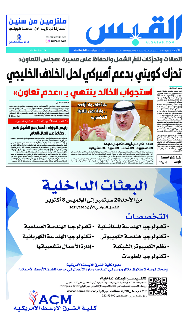آخر الأخبار جرائم وقضايا “الجمارك” تضبط 29 ألف علبة مشروبات كحولية قادمة من دولة آسيوية في ميناء الشويخ 9 يونيو، 2024 محليات ممثلة عن دولة الكويت الطبيبة الكويتية أسماء الكندري تشارك في المؤتمر العالمي للمناظير في إيطاليا 8 يونيو، 2024 محليات “الصحة”: اكتمال وصول فريق الخدمات الطبية ببعثة الحج الكويتية لمكة المكرمة 8 يونيو، 2024 محليات “الصحة” تحدد 8 مراكز للصحة المدرسية لاستقبال الطلبة المبتعثين 8 يونيو، 2024 عربي وعالمي “الصحة العالمية”: تسجيل أول وفاة لشخص مصاب بـ«أنفلونزا الطيور» 7 يونيو، 2024 محليات عناوين الصحف الكويتية ليوم الأربعاء 23 سبتمبر 2020 محرر المحليات23 سبتمبر، 2020أضف تعليق1 دقائق جريدة الجريدة جريدة الأنباء جريدة القبس جريدة الوطن جريدة الراي جريدة الوسط الوسومTop عناوين الصحف المحلية من الممكن أن يعجبك جرائم وقضايا “الجمارك” تضبط 29 ألف علبة مشروبات كحولية قادمة من دولة آسيوية في ميناء الشويخ محليات ممثلة عن دولة الكويت الطبيبة الكويتية أسماء الكندري تشارك في المؤتمر العالمي للمناظير في إيطاليا محليات “الصحة”: اكتمال وصول فريق الخدمات الطبية ببعثة الحج الكويتية لمكة المكرمة محليات “الصحة” تحدد 8 مراكز للصحة المدرسية لاستقبال الطلبة المبتعثين عربي وعالمي “الصحة العالمية”: تسجيل أول وفاة لشخص مصاب بـ«أنفلونزا الطيور» تكنولوجيا رش السحب بملح البحر.. تجربة “ثورية” لتبريد كوكب الأرض أضف تعليق أضغط هنا لإضافة تعليق إلغاء الردالتعليقالاسم البريد الإلكتروني الموقع الإلكتروني Δ هذا الموقع يستخدم خدمة أكيسميت للتقليل من البريد المزعجة. اعرف المزيد عن كيفية التعامل مع بيانات التعليقات الخاصة بك processed.
