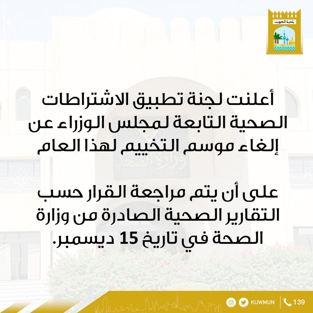 أعلنت بلدية الكويت اليوم الخميس إلغاء موسم التخييم الربيعي هذا العام استنادا إلى التقارير الصحية لوزارة الصحة التي أوصت بالالغاء حفاظا على سلامة المواطنين بسبب انتشار وباء كورونا المستجد (كوفيد 19).