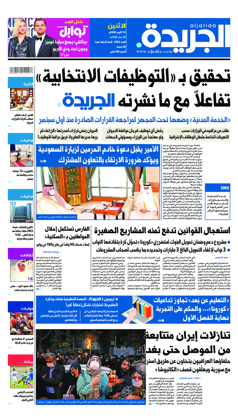 آخر الأخبار جرائم وقضايا “الجمارك” تضبط 29 ألف علبة مشروبات كحولية قادمة من دولة آسيوية في ميناء الشويخ 9 يونيو، 2024 محليات ممثلة عن دولة الكويت الطبيبة الكويتية أسماء الكندري تشارك في المؤتمر العالمي للمناظير في إيطاليا 8 يونيو، 2024 محليات “الصحة”: اكتمال وصول فريق الخدمات الطبية ببعثة الحج الكويتية لمكة المكرمة 8 يونيو، 2024 محليات “الصحة” تحدد 8 مراكز للصحة المدرسية لاستقبال الطلبة المبتعثين 8 يونيو، 2024 عربي وعالمي “الصحة العالمية”: تسجيل أول وفاة لشخص مصاب بـ«أنفلونزا الطيور» 7 يونيو، 2024 محليات عناوين الصحف الكويتية ليوم الاثنين 12 أكتوبر 2020 محرر المحليات12 أكتوبر، 2020أضف تعليق1 دقائق جريدة الجريدة جريدة الأنباء جريدة القبس جريدة الوسط الوسومTop عناوين الصحف المحلية من الممكن أن يعجبك جرائم وقضايا “الجمارك” تضبط 29 ألف علبة مشروبات كحولية قادمة من دولة آسيوية في ميناء الشويخ محليات ممثلة عن دولة الكويت الطبيبة الكويتية أسماء الكندري تشارك في المؤتمر العالمي للمناظير في إيطاليا محليات “الصحة”: اكتمال وصول فريق الخدمات الطبية ببعثة الحج الكويتية لمكة المكرمة محليات “الصحة” تحدد 8 مراكز للصحة المدرسية لاستقبال الطلبة المبتعثين عربي وعالمي “الصحة العالمية”: تسجيل أول وفاة لشخص مصاب بـ«أنفلونزا الطيور» تكنولوجيا رش السحب بملح البحر.. تجربة “ثورية” لتبريد كوكب الأرض أضف تعليق أضغط هنا لإضافة تعليق إلغاء الردالتعليقالاسم البريد الإلكتروني الموقع الإلكتروني Δ هذا الموقع يستخدم خدمة أكيسميت للتقليل من البريد المزعجة. اعرف المزيد عن كيفية التعامل مع بيانات التعليقات الخاصة بك processed.