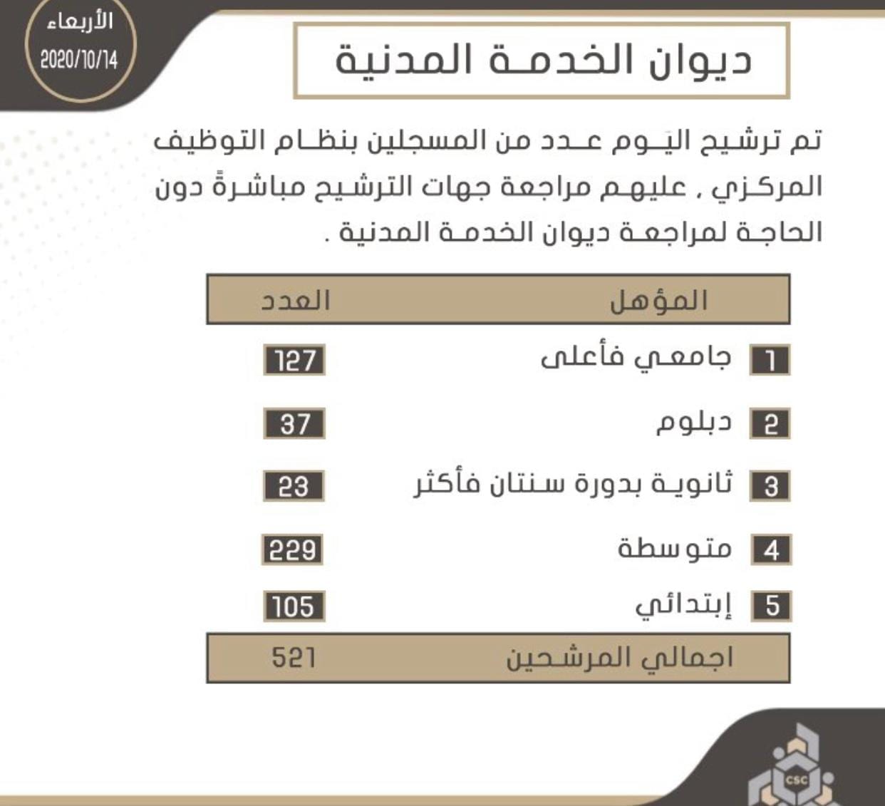 اعلن ديوان الخدمة المدنية عن ترشيـح 521 مواطناً ومواطنة من المسجلين بنظام التوظيف المركزي للعمل.