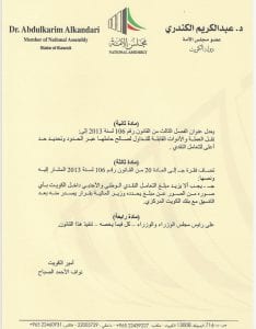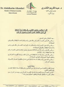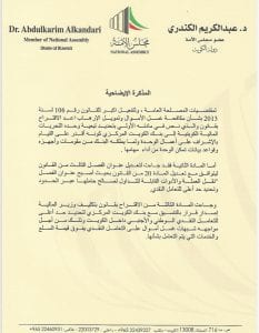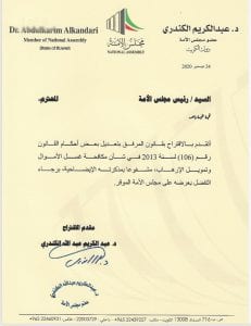 تقدّم النائب د. عبدالكريم الكندري، باقتراح بقانون لتعديل قانون غسيل الأموال ١٠٦ /٢٠١٣ بإلحاق تبعية وحدة التحريات بالبنك المركزي لزيادة فعالية الأجهزة الرقابية وتوحيدها بدلاً من تضاربها وكذلك بتعديل يضع سقفاً للتعامل النقدي الوطني والأجنبي داخل الكويت لمحاصرة جرائم غسيل الأموال.
