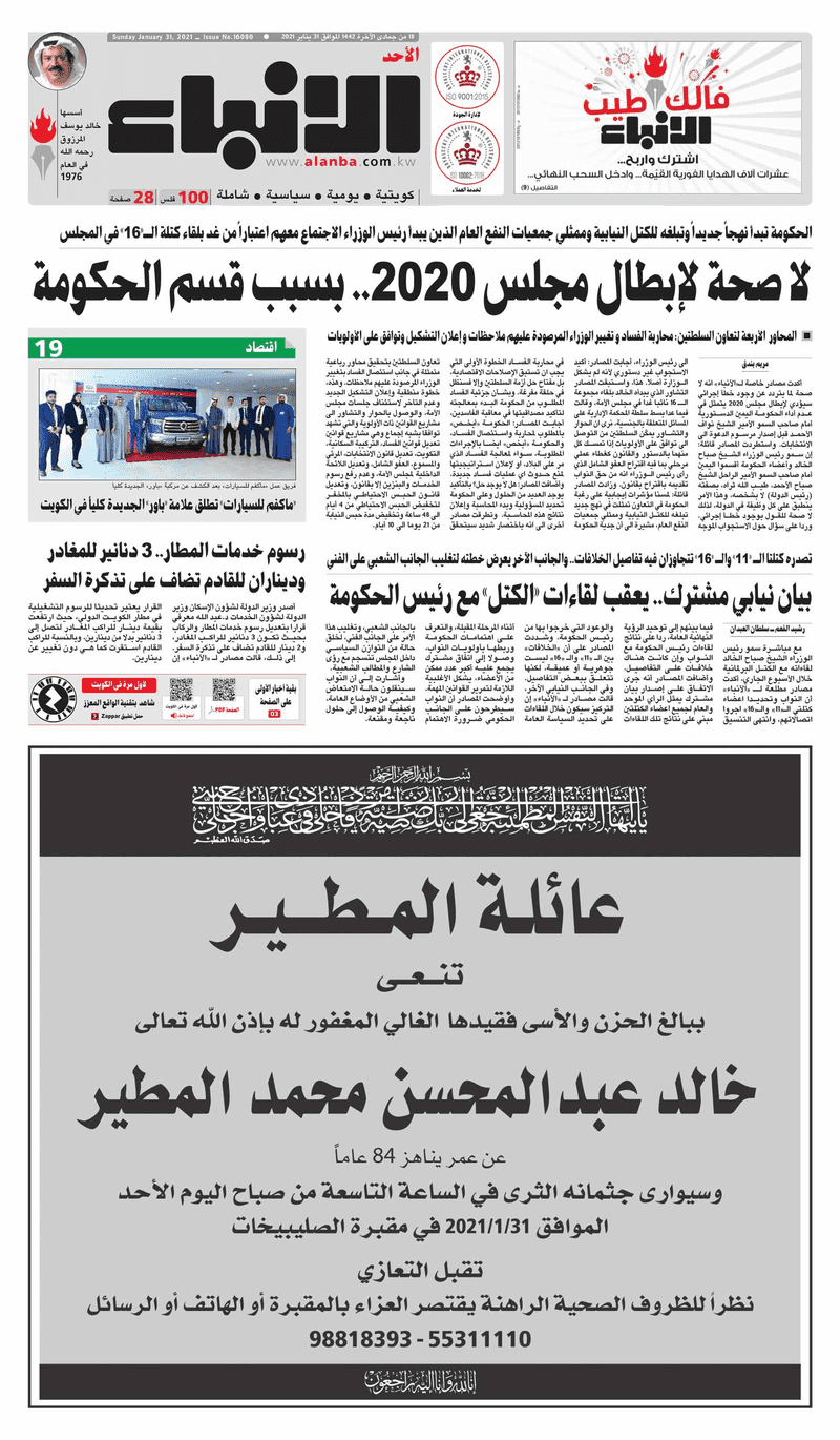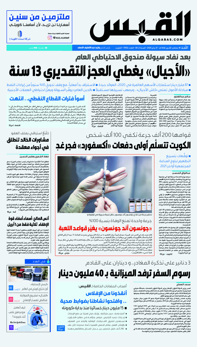 عناوين الصحف الكويتية ليوم الأحد 31 يناير 2021