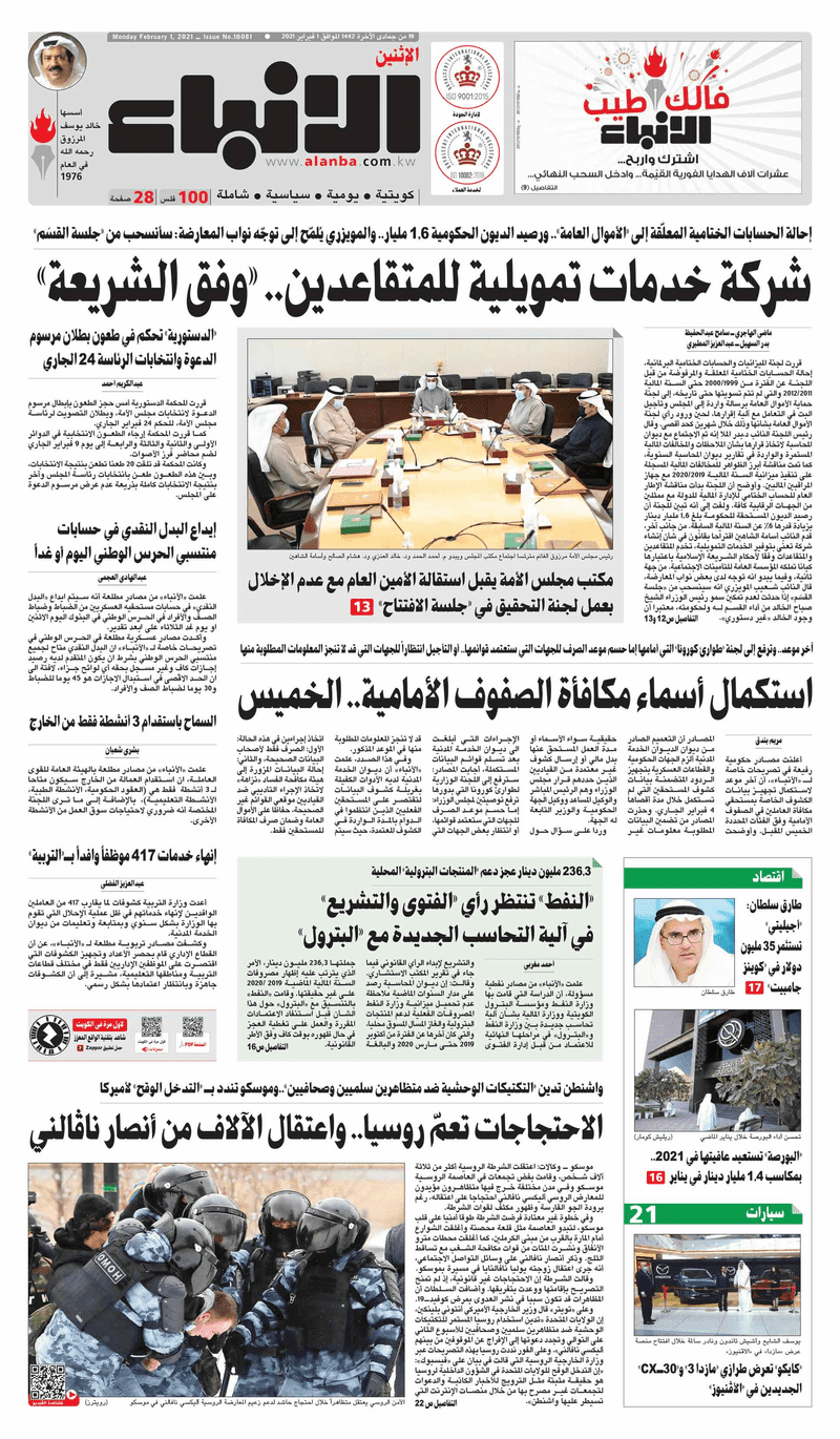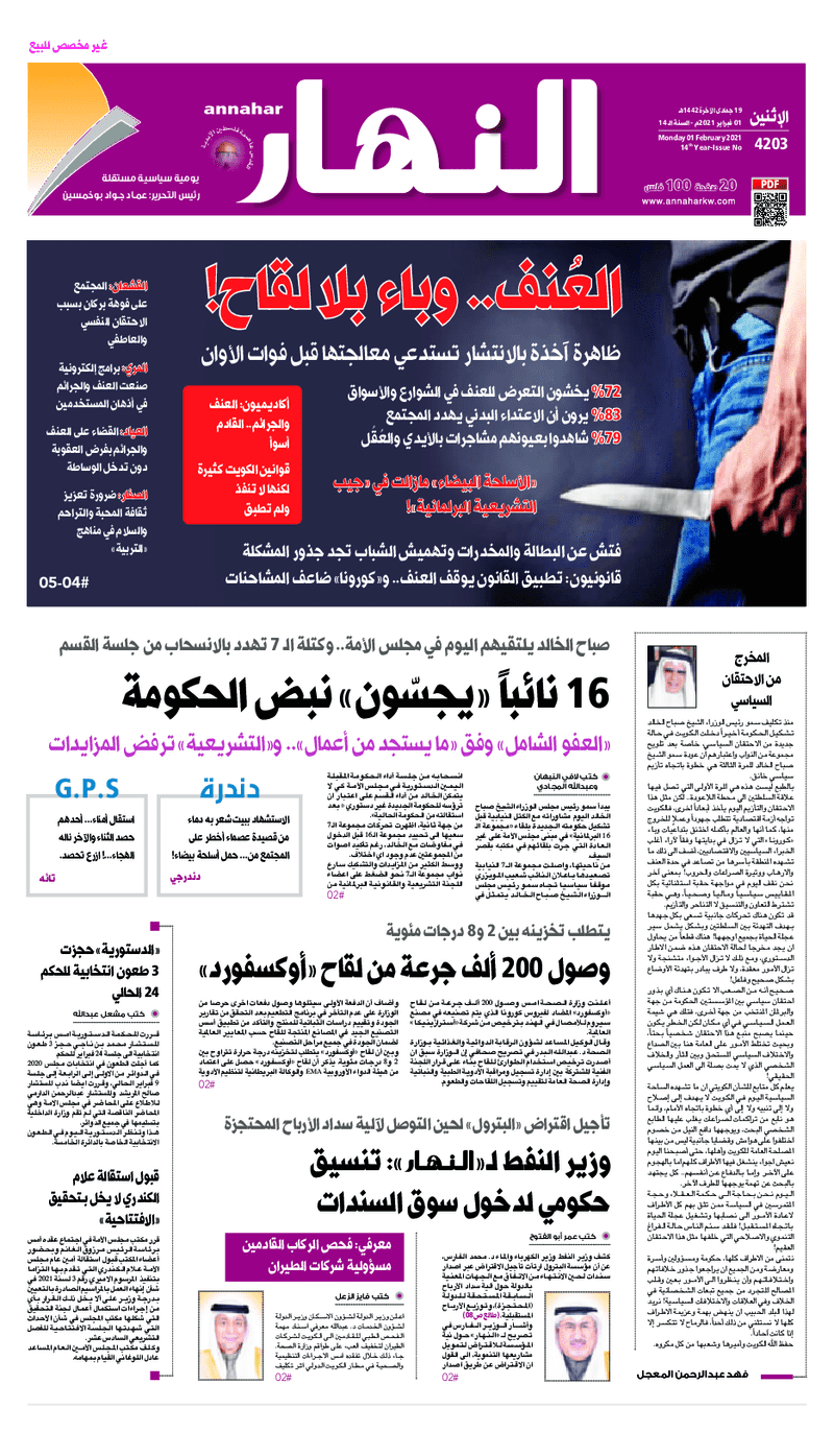 آخر الأخبار جرائم وقضايا “الجمارك” تضبط 29 ألف علبة مشروبات كحولية قادمة من دولة آسيوية في ميناء الشويخ 9 يونيو، 2024 محليات ممثلة عن دولة الكويت الطبيبة الكويتية أسماء الكندري تشارك في المؤتمر العالمي للمناظير في إيطاليا 8 يونيو، 2024 محليات “الصحة”: اكتمال وصول فريق الخدمات الطبية ببعثة الحج الكويتية لمكة المكرمة 8 يونيو، 2024 محليات “الصحة” تحدد 8 مراكز للصحة المدرسية لاستقبال الطلبة المبتعثين 8 يونيو، 2024 عربي وعالمي “الصحة العالمية”: تسجيل أول وفاة لشخص مصاب بـ«أنفلونزا الطيور» 7 يونيو، 2024 محليات عناوين الصحف الكويتية ليوم الاثنين 01 فبراير 2021 محرر المحليات1 فبراير، 2021أضف تعليق1 دقائق جريدة الجريدة جريدة الأنباء جريدة القبس جريدة الراي جريدة الوسط جريدة النهار الوسومTop عناوين الصحف المحلية من الممكن أن يعجبك جرائم وقضايا “الجمارك” تضبط 29 ألف علبة مشروبات كحولية قادمة من دولة آسيوية في ميناء الشويخ محليات ممثلة عن دولة الكويت الطبيبة الكويتية أسماء الكندري تشارك في المؤتمر العالمي للمناظير في إيطاليا محليات “الصحة”: اكتمال وصول فريق الخدمات الطبية ببعثة الحج الكويتية لمكة المكرمة محليات “الصحة” تحدد 8 مراكز للصحة المدرسية لاستقبال الطلبة المبتعثين عربي وعالمي “الصحة العالمية”: تسجيل أول وفاة لشخص مصاب بـ«أنفلونزا الطيور» تكنولوجيا رش السحب بملح البحر.. تجربة “ثورية” لتبريد كوكب الأرض أضف تعليق أضغط هنا لإضافة تعليق إلغاء الردالتعليقالاسم البريد الإلكتروني الموقع الإلكتروني Δ هذا الموقع يستخدم خدمة أكيسميت للتقليل من البريد المزعجة. اعرف المزيد عن كيفية التعامل مع بيانات التعليقات الخاصة بك processed.
