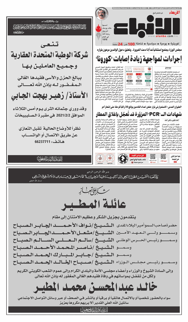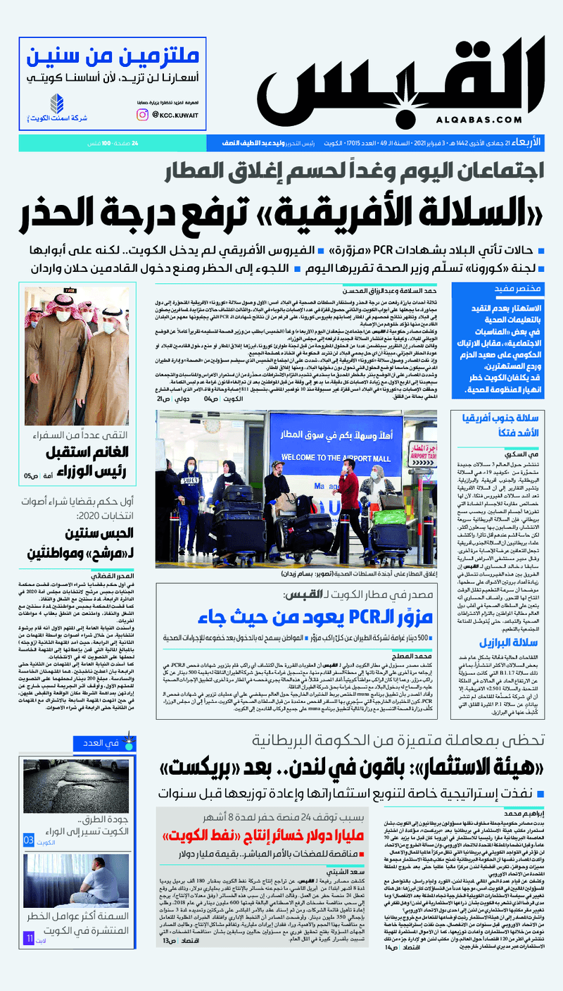 آخر الأخبار جرائم وقضايا “الجمارك” تضبط 29 ألف علبة مشروبات كحولية قادمة من دولة آسيوية في ميناء الشويخ 9 يونيو، 2024 محليات ممثلة عن دولة الكويت الطبيبة الكويتية أسماء الكندري تشارك في المؤتمر العالمي للمناظير في إيطاليا 8 يونيو، 2024 محليات “الصحة”: اكتمال وصول فريق الخدمات الطبية ببعثة الحج الكويتية لمكة المكرمة 8 يونيو، 2024 محليات “الصحة” تحدد 8 مراكز للصحة المدرسية لاستقبال الطلبة المبتعثين 8 يونيو، 2024 عربي وعالمي “الصحة العالمية”: تسجيل أول وفاة لشخص مصاب بـ«أنفلونزا الطيور» 7 يونيو، 2024 محليات عناوين الصحف الكويتية ليوم الأربعاء 03 فبراير 2021 محرر المحليات3 فبراير، 2021أضف تعليق1 دقائق جريدة الجريدة جريدة الأنباء جريدة القبس جريدة الراي جريدة الوسط الوسومTop عناوين الصحف المحلية من الممكن أن يعجبك جرائم وقضايا “الجمارك” تضبط 29 ألف علبة مشروبات كحولية قادمة من دولة آسيوية في ميناء الشويخ محليات ممثلة عن دولة الكويت الطبيبة الكويتية أسماء الكندري تشارك في المؤتمر العالمي للمناظير في إيطاليا محليات “الصحة”: اكتمال وصول فريق الخدمات الطبية ببعثة الحج الكويتية لمكة المكرمة محليات “الصحة” تحدد 8 مراكز للصحة المدرسية لاستقبال الطلبة المبتعثين عربي وعالمي “الصحة العالمية”: تسجيل أول وفاة لشخص مصاب بـ«أنفلونزا الطيور» تكنولوجيا رش السحب بملح البحر.. تجربة “ثورية” لتبريد كوكب الأرض أضف تعليق أضغط هنا لإضافة تعليق إلغاء الردالتعليقالاسم البريد الإلكتروني الموقع الإلكتروني Δ هذا الموقع يستخدم خدمة أكيسميت للتقليل من البريد المزعجة. اعرف المزيد عن كيفية التعامل مع بيانات التعليقات الخاصة بك processed.