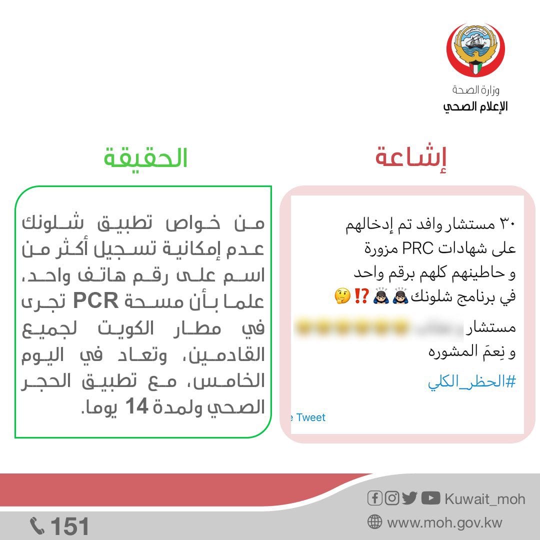 وقالت الوزارة في بيان صحافي إن من خواص تطبيق «شلونك» عدم إمكانية تسجيل أكثر من اسم على رقم هاتف واحد، علما بأن مسحة «PCR» تجرى في مطار الكويت لجميع القادمين، وتعاد في اليوم الخامس، مع تطبيق الحجر الصحي ولمدة 14 يوماً.