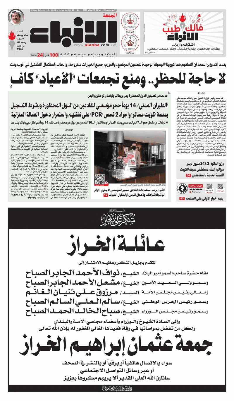 آخر الأخبار جرائم وقضايا “الجمارك” تضبط 29 ألف علبة مشروبات كحولية قادمة من دولة آسيوية في ميناء الشويخ 9 يونيو، 2024 محليات ممثلة عن دولة الكويت الطبيبة الكويتية أسماء الكندري تشارك في المؤتمر العالمي للمناظير في إيطاليا 8 يونيو، 2024 محليات “الصحة”: اكتمال وصول فريق الخدمات الطبية ببعثة الحج الكويتية لمكة المكرمة 8 يونيو، 2024 محليات “الصحة” تحدد 8 مراكز للصحة المدرسية لاستقبال الطلبة المبتعثين 8 يونيو، 2024 عربي وعالمي “الصحة العالمية”: تسجيل أول وفاة لشخص مصاب بـ«أنفلونزا الطيور» 7 يونيو، 2024 محليات عناوين الصحف الكويتية ليوم الجمعة 19 فبراير 2021 محرر المحليات19 فبراير، 2021أضف تعليق1 دقائق جريدة الجريدة جريدة الأنباء جريدة القبس جريدة الراي الوسومTop عناوين الصحف المحلية من الممكن أن يعجبك جرائم وقضايا “الجمارك” تضبط 29 ألف علبة مشروبات كحولية قادمة من دولة آسيوية في ميناء الشويخ محليات ممثلة عن دولة الكويت الطبيبة الكويتية أسماء الكندري تشارك في المؤتمر العالمي للمناظير في إيطاليا محليات “الصحة”: اكتمال وصول فريق الخدمات الطبية ببعثة الحج الكويتية لمكة المكرمة محليات “الصحة” تحدد 8 مراكز للصحة المدرسية لاستقبال الطلبة المبتعثين عربي وعالمي “الصحة العالمية”: تسجيل أول وفاة لشخص مصاب بـ«أنفلونزا الطيور» تكنولوجيا رش السحب بملح البحر.. تجربة “ثورية” لتبريد كوكب الأرض أضف تعليق أضغط هنا لإضافة تعليق إلغاء الردالتعليقالاسم البريد الإلكتروني الموقع الإلكتروني Δ هذا الموقع يستخدم خدمة أكيسميت للتقليل من البريد المزعجة. اعرف المزيد عن كيفية التعامل مع بيانات التعليقات الخاصة بك processed.
