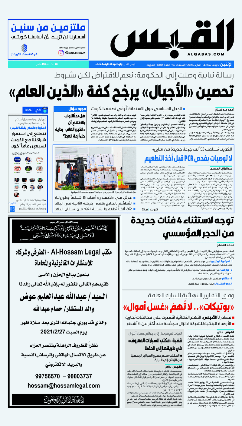 آخر الأخبار جرائم وقضايا “الجمارك” تضبط 29 ألف علبة مشروبات كحولية قادمة من دولة آسيوية في ميناء الشويخ 9 يونيو، 2024 محليات ممثلة عن دولة الكويت الطبيبة الكويتية أسماء الكندري تشارك في المؤتمر العالمي للمناظير في إيطاليا 8 يونيو، 2024 محليات “الصحة”: اكتمال وصول فريق الخدمات الطبية ببعثة الحج الكويتية لمكة المكرمة 8 يونيو، 2024 محليات “الصحة” تحدد 8 مراكز للصحة المدرسية لاستقبال الطلبة المبتعثين 8 يونيو، 2024 عربي وعالمي “الصحة العالمية”: تسجيل أول وفاة لشخص مصاب بـ«أنفلونزا الطيور» 7 يونيو، 2024 محليات عناوين الصحف الكويتية ليوم الاثنين 01 مارس 2021 محرر المحليات1 مارس، 2021أضف تعليق1 دقائق جريدة الجريدة جريدة الأنباء جريدة القبس جريدة الراي جريدة الوسط جريدة النهار الوسومTop عناوين الصحف المحلية من الممكن أن يعجبك جرائم وقضايا “الجمارك” تضبط 29 ألف علبة مشروبات كحولية قادمة من دولة آسيوية في ميناء الشويخ محليات ممثلة عن دولة الكويت الطبيبة الكويتية أسماء الكندري تشارك في المؤتمر العالمي للمناظير في إيطاليا محليات “الصحة”: اكتمال وصول فريق الخدمات الطبية ببعثة الحج الكويتية لمكة المكرمة محليات “الصحة” تحدد 8 مراكز للصحة المدرسية لاستقبال الطلبة المبتعثين عربي وعالمي “الصحة العالمية”: تسجيل أول وفاة لشخص مصاب بـ«أنفلونزا الطيور» تكنولوجيا رش السحب بملح البحر.. تجربة “ثورية” لتبريد كوكب الأرض أضف تعليق أضغط هنا لإضافة تعليق إلغاء الردالتعليقالاسم البريد الإلكتروني الموقع الإلكتروني Δ هذا الموقع يستخدم خدمة أكيسميت للتقليل من البريد المزعجة. اعرف المزيد عن كيفية التعامل مع بيانات التعليقات الخاصة بك processed.