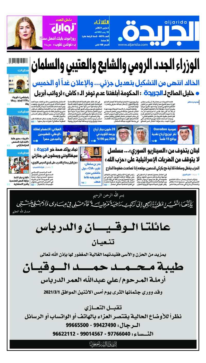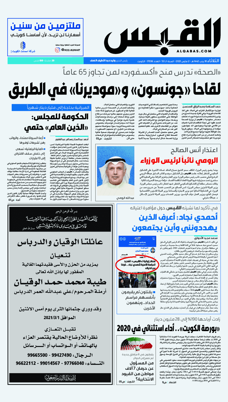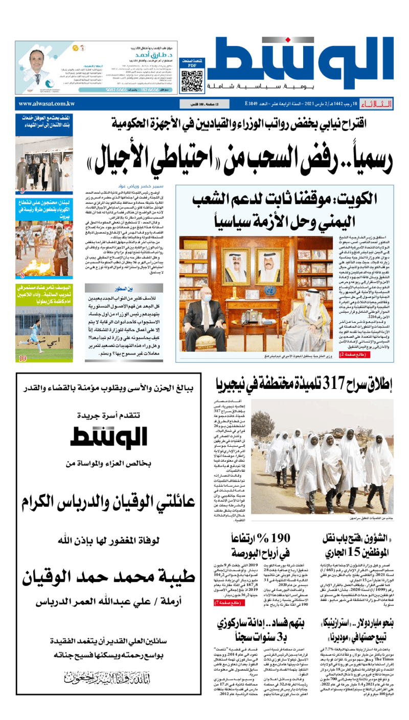 آخر الأخبار جرائم وقضايا “الجمارك” تضبط 29 ألف علبة مشروبات كحولية قادمة من دولة آسيوية في ميناء الشويخ 9 يونيو، 2024 محليات ممثلة عن دولة الكويت الطبيبة الكويتية أسماء الكندري تشارك في المؤتمر العالمي للمناظير في إيطاليا 8 يونيو، 2024 محليات “الصحة”: اكتمال وصول فريق الخدمات الطبية ببعثة الحج الكويتية لمكة المكرمة 8 يونيو، 2024 محليات “الصحة” تحدد 8 مراكز للصحة المدرسية لاستقبال الطلبة المبتعثين 8 يونيو، 2024 عربي وعالمي “الصحة العالمية”: تسجيل أول وفاة لشخص مصاب بـ«أنفلونزا الطيور» 7 يونيو، 2024 محليات عناوين الصحف الكويتية ليوم الثلاثاء 02 مارس 2021 محرر المحليات2 مارس، 2021أضف تعليق1 دقائق جريدة الجريدة جريدة الأنباء جريدة القبس جريدة الراي جريدة الوسط جريدة النهار الوسومTop عناوين الصحف المحلية من الممكن أن يعجبك جرائم وقضايا “الجمارك” تضبط 29 ألف علبة مشروبات كحولية قادمة من دولة آسيوية في ميناء الشويخ محليات ممثلة عن دولة الكويت الطبيبة الكويتية أسماء الكندري تشارك في المؤتمر العالمي للمناظير في إيطاليا محليات “الصحة”: اكتمال وصول فريق الخدمات الطبية ببعثة الحج الكويتية لمكة المكرمة محليات “الصحة” تحدد 8 مراكز للصحة المدرسية لاستقبال الطلبة المبتعثين عربي وعالمي “الصحة العالمية”: تسجيل أول وفاة لشخص مصاب بـ«أنفلونزا الطيور» تكنولوجيا رش السحب بملح البحر.. تجربة “ثورية” لتبريد كوكب الأرض أضف تعليق أضغط هنا لإضافة تعليق إلغاء الردالتعليقالاسم البريد الإلكتروني الموقع الإلكتروني Δ هذا الموقع يستخدم خدمة أكيسميت للتقليل من البريد المزعجة. اعرف المزيد عن كيفية التعامل مع بيانات التعليقات الخاصة بك processed.