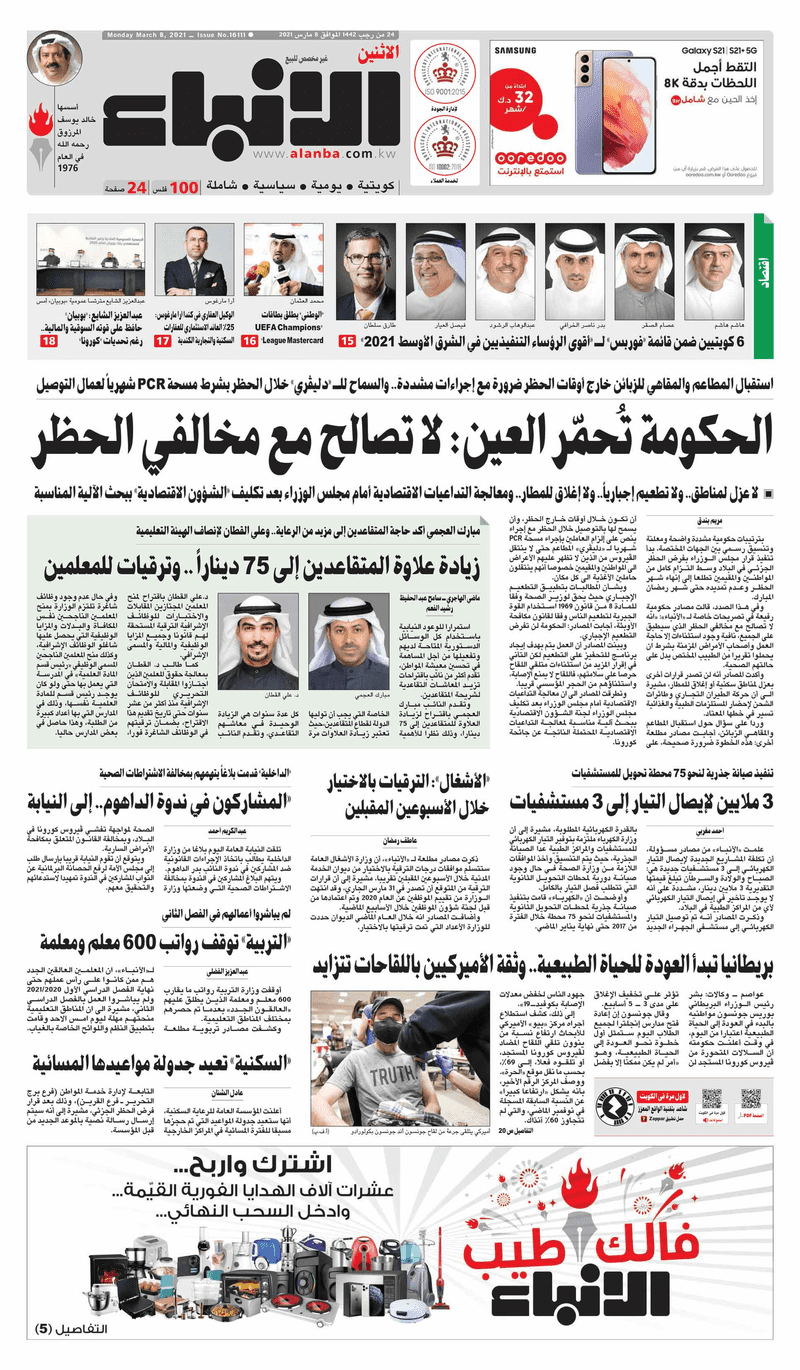 آخر الأخبار جرائم وقضايا “الجمارك” تضبط 29 ألف علبة مشروبات كحولية قادمة من دولة آسيوية في ميناء الشويخ 9 يونيو، 2024 محليات ممثلة عن دولة الكويت الطبيبة الكويتية أسماء الكندري تشارك في المؤتمر العالمي للمناظير في إيطاليا 8 يونيو، 2024 محليات “الصحة”: اكتمال وصول فريق الخدمات الطبية ببعثة الحج الكويتية لمكة المكرمة 8 يونيو، 2024 محليات “الصحة” تحدد 8 مراكز للصحة المدرسية لاستقبال الطلبة المبتعثين 8 يونيو، 2024 عربي وعالمي “الصحة العالمية”: تسجيل أول وفاة لشخص مصاب بـ«أنفلونزا الطيور» 7 يونيو، 2024 محليات عناوين الصحف الكويتية ليوم الاثنين 08 مارس 2021 محرر المحليات8 مارس، 2021أضف تعليق1 دقائق جريدة الجريدة جريدة الأنباء جريدة القبس جريدة الراي جريدة الوسط جريدة النهار الوسومTop عناوين الصحف المحلية من الممكن أن يعجبك جرائم وقضايا “الجمارك” تضبط 29 ألف علبة مشروبات كحولية قادمة من دولة آسيوية في ميناء الشويخ محليات ممثلة عن دولة الكويت الطبيبة الكويتية أسماء الكندري تشارك في المؤتمر العالمي للمناظير في إيطاليا محليات “الصحة”: اكتمال وصول فريق الخدمات الطبية ببعثة الحج الكويتية لمكة المكرمة محليات “الصحة” تحدد 8 مراكز للصحة المدرسية لاستقبال الطلبة المبتعثين عربي وعالمي “الصحة العالمية”: تسجيل أول وفاة لشخص مصاب بـ«أنفلونزا الطيور» تكنولوجيا رش السحب بملح البحر.. تجربة “ثورية” لتبريد كوكب الأرض أضف تعليق أضغط هنا لإضافة تعليق إلغاء الردالتعليقالاسم البريد الإلكتروني الموقع الإلكتروني Δ هذا الموقع يستخدم خدمة أكيسميت للتقليل من البريد المزعجة. اعرف المزيد عن كيفية التعامل مع بيانات التعليقات الخاصة بك processed.