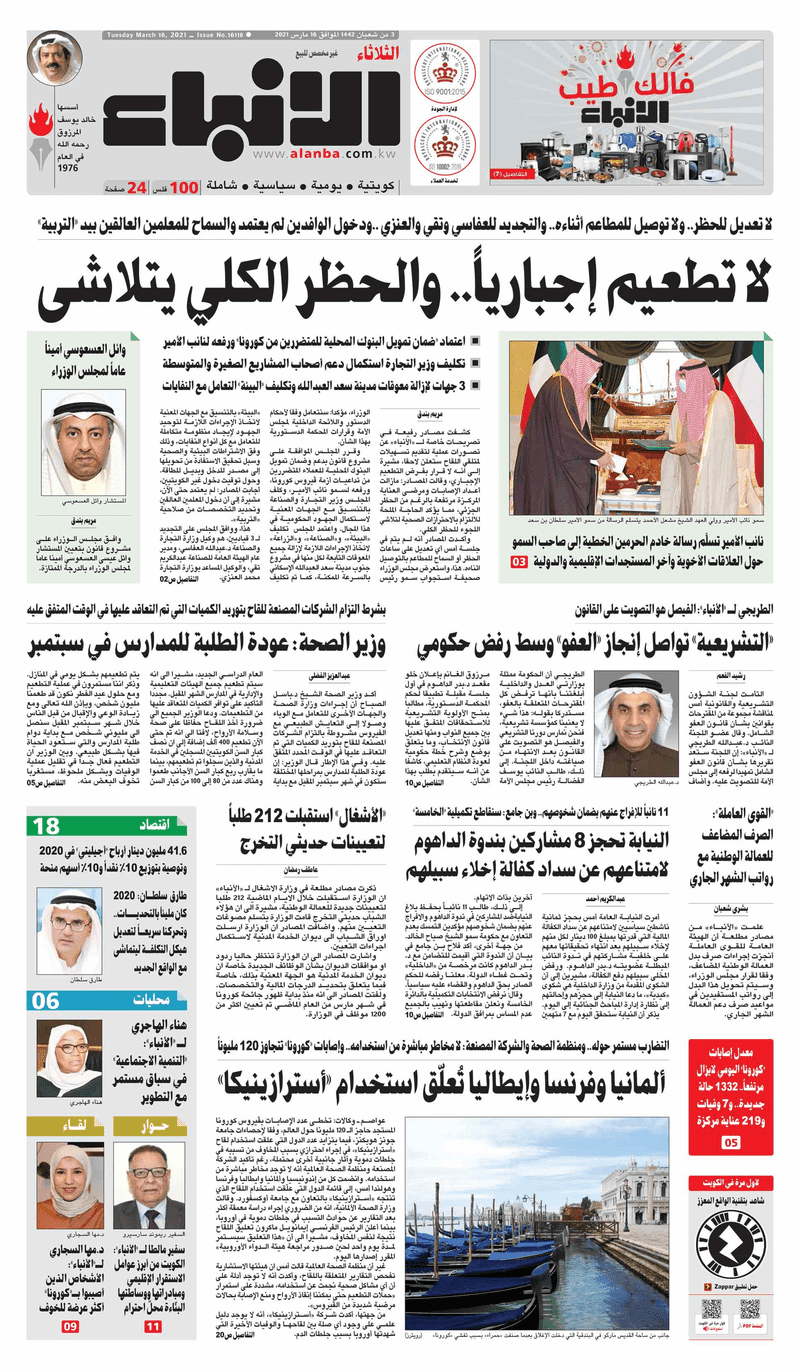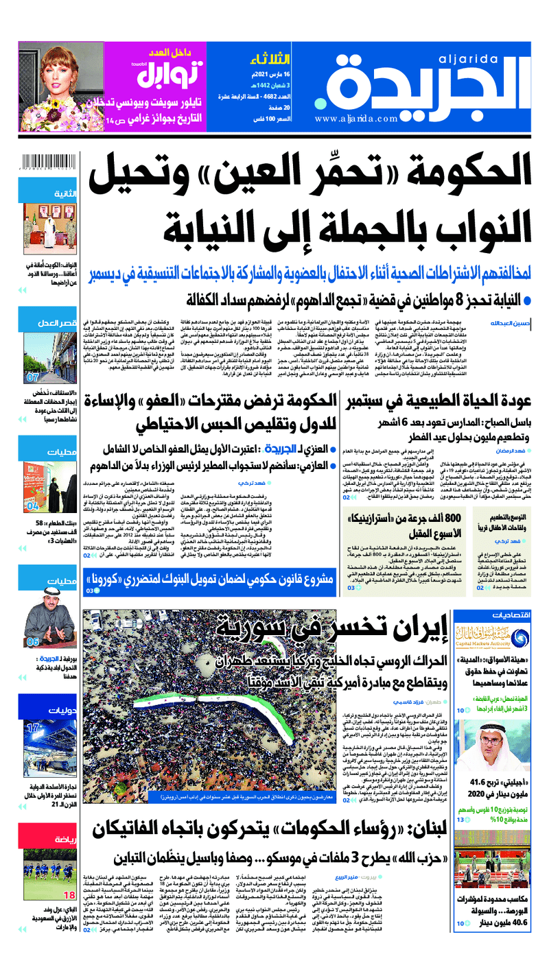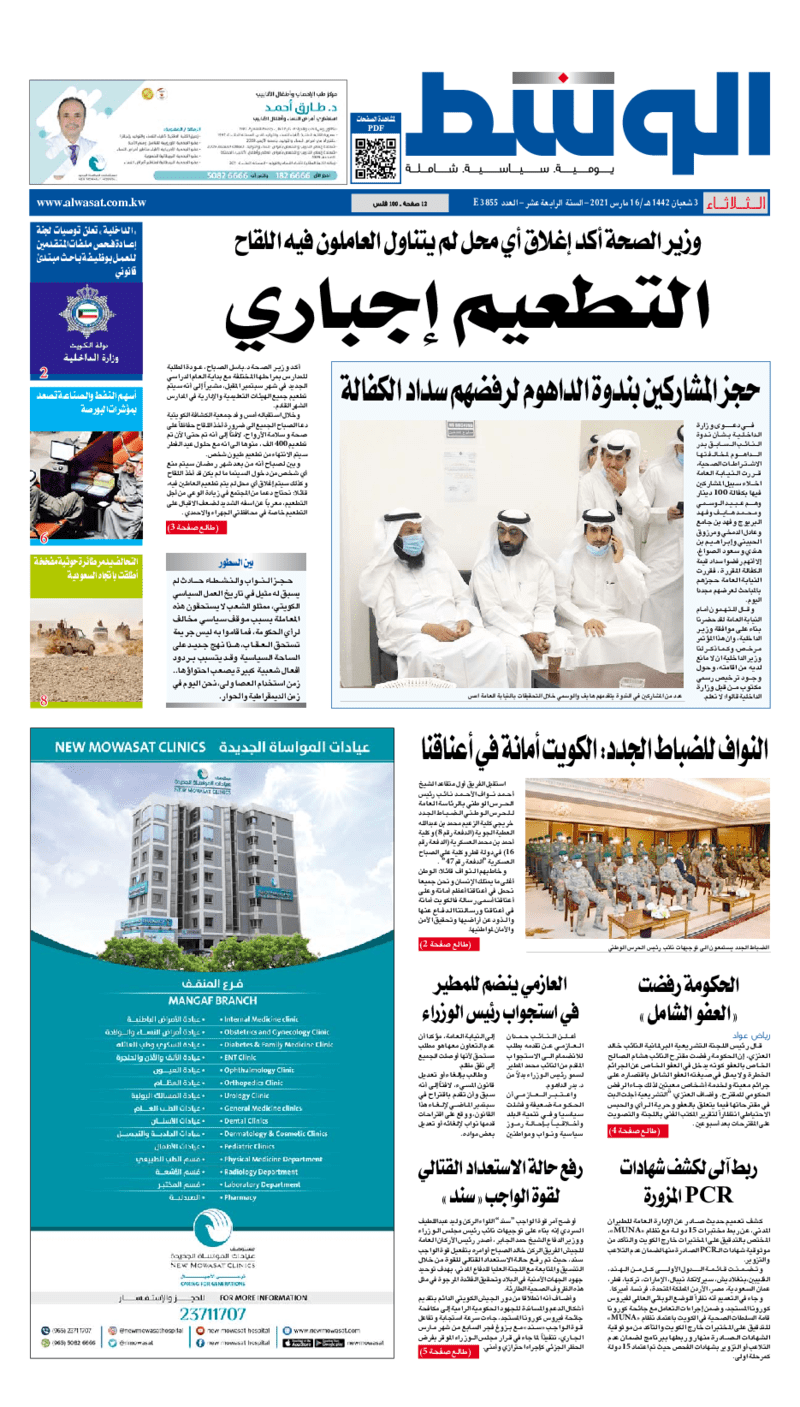 آخر الأخبار جرائم وقضايا “الجمارك” تضبط 29 ألف علبة مشروبات كحولية قادمة من دولة آسيوية في ميناء الشويخ 9 يونيو، 2024 محليات ممثلة عن دولة الكويت الطبيبة الكويتية أسماء الكندري تشارك في المؤتمر العالمي للمناظير في إيطاليا 8 يونيو، 2024 محليات “الصحة”: اكتمال وصول فريق الخدمات الطبية ببعثة الحج الكويتية لمكة المكرمة 8 يونيو، 2024 محليات “الصحة” تحدد 8 مراكز للصحة المدرسية لاستقبال الطلبة المبتعثين 8 يونيو، 2024 عربي وعالمي “الصحة العالمية”: تسجيل أول وفاة لشخص مصاب بـ«أنفلونزا الطيور» 7 يونيو، 2024 محليات عناوين الصحف الكويتية ليوم الثلاثاء 16 مارس 2021 محرر المحليات16 مارس، 2021أضف تعليق1 دقائق جريدة الجريدة جريدة الأنباء جريدة الراي جريدة الوسط الوسومTop عناوين الصحف المحلية من الممكن أن يعجبك جرائم وقضايا “الجمارك” تضبط 29 ألف علبة مشروبات كحولية قادمة من دولة آسيوية في ميناء الشويخ محليات ممثلة عن دولة الكويت الطبيبة الكويتية أسماء الكندري تشارك في المؤتمر العالمي للمناظير في إيطاليا محليات “الصحة”: اكتمال وصول فريق الخدمات الطبية ببعثة الحج الكويتية لمكة المكرمة محليات “الصحة” تحدد 8 مراكز للصحة المدرسية لاستقبال الطلبة المبتعثين عربي وعالمي “الصحة العالمية”: تسجيل أول وفاة لشخص مصاب بـ«أنفلونزا الطيور» تكنولوجيا رش السحب بملح البحر.. تجربة “ثورية” لتبريد كوكب الأرض أضف تعليق أضغط هنا لإضافة تعليق إلغاء الردالتعليقالاسم البريد الإلكتروني الموقع الإلكتروني Δ هذا الموقع يستخدم خدمة أكيسميت للتقليل من البريد المزعجة. اعرف المزيد عن كيفية التعامل مع بيانات التعليقات الخاصة بك processed.