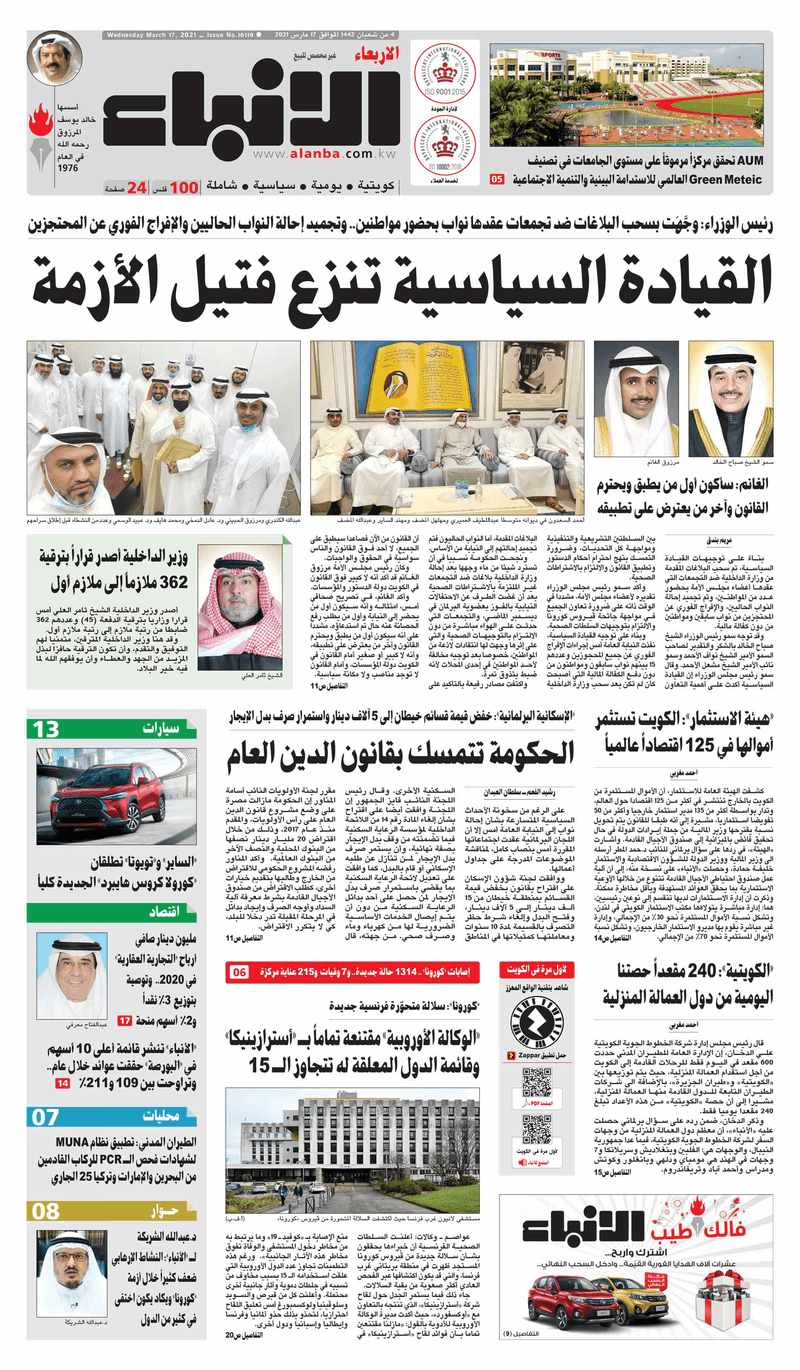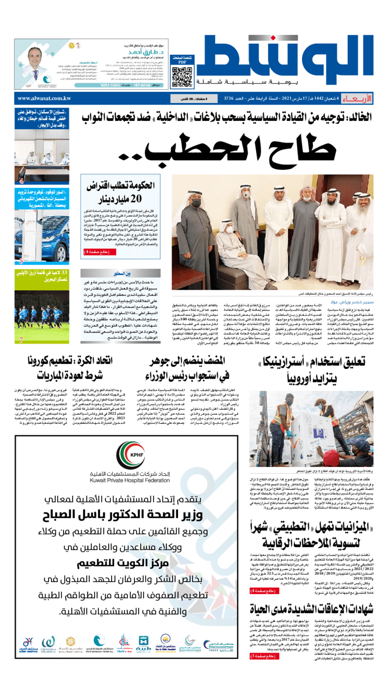 آخر الأخبار جرائم وقضايا “الجمارك” تضبط 29 ألف علبة مشروبات كحولية قادمة من دولة آسيوية في ميناء الشويخ 9 يونيو، 2024 محليات ممثلة عن دولة الكويت الطبيبة الكويتية أسماء الكندري تشارك في المؤتمر العالمي للمناظير في إيطاليا 8 يونيو، 2024 محليات “الصحة”: اكتمال وصول فريق الخدمات الطبية ببعثة الحج الكويتية لمكة المكرمة 8 يونيو، 2024 محليات “الصحة” تحدد 8 مراكز للصحة المدرسية لاستقبال الطلبة المبتعثين 8 يونيو، 2024 عربي وعالمي “الصحة العالمية”: تسجيل أول وفاة لشخص مصاب بـ«أنفلونزا الطيور» 7 يونيو، 2024 محليات عناوين الصحف الكويتية ليوم الأربعاء 17 مارس 2021 محرر المحليات17 مارس، 2021أضف تعليق1 دقائق جريدة الجريدة جريدة الأنباء جريدة الراي جريدة الوسط الوسومTop عناوين الصحف المحلية من الممكن أن يعجبك جرائم وقضايا “الجمارك” تضبط 29 ألف علبة مشروبات كحولية قادمة من دولة آسيوية في ميناء الشويخ محليات ممثلة عن دولة الكويت الطبيبة الكويتية أسماء الكندري تشارك في المؤتمر العالمي للمناظير في إيطاليا محليات “الصحة”: اكتمال وصول فريق الخدمات الطبية ببعثة الحج الكويتية لمكة المكرمة محليات “الصحة” تحدد 8 مراكز للصحة المدرسية لاستقبال الطلبة المبتعثين عربي وعالمي “الصحة العالمية”: تسجيل أول وفاة لشخص مصاب بـ«أنفلونزا الطيور» تكنولوجيا رش السحب بملح البحر.. تجربة “ثورية” لتبريد كوكب الأرض أضف تعليق أضغط هنا لإضافة تعليق إلغاء الردالتعليقالاسم البريد الإلكتروني الموقع الإلكتروني Δ هذا الموقع يستخدم خدمة أكيسميت للتقليل من البريد المزعجة. اعرف المزيد عن كيفية التعامل مع بيانات التعليقات الخاصة بك processed.