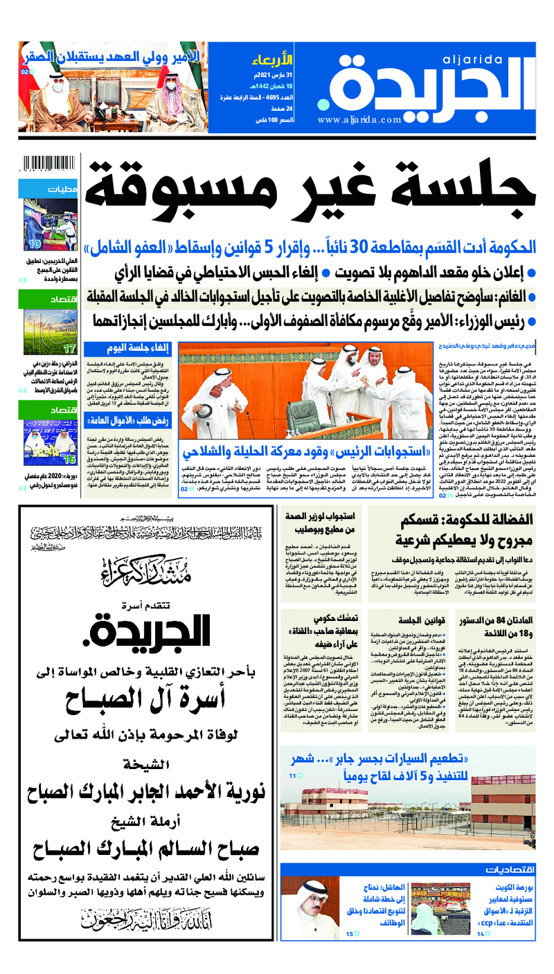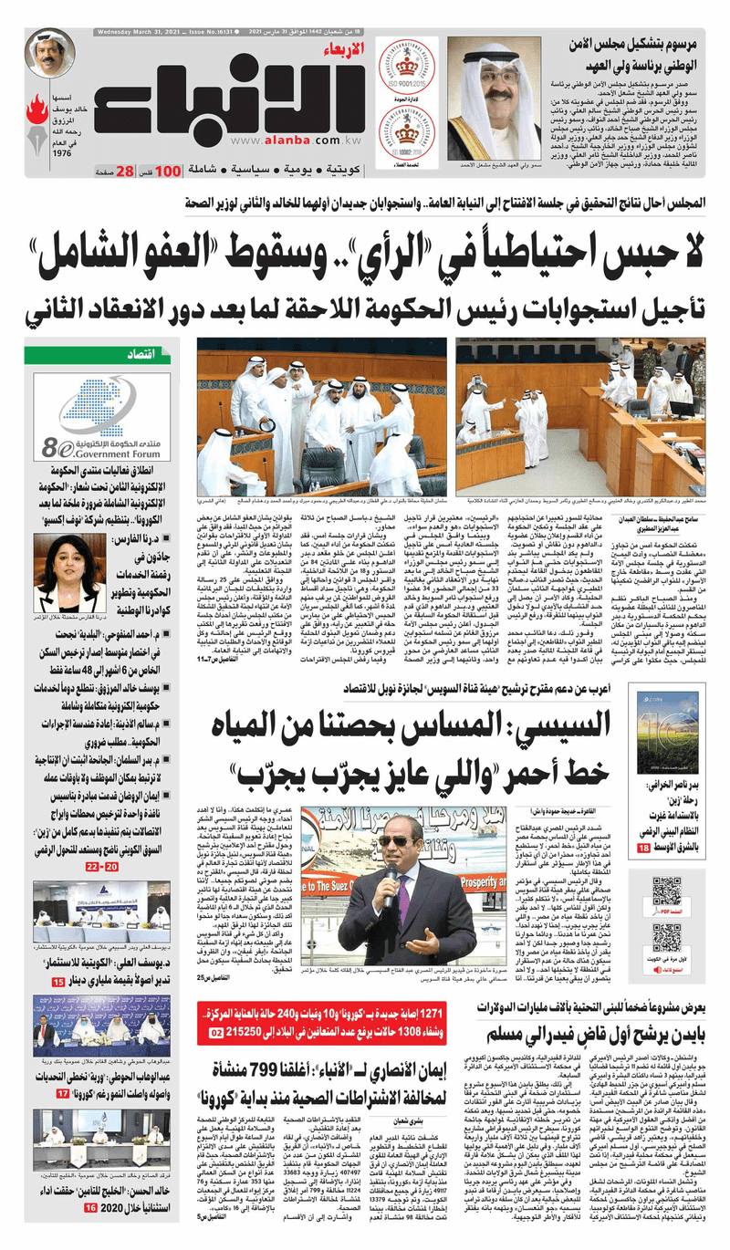آخر الأخبار جرائم وقضايا “الجمارك” تضبط 29 ألف علبة مشروبات كحولية قادمة من دولة آسيوية في ميناء الشويخ 9 يونيو، 2024 محليات ممثلة عن دولة الكويت الطبيبة الكويتية أسماء الكندري تشارك في المؤتمر العالمي للمناظير في إيطاليا 8 يونيو، 2024 محليات “الصحة”: اكتمال وصول فريق الخدمات الطبية ببعثة الحج الكويتية لمكة المكرمة 8 يونيو، 2024 محليات “الصحة” تحدد 8 مراكز للصحة المدرسية لاستقبال الطلبة المبتعثين 8 يونيو، 2024 عربي وعالمي “الصحة العالمية”: تسجيل أول وفاة لشخص مصاب بـ«أنفلونزا الطيور» 7 يونيو، 2024 محليات عناوين الصحف الكويتية ليوم الأربعاء 31 مارس 2021 محرر المحليات31 مارس، 2021أضف تعليق1 دقائق جريدة الجريدة جريدة الأنباء جريدة الراي جريدة الوسط الوسومTop عناوين الصحف المحلية من الممكن أن يعجبك جرائم وقضايا “الجمارك” تضبط 29 ألف علبة مشروبات كحولية قادمة من دولة آسيوية في ميناء الشويخ محليات ممثلة عن دولة الكويت الطبيبة الكويتية أسماء الكندري تشارك في المؤتمر العالمي للمناظير في إيطاليا محليات “الصحة”: اكتمال وصول فريق الخدمات الطبية ببعثة الحج الكويتية لمكة المكرمة محليات “الصحة” تحدد 8 مراكز للصحة المدرسية لاستقبال الطلبة المبتعثين عربي وعالمي “الصحة العالمية”: تسجيل أول وفاة لشخص مصاب بـ«أنفلونزا الطيور» تكنولوجيا رش السحب بملح البحر.. تجربة “ثورية” لتبريد كوكب الأرض أضف تعليق أضغط هنا لإضافة تعليق إلغاء الردالتعليقالاسم البريد الإلكتروني الموقع الإلكتروني Δ هذا الموقع يستخدم خدمة أكيسميت للتقليل من البريد المزعجة. اعرف المزيد عن كيفية التعامل مع بيانات التعليقات الخاصة بك processed.