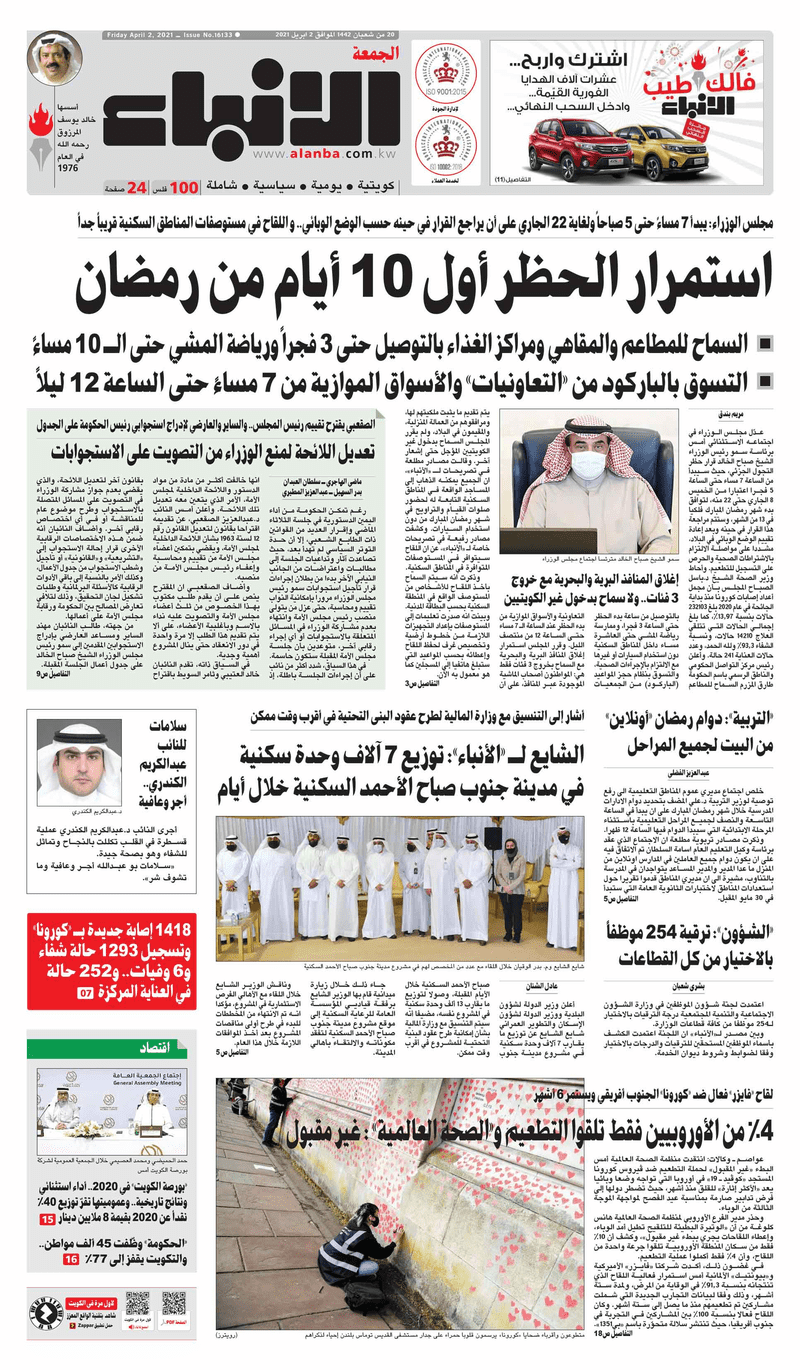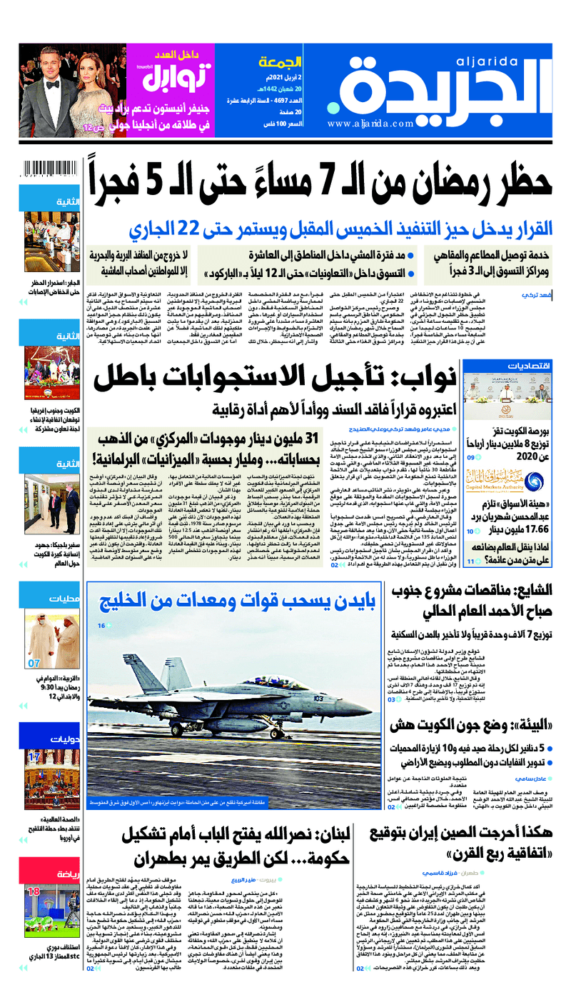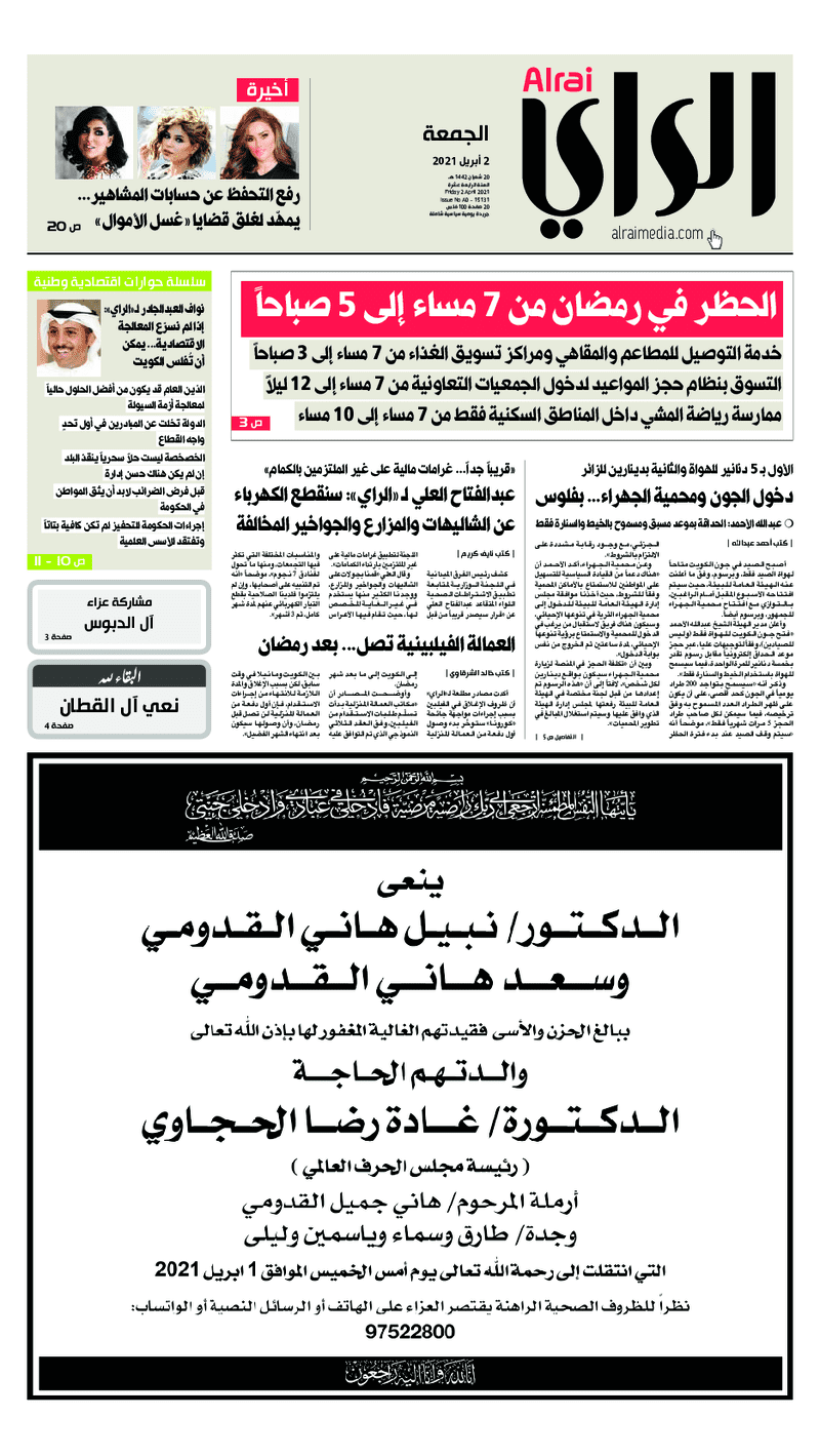 آخر الأخبار جرائم وقضايا “الجمارك” تضبط 29 ألف علبة مشروبات كحولية قادمة من دولة آسيوية في ميناء الشويخ 9 يونيو، 2024 محليات ممثلة عن دولة الكويت الطبيبة الكويتية أسماء الكندري تشارك في المؤتمر العالمي للمناظير في إيطاليا 8 يونيو، 2024 محليات “الصحة”: اكتمال وصول فريق الخدمات الطبية ببعثة الحج الكويتية لمكة المكرمة 8 يونيو، 2024 محليات “الصحة” تحدد 8 مراكز للصحة المدرسية لاستقبال الطلبة المبتعثين 8 يونيو، 2024 عربي وعالمي “الصحة العالمية”: تسجيل أول وفاة لشخص مصاب بـ«أنفلونزا الطيور» 7 يونيو، 2024 محليات عناوين الصحف الكويتية ليوم الجمعة 02 أبريل 2021 محرر المحليات2 أبريل، 2021أضف تعليق1 دقائق جريدة الجريدة جريدة الأنباء جريدة الراي الوسومTop عناوين الصحف المحلية من الممكن أن يعجبك جرائم وقضايا “الجمارك” تضبط 29 ألف علبة مشروبات كحولية قادمة من دولة آسيوية في ميناء الشويخ محليات ممثلة عن دولة الكويت الطبيبة الكويتية أسماء الكندري تشارك في المؤتمر العالمي للمناظير في إيطاليا محليات “الصحة”: اكتمال وصول فريق الخدمات الطبية ببعثة الحج الكويتية لمكة المكرمة محليات “الصحة” تحدد 8 مراكز للصحة المدرسية لاستقبال الطلبة المبتعثين عربي وعالمي “الصحة العالمية”: تسجيل أول وفاة لشخص مصاب بـ«أنفلونزا الطيور» تكنولوجيا رش السحب بملح البحر.. تجربة “ثورية” لتبريد كوكب الأرض أضف تعليق أضغط هنا لإضافة تعليق إلغاء الردالتعليقالاسم البريد الإلكتروني الموقع الإلكتروني Δ هذا الموقع يستخدم خدمة أكيسميت للتقليل من البريد المزعجة. اعرف المزيد عن كيفية التعامل مع بيانات التعليقات الخاصة بك processed.