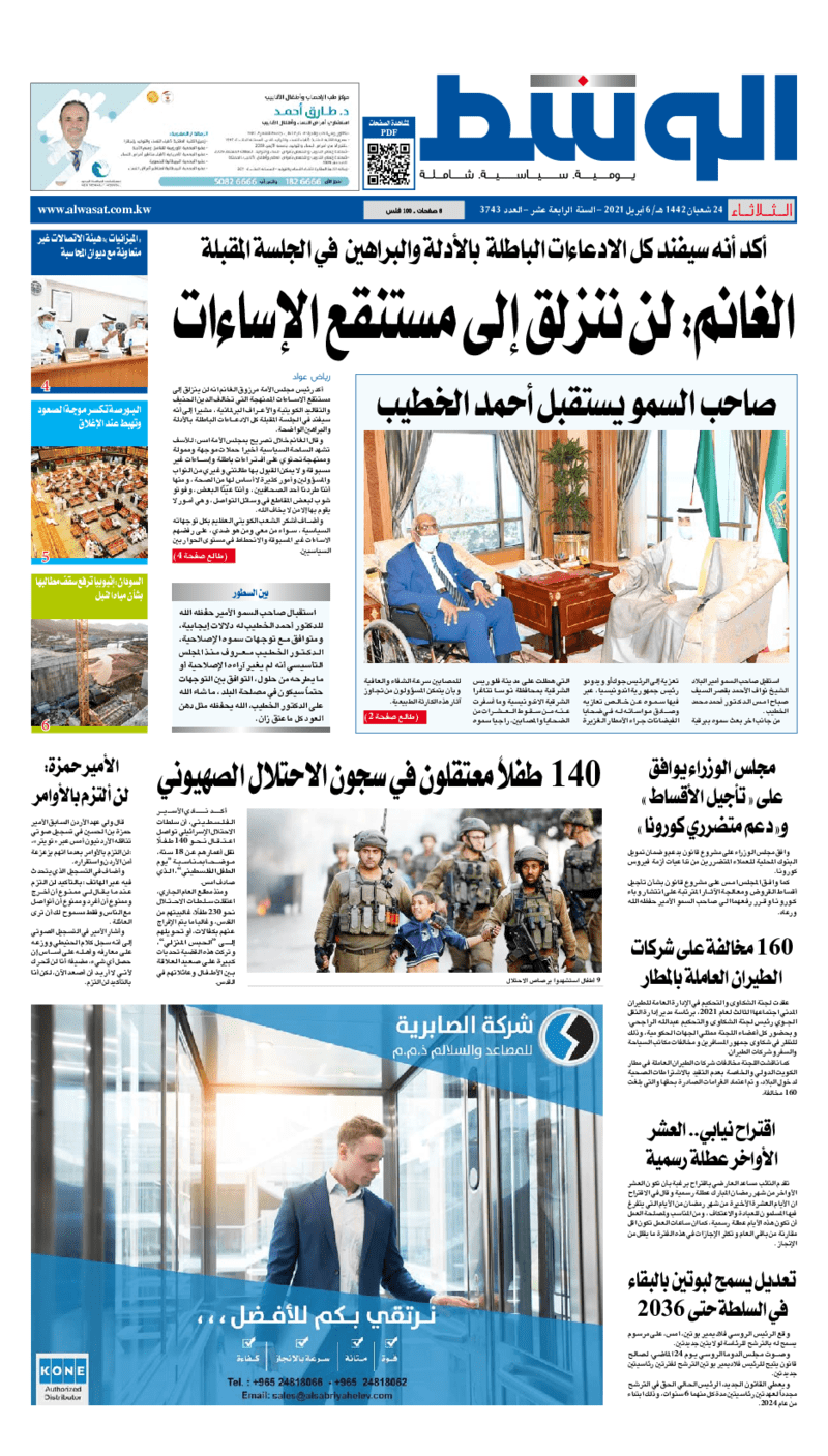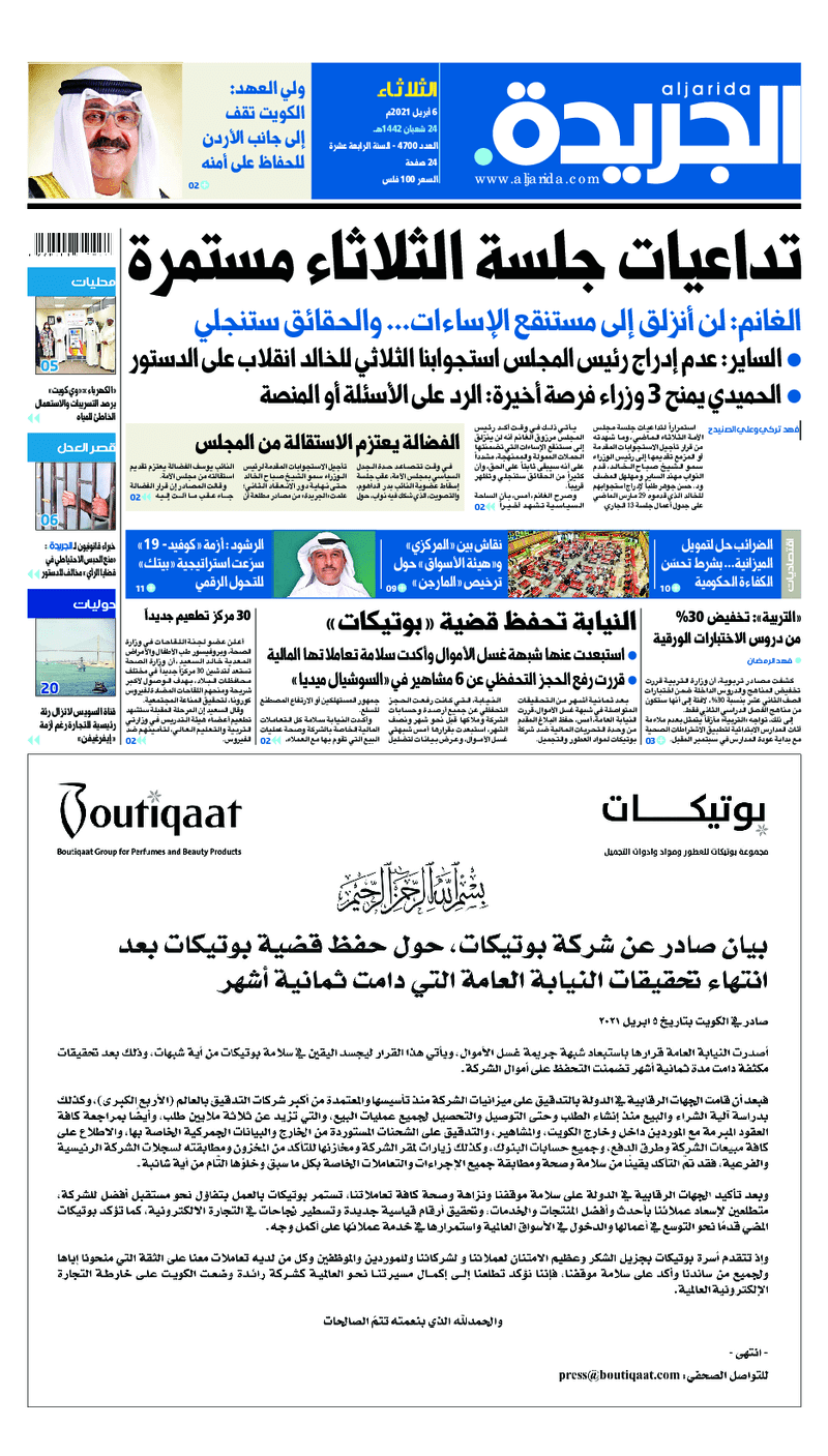 آخر الأخبار جرائم وقضايا “الجمارك” تضبط 29 ألف علبة مشروبات كحولية قادمة من دولة آسيوية في ميناء الشويخ 9 يونيو، 2024 محليات ممثلة عن دولة الكويت الطبيبة الكويتية أسماء الكندري تشارك في المؤتمر العالمي للمناظير في إيطاليا 8 يونيو، 2024 محليات “الصحة”: اكتمال وصول فريق الخدمات الطبية ببعثة الحج الكويتية لمكة المكرمة 8 يونيو، 2024 محليات “الصحة” تحدد 8 مراكز للصحة المدرسية لاستقبال الطلبة المبتعثين 8 يونيو، 2024 عربي وعالمي “الصحة العالمية”: تسجيل أول وفاة لشخص مصاب بـ«أنفلونزا الطيور» 7 يونيو، 2024 محليات عناوين الصحف الكويتية ليوم الثلاثاء 06 أبريل 2021 محرر المحليات6 أبريل، 2021أضف تعليق1 دقائق جريدة الجريدة جريدة الأنباء جريدة الراي جريدة الوسط الوسومTop عناوين الصحف المحلية من الممكن أن يعجبك جرائم وقضايا “الجمارك” تضبط 29 ألف علبة مشروبات كحولية قادمة من دولة آسيوية في ميناء الشويخ محليات ممثلة عن دولة الكويت الطبيبة الكويتية أسماء الكندري تشارك في المؤتمر العالمي للمناظير في إيطاليا محليات “الصحة”: اكتمال وصول فريق الخدمات الطبية ببعثة الحج الكويتية لمكة المكرمة محليات “الصحة” تحدد 8 مراكز للصحة المدرسية لاستقبال الطلبة المبتعثين عربي وعالمي “الصحة العالمية”: تسجيل أول وفاة لشخص مصاب بـ«أنفلونزا الطيور» تكنولوجيا رش السحب بملح البحر.. تجربة “ثورية” لتبريد كوكب الأرض أضف تعليق أضغط هنا لإضافة تعليق إلغاء الردالتعليقالاسم البريد الإلكتروني الموقع الإلكتروني Δ هذا الموقع يستخدم خدمة أكيسميت للتقليل من البريد المزعجة. اعرف المزيد عن كيفية التعامل مع بيانات التعليقات الخاصة بك processed.