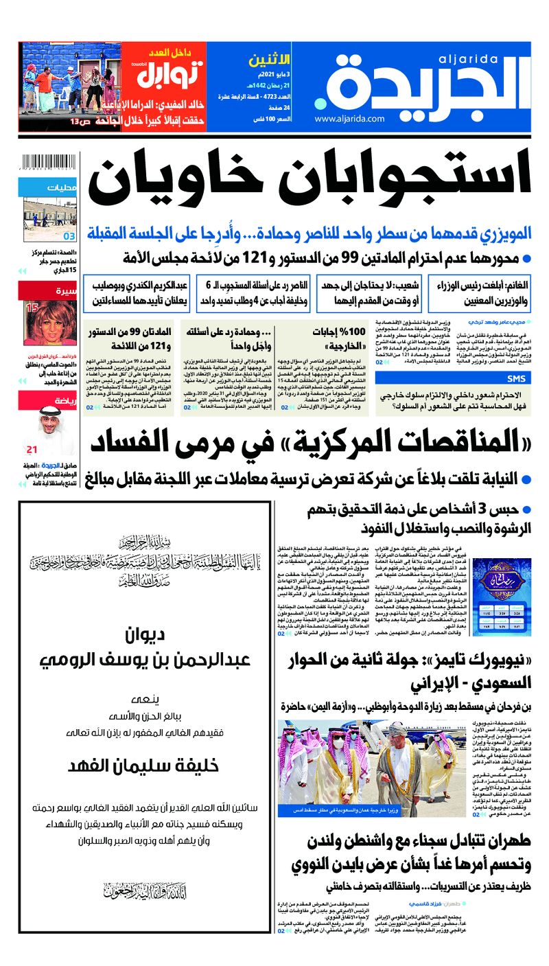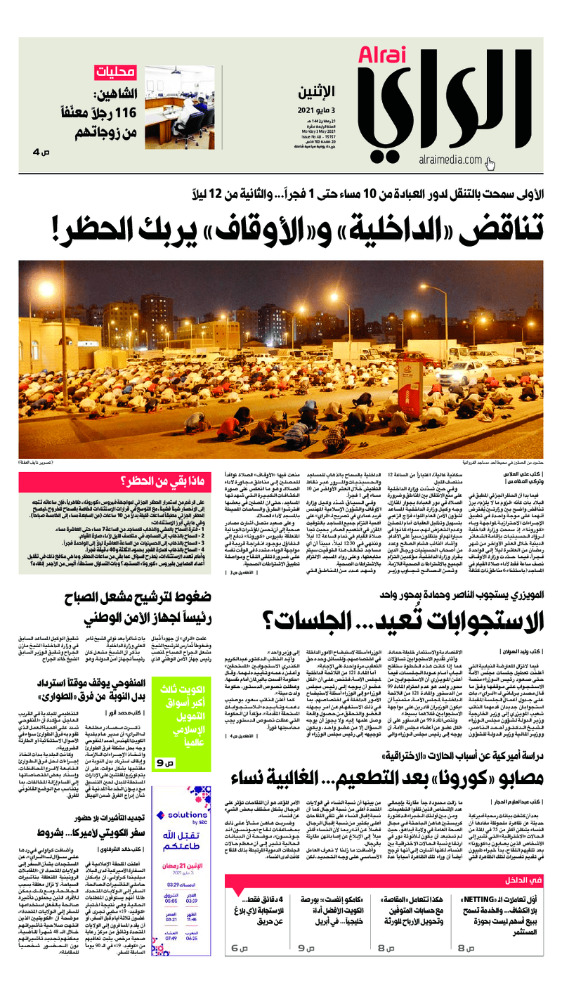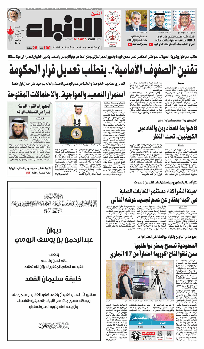 آخر الأخبار جرائم وقضايا “الجمارك” تضبط 29 ألف علبة مشروبات كحولية قادمة من دولة آسيوية في ميناء الشويخ 9 يونيو، 2024 محليات ممثلة عن دولة الكويت الطبيبة الكويتية أسماء الكندري تشارك في المؤتمر العالمي للمناظير في إيطاليا 8 يونيو، 2024 محليات “الصحة”: اكتمال وصول فريق الخدمات الطبية ببعثة الحج الكويتية لمكة المكرمة 8 يونيو، 2024 محليات “الصحة” تحدد 8 مراكز للصحة المدرسية لاستقبال الطلبة المبتعثين 8 يونيو، 2024 عربي وعالمي “الصحة العالمية”: تسجيل أول وفاة لشخص مصاب بـ«أنفلونزا الطيور» 7 يونيو، 2024 محليات عناوين الصحف الكويتية ليوم الاثنين 03 مايو 2021 محرر المحليات3 مايو، 2021أضف تعليق1 دقائق جريدة الجريدة جريدة الأنباء جريدة الراي جريدة الوسط الوسومTop عناوين الصحف المحلية من الممكن أن يعجبك جرائم وقضايا “الجمارك” تضبط 29 ألف علبة مشروبات كحولية قادمة من دولة آسيوية في ميناء الشويخ محليات ممثلة عن دولة الكويت الطبيبة الكويتية أسماء الكندري تشارك في المؤتمر العالمي للمناظير في إيطاليا محليات “الصحة”: اكتمال وصول فريق الخدمات الطبية ببعثة الحج الكويتية لمكة المكرمة محليات “الصحة” تحدد 8 مراكز للصحة المدرسية لاستقبال الطلبة المبتعثين عربي وعالمي “الصحة العالمية”: تسجيل أول وفاة لشخص مصاب بـ«أنفلونزا الطيور» تكنولوجيا رش السحب بملح البحر.. تجربة “ثورية” لتبريد كوكب الأرض أضف تعليق أضغط هنا لإضافة تعليق إلغاء الردالتعليقالاسم البريد الإلكتروني الموقع الإلكتروني Δ هذا الموقع يستخدم خدمة أكيسميت للتقليل من البريد المزعجة. اعرف المزيد عن كيفية التعامل مع بيانات التعليقات الخاصة بك processed.