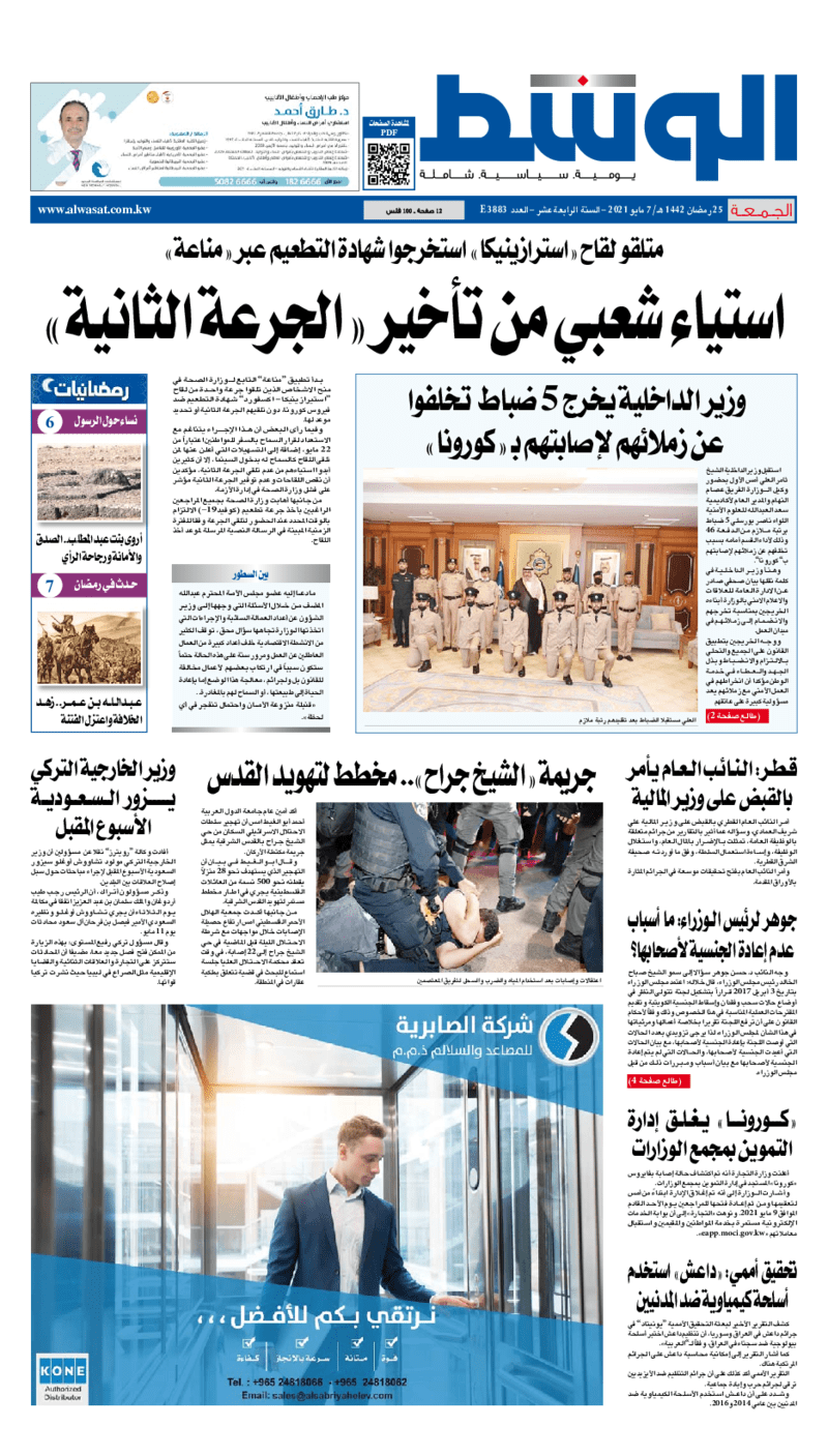 آخر الأخبار جرائم وقضايا “الجمارك” تضبط 29 ألف علبة مشروبات كحولية قادمة من دولة آسيوية في ميناء الشويخ 9 يونيو، 2024 محليات ممثلة عن دولة الكويت الطبيبة الكويتية أسماء الكندري تشارك في المؤتمر العالمي للمناظير في إيطاليا 8 يونيو، 2024 محليات “الصحة”: اكتمال وصول فريق الخدمات الطبية ببعثة الحج الكويتية لمكة المكرمة 8 يونيو، 2024 محليات “الصحة” تحدد 8 مراكز للصحة المدرسية لاستقبال الطلبة المبتعثين 8 يونيو، 2024 عربي وعالمي “الصحة العالمية”: تسجيل أول وفاة لشخص مصاب بـ«أنفلونزا الطيور» 7 يونيو، 2024 محليات عناوين الصحف الكويتية ليوم السبت 08 مايو 2021 محرر المحليات8 مايو، 2021أضف تعليق1 دقائق جريدة الوسط الوسومTop عناوين الصحف المحلية من الممكن أن يعجبك جرائم وقضايا “الجمارك” تضبط 29 ألف علبة مشروبات كحولية قادمة من دولة آسيوية في ميناء الشويخ محليات ممثلة عن دولة الكويت الطبيبة الكويتية أسماء الكندري تشارك في المؤتمر العالمي للمناظير في إيطاليا محليات “الصحة”: اكتمال وصول فريق الخدمات الطبية ببعثة الحج الكويتية لمكة المكرمة محليات “الصحة” تحدد 8 مراكز للصحة المدرسية لاستقبال الطلبة المبتعثين عربي وعالمي “الصحة العالمية”: تسجيل أول وفاة لشخص مصاب بـ«أنفلونزا الطيور» تكنولوجيا رش السحب بملح البحر.. تجربة “ثورية” لتبريد كوكب الأرض أضف تعليق أضغط هنا لإضافة تعليق إلغاء الردالتعليقالاسم البريد الإلكتروني الموقع الإلكتروني Δ هذا الموقع يستخدم خدمة أكيسميت للتقليل من البريد المزعجة. اعرف المزيد عن كيفية التعامل مع بيانات التعليقات الخاصة بك processed.