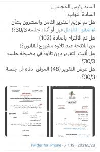 (ب)طلب مقرر اللجنة واضحاً ومحدداً عبارة (قد أحيل إلى مكتب المجلس 8/2/2021) pic.twitter.com/Wqauwcp3Dw— أحمد ذعار المطيري (@A_TH_almutairi) May 31, 2021