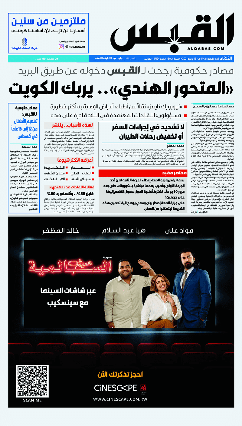 آخر الأخبار جرائم وقضايا “الجمارك” تضبط 29 ألف علبة مشروبات كحولية قادمة من دولة آسيوية في ميناء الشويخ 9 يونيو، 2024 محليات ممثلة عن دولة الكويت الطبيبة الكويتية أسماء الكندري تشارك في المؤتمر العالمي للمناظير في إيطاليا 8 يونيو، 2024 محليات “الصحة”: اكتمال وصول فريق الخدمات الطبية ببعثة الحج الكويتية لمكة المكرمة 8 يونيو، 2024 محليات “الصحة” تحدد 8 مراكز للصحة المدرسية لاستقبال الطلبة المبتعثين 8 يونيو، 2024 عربي وعالمي “الصحة العالمية”: تسجيل أول وفاة لشخص مصاب بـ«أنفلونزا الطيور» 7 يونيو، 2024 محليات عناوين الصحف الكويتية ليوم الثلاثاء 15 يونيو 2021 محرر المحليات15 يونيو، 2021أضف تعليق1 دقائق جريدة الجريدة جريدة الأنباء جريدة القبس جريدة الراي جريدة الوسط الوسومTop عناوين الصحف المحلية من الممكن أن يعجبك جرائم وقضايا “الجمارك” تضبط 29 ألف علبة مشروبات كحولية قادمة من دولة آسيوية في ميناء الشويخ محليات ممثلة عن دولة الكويت الطبيبة الكويتية أسماء الكندري تشارك في المؤتمر العالمي للمناظير في إيطاليا محليات “الصحة”: اكتمال وصول فريق الخدمات الطبية ببعثة الحج الكويتية لمكة المكرمة محليات “الصحة” تحدد 8 مراكز للصحة المدرسية لاستقبال الطلبة المبتعثين عربي وعالمي “الصحة العالمية”: تسجيل أول وفاة لشخص مصاب بـ«أنفلونزا الطيور» تكنولوجيا رش السحب بملح البحر.. تجربة “ثورية” لتبريد كوكب الأرض أضف تعليق أضغط هنا لإضافة تعليق إلغاء الردالتعليقالاسم البريد الإلكتروني الموقع الإلكتروني Δ هذا الموقع يستخدم خدمة أكيسميت للتقليل من البريد المزعجة. اعرف المزيد عن كيفية التعامل مع بيانات التعليقات الخاصة بك processed.