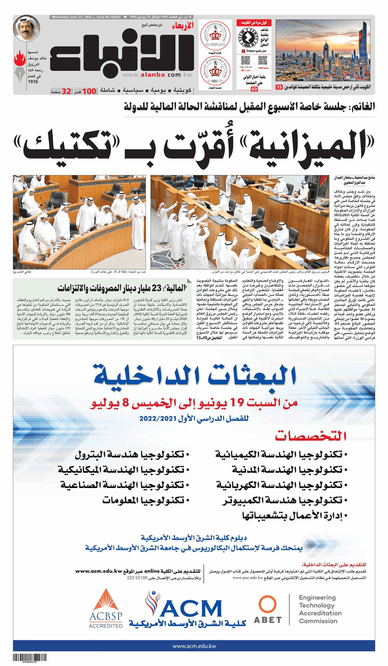 آخر الأخبار جرائم وقضايا “الجمارك” تضبط 29 ألف علبة مشروبات كحولية قادمة من دولة آسيوية في ميناء الشويخ 9 يونيو، 2024 محليات ممثلة عن دولة الكويت الطبيبة الكويتية أسماء الكندري تشارك في المؤتمر العالمي للمناظير في إيطاليا 8 يونيو، 2024 محليات “الصحة”: اكتمال وصول فريق الخدمات الطبية ببعثة الحج الكويتية لمكة المكرمة 8 يونيو، 2024 محليات “الصحة” تحدد 8 مراكز للصحة المدرسية لاستقبال الطلبة المبتعثين 8 يونيو، 2024 عربي وعالمي “الصحة العالمية”: تسجيل أول وفاة لشخص مصاب بـ«أنفلونزا الطيور» 7 يونيو، 2024 محليات عناوين الصحف الكويتية ليوم الأربعاء 23 يونيو 2021 محرر المحليات23 يونيو، 2021أضف تعليق1 دقائق جريدة الجريدة جريدة الأنباء جريدة القبس جريدة الراي جريدة الوسط الوسومTop عناوين الصحف المحلية من الممكن أن يعجبك جرائم وقضايا “الجمارك” تضبط 29 ألف علبة مشروبات كحولية قادمة من دولة آسيوية في ميناء الشويخ محليات ممثلة عن دولة الكويت الطبيبة الكويتية أسماء الكندري تشارك في المؤتمر العالمي للمناظير في إيطاليا محليات “الصحة”: اكتمال وصول فريق الخدمات الطبية ببعثة الحج الكويتية لمكة المكرمة محليات “الصحة” تحدد 8 مراكز للصحة المدرسية لاستقبال الطلبة المبتعثين عربي وعالمي “الصحة العالمية”: تسجيل أول وفاة لشخص مصاب بـ«أنفلونزا الطيور» تكنولوجيا رش السحب بملح البحر.. تجربة “ثورية” لتبريد كوكب الأرض أضف تعليق أضغط هنا لإضافة تعليق إلغاء الردالتعليقالاسم البريد الإلكتروني الموقع الإلكتروني Δ هذا الموقع يستخدم خدمة أكيسميت للتقليل من البريد المزعجة. اعرف المزيد عن كيفية التعامل مع بيانات التعليقات الخاصة بك processed.