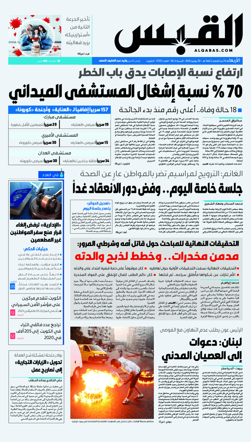 آخر الأخبار جرائم وقضايا “الجمارك” تضبط 29 ألف علبة مشروبات كحولية قادمة من دولة آسيوية في ميناء الشويخ 9 يونيو، 2024 محليات ممثلة عن دولة الكويت الطبيبة الكويتية أسماء الكندري تشارك في المؤتمر العالمي للمناظير في إيطاليا 8 يونيو، 2024 محليات “الصحة”: اكتمال وصول فريق الخدمات الطبية ببعثة الحج الكويتية لمكة المكرمة 8 يونيو، 2024 محليات “الصحة” تحدد 8 مراكز للصحة المدرسية لاستقبال الطلبة المبتعثين 8 يونيو، 2024 عربي وعالمي “الصحة العالمية”: تسجيل أول وفاة لشخص مصاب بـ«أنفلونزا الطيور» 7 يونيو، 2024 محليات عناوين الصحف الكويتية ليوم الأربعاء 30 يونيو 2021 محرر المحليات30 يونيو، 2021أضف تعليق1 دقائق جريدة الجريدة جريدة الأنباء جريدة القبس جريدة الراي جريدة الوسط الوسومTop عناوين الصحف المحلية من الممكن أن يعجبك جرائم وقضايا “الجمارك” تضبط 29 ألف علبة مشروبات كحولية قادمة من دولة آسيوية في ميناء الشويخ محليات ممثلة عن دولة الكويت الطبيبة الكويتية أسماء الكندري تشارك في المؤتمر العالمي للمناظير في إيطاليا محليات “الصحة”: اكتمال وصول فريق الخدمات الطبية ببعثة الحج الكويتية لمكة المكرمة محليات “الصحة” تحدد 8 مراكز للصحة المدرسية لاستقبال الطلبة المبتعثين عربي وعالمي “الصحة العالمية”: تسجيل أول وفاة لشخص مصاب بـ«أنفلونزا الطيور» تكنولوجيا رش السحب بملح البحر.. تجربة “ثورية” لتبريد كوكب الأرض أضف تعليق أضغط هنا لإضافة تعليق إلغاء الردالتعليقالاسم البريد الإلكتروني الموقع الإلكتروني Δ هذا الموقع يستخدم خدمة أكيسميت للتقليل من البريد المزعجة. اعرف المزيد عن كيفية التعامل مع بيانات التعليقات الخاصة بك processed.