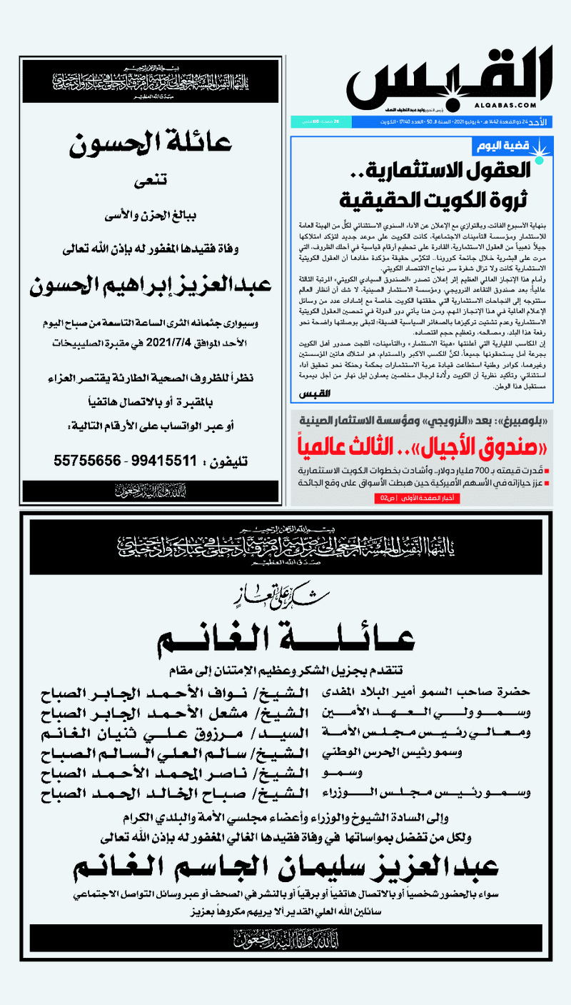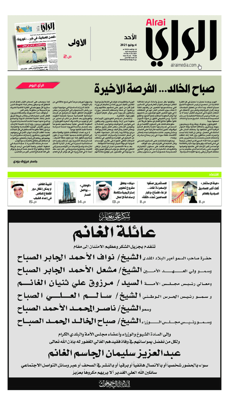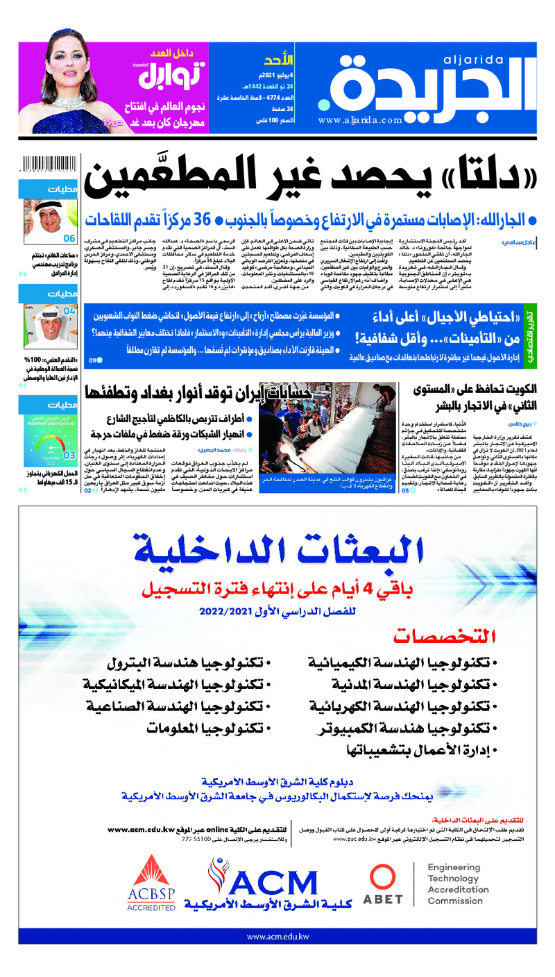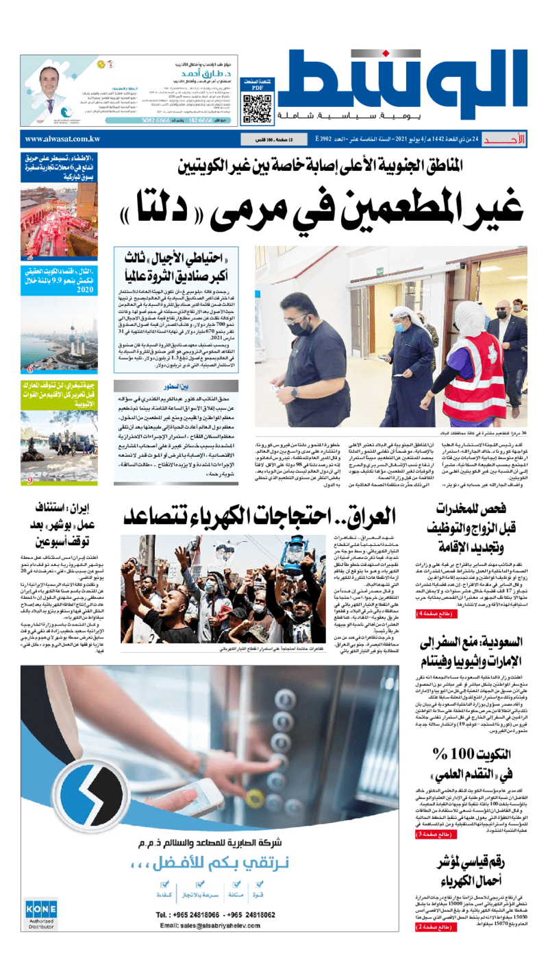 آخر الأخبار جرائم وقضايا “الجمارك” تضبط 29 ألف علبة مشروبات كحولية قادمة من دولة آسيوية في ميناء الشويخ 9 يونيو، 2024 محليات ممثلة عن دولة الكويت الطبيبة الكويتية أسماء الكندري تشارك في المؤتمر العالمي للمناظير في إيطاليا 8 يونيو، 2024 محليات “الصحة”: اكتمال وصول فريق الخدمات الطبية ببعثة الحج الكويتية لمكة المكرمة 8 يونيو، 2024 محليات “الصحة” تحدد 8 مراكز للصحة المدرسية لاستقبال الطلبة المبتعثين 8 يونيو، 2024 عربي وعالمي “الصحة العالمية”: تسجيل أول وفاة لشخص مصاب بـ«أنفلونزا الطيور» 7 يونيو، 2024 محليات عناوين الصحف الكويتية ليوم الأحد 04 يوليو 2021 محرر المحليات4 يوليو، 2021أضف تعليق1 دقائق جريدة الجريدة جريدة الأنباء جريدة القبس جريدة الراي جريدة الوسط الوسومTop عناوين الصحف المحلية من الممكن أن يعجبك جرائم وقضايا “الجمارك” تضبط 29 ألف علبة مشروبات كحولية قادمة من دولة آسيوية في ميناء الشويخ محليات ممثلة عن دولة الكويت الطبيبة الكويتية أسماء الكندري تشارك في المؤتمر العالمي للمناظير في إيطاليا محليات “الصحة”: اكتمال وصول فريق الخدمات الطبية ببعثة الحج الكويتية لمكة المكرمة محليات “الصحة” تحدد 8 مراكز للصحة المدرسية لاستقبال الطلبة المبتعثين عربي وعالمي “الصحة العالمية”: تسجيل أول وفاة لشخص مصاب بـ«أنفلونزا الطيور» تكنولوجيا رش السحب بملح البحر.. تجربة “ثورية” لتبريد كوكب الأرض أضف تعليق أضغط هنا لإضافة تعليق إلغاء الردالتعليقالاسم البريد الإلكتروني الموقع الإلكتروني Δ هذا الموقع يستخدم خدمة أكيسميت للتقليل من البريد المزعجة. اعرف المزيد عن كيفية التعامل مع بيانات التعليقات الخاصة بك processed.