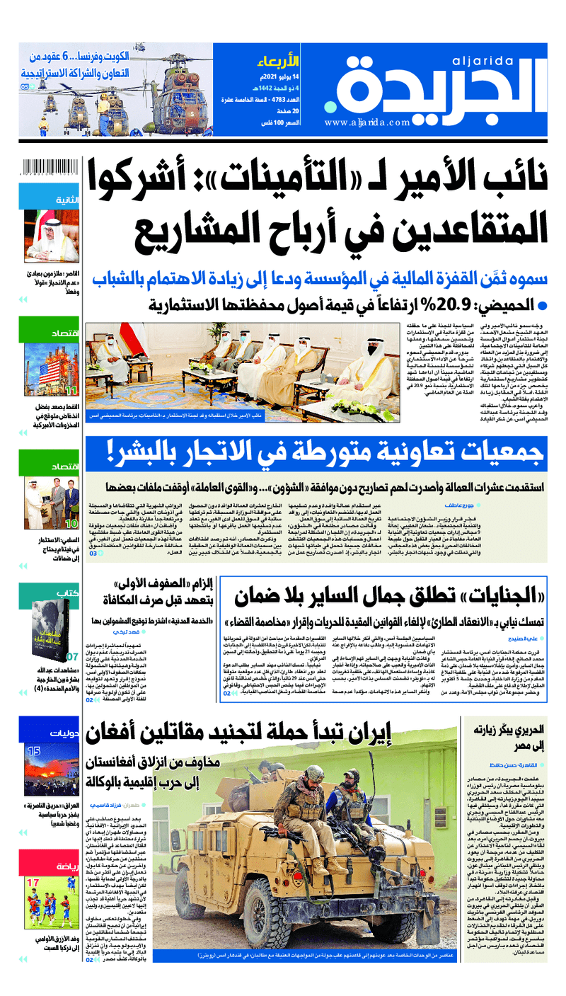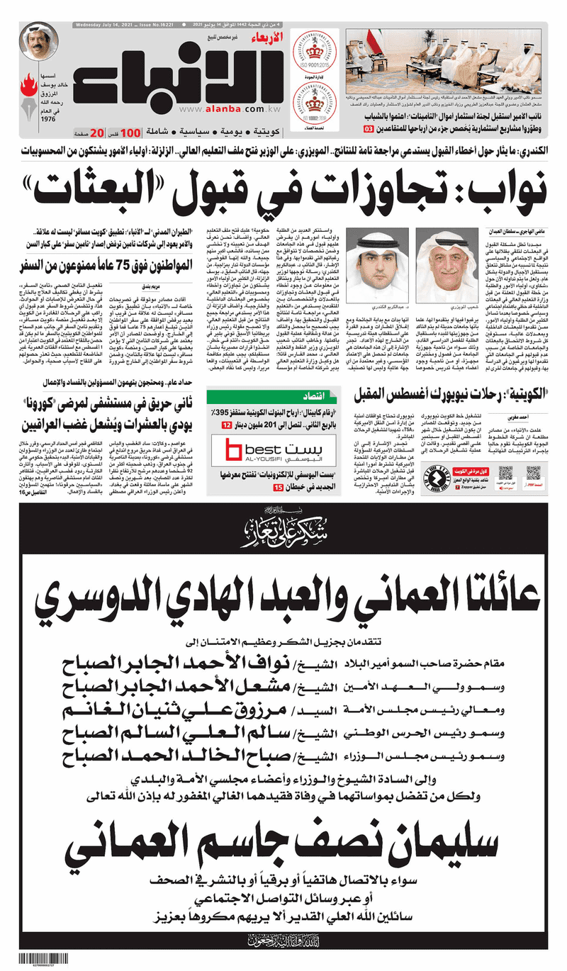 آخر الأخبار جرائم وقضايا “الجمارك” تضبط 29 ألف علبة مشروبات كحولية قادمة من دولة آسيوية في ميناء الشويخ 9 يونيو، 2024 محليات ممثلة عن دولة الكويت الطبيبة الكويتية أسماء الكندري تشارك في المؤتمر العالمي للمناظير في إيطاليا 8 يونيو، 2024 محليات “الصحة”: اكتمال وصول فريق الخدمات الطبية ببعثة الحج الكويتية لمكة المكرمة 8 يونيو، 2024 محليات “الصحة” تحدد 8 مراكز للصحة المدرسية لاستقبال الطلبة المبتعثين 8 يونيو، 2024 عربي وعالمي “الصحة العالمية”: تسجيل أول وفاة لشخص مصاب بـ«أنفلونزا الطيور» 7 يونيو، 2024 محليات عناوين الصحف الكويتية ليوم الأربعاء 14 يوليو 2021 محرر المحليات14 يوليو، 2021أضف تعليق1 دقائق جريدة الجريدة جريدة الأنباء جريدة القبس جريدة الراي جريدة الوسط الوسومTop عناوين الصحف المحلية من الممكن أن يعجبك جرائم وقضايا “الجمارك” تضبط 29 ألف علبة مشروبات كحولية قادمة من دولة آسيوية في ميناء الشويخ محليات ممثلة عن دولة الكويت الطبيبة الكويتية أسماء الكندري تشارك في المؤتمر العالمي للمناظير في إيطاليا محليات “الصحة”: اكتمال وصول فريق الخدمات الطبية ببعثة الحج الكويتية لمكة المكرمة محليات “الصحة” تحدد 8 مراكز للصحة المدرسية لاستقبال الطلبة المبتعثين عربي وعالمي “الصحة العالمية”: تسجيل أول وفاة لشخص مصاب بـ«أنفلونزا الطيور» تكنولوجيا رش السحب بملح البحر.. تجربة “ثورية” لتبريد كوكب الأرض أضف تعليق أضغط هنا لإضافة تعليق إلغاء الردالتعليقالاسم البريد الإلكتروني الموقع الإلكتروني Δ هذا الموقع يستخدم خدمة أكيسميت للتقليل من البريد المزعجة. اعرف المزيد عن كيفية التعامل مع بيانات التعليقات الخاصة بك processed.