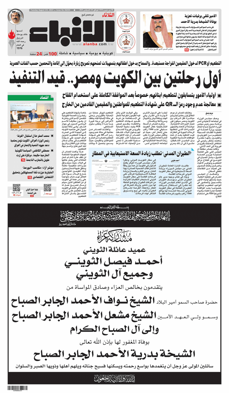 آخر الأخبار جرائم وقضايا “الجمارك” تضبط 29 ألف علبة مشروبات كحولية قادمة من دولة آسيوية في ميناء الشويخ 9 يونيو، 2024 محليات ممثلة عن دولة الكويت الطبيبة الكويتية أسماء الكندري تشارك في المؤتمر العالمي للمناظير في إيطاليا 8 يونيو، 2024 محليات “الصحة”: اكتمال وصول فريق الخدمات الطبية ببعثة الحج الكويتية لمكة المكرمة 8 يونيو، 2024 محليات “الصحة” تحدد 8 مراكز للصحة المدرسية لاستقبال الطلبة المبتعثين 8 يونيو، 2024 عربي وعالمي “الصحة العالمية”: تسجيل أول وفاة لشخص مصاب بـ«أنفلونزا الطيور» 7 يونيو، 2024 محليات عناوين الصحف الكويتية ليوم الثلاثاء 24 أغسطس 2021 محرر المحليات24 أغسطس، 2021أضف تعليق1 دقائق جريدة الجريدة جريدة الأنباء جريدة القبس جريدة الراي جريدة الوسط الوسومTop عناوين الصحف المحلية من الممكن أن يعجبك جرائم وقضايا “الجمارك” تضبط 29 ألف علبة مشروبات كحولية قادمة من دولة آسيوية في ميناء الشويخ محليات ممثلة عن دولة الكويت الطبيبة الكويتية أسماء الكندري تشارك في المؤتمر العالمي للمناظير في إيطاليا محليات “الصحة”: اكتمال وصول فريق الخدمات الطبية ببعثة الحج الكويتية لمكة المكرمة محليات “الصحة” تحدد 8 مراكز للصحة المدرسية لاستقبال الطلبة المبتعثين عربي وعالمي “الصحة العالمية”: تسجيل أول وفاة لشخص مصاب بـ«أنفلونزا الطيور» تكنولوجيا رش السحب بملح البحر.. تجربة “ثورية” لتبريد كوكب الأرض أضف تعليق أضغط هنا لإضافة تعليق إلغاء الردالتعليقالاسم البريد الإلكتروني الموقع الإلكتروني Δ هذا الموقع يستخدم خدمة أكيسميت للتقليل من البريد المزعجة. اعرف المزيد عن كيفية التعامل مع بيانات التعليقات الخاصة بك processed.