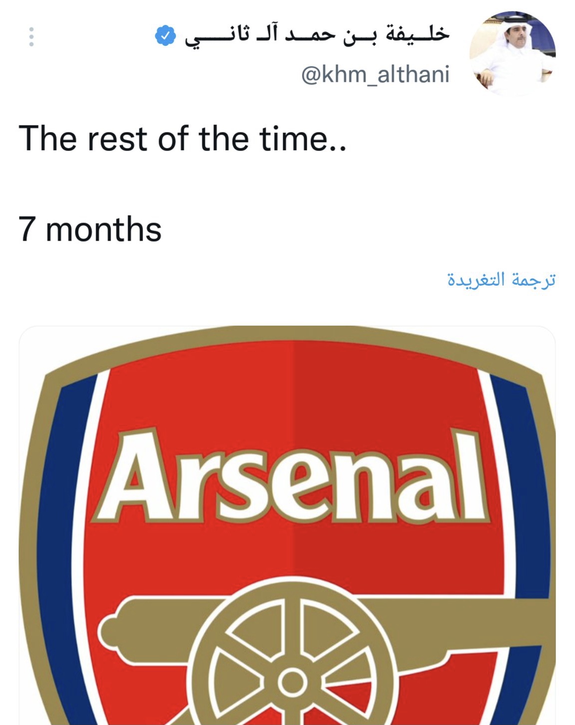 وتأتي التكهنات حول الاتجاه القطري للاستثمار في البريميرليغ بعد تغريدة دوّنها الشيخ خليفة بن حمد ال ثاني رئيس النادي العربي القطري السابق والذي سبق وان تعاطى بشكل ايجابي مع اخبار باريس سان جيرمان في الفترة السابقة لاسيما بإعلانه عن التعاقد مع الاسطورة ليونيل ميسي قبل الإعلان الرسمي، حيث دون ايضاً تغريدة عبر حسابه في “تويتر” جاء فيها “الفترة المقبلة .. ٧ أشهر” وقام بإرفاق شعار نادي الأرسنال الانكليزي الذي يبدو انه بات على مقربة من ان يتم بيعه من قبل مالكه الحالي الانكليزي ستان كرونكي الذي تعود له الملكية الخالصة للنادي العريق وتقدر قيمته المالية بما يقارب ٧,٥ مليار جنيه استرليني.