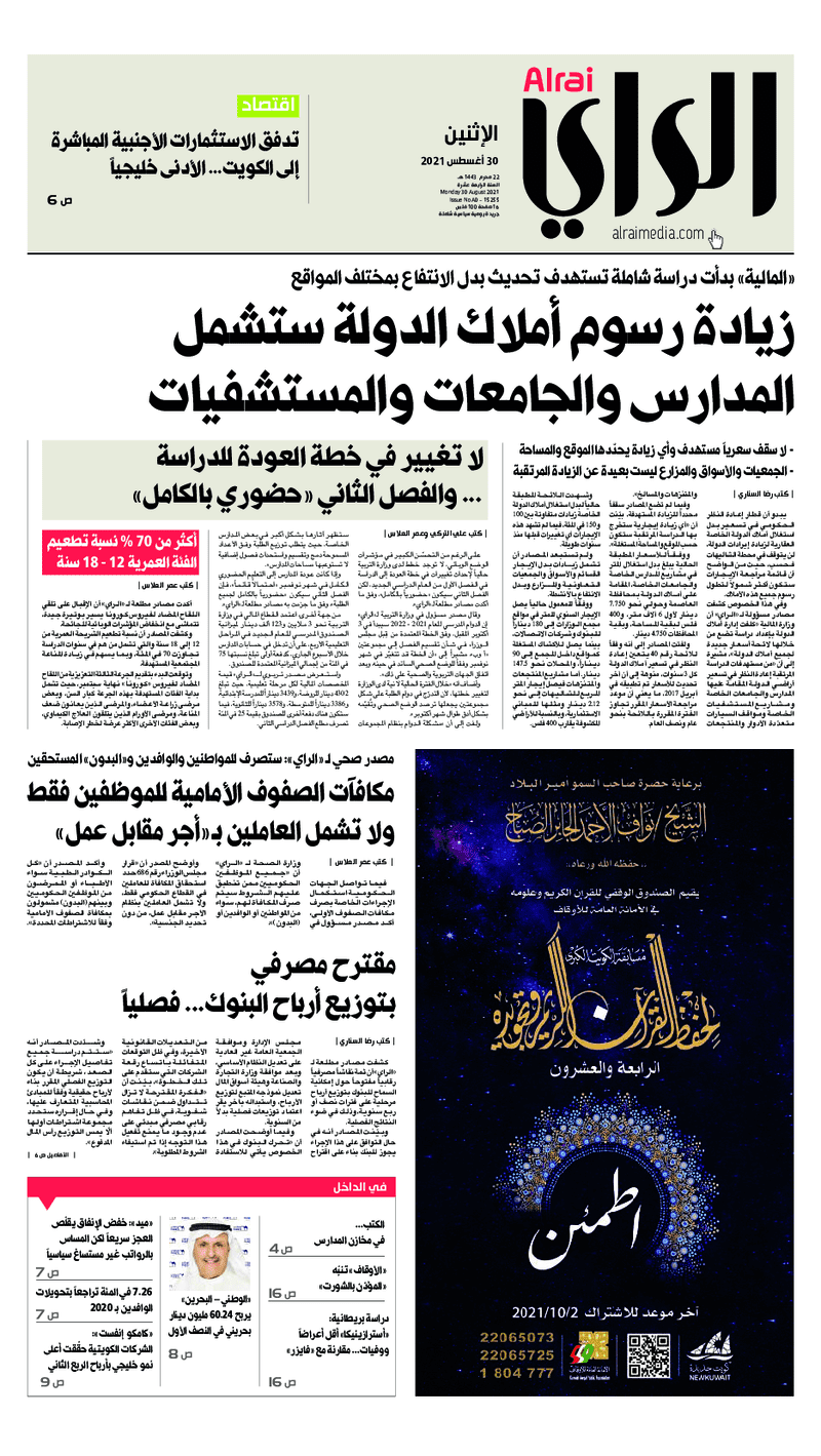 آخر الأخبار جرائم وقضايا “الجمارك” تضبط 29 ألف علبة مشروبات كحولية قادمة من دولة آسيوية في ميناء الشويخ 9 يونيو، 2024 محليات ممثلة عن دولة الكويت الطبيبة الكويتية أسماء الكندري تشارك في المؤتمر العالمي للمناظير في إيطاليا 8 يونيو، 2024 محليات “الصحة”: اكتمال وصول فريق الخدمات الطبية ببعثة الحج الكويتية لمكة المكرمة 8 يونيو، 2024 محليات “الصحة” تحدد 8 مراكز للصحة المدرسية لاستقبال الطلبة المبتعثين 8 يونيو، 2024 عربي وعالمي “الصحة العالمية”: تسجيل أول وفاة لشخص مصاب بـ«أنفلونزا الطيور» 7 يونيو، 2024 محليات عناوين الصحف الكويتية ليوم الاثنين 30 أغسطس 2021 محرر المحليات30 أغسطس، 2021أضف تعليق1 دقائق جريدة الجريدة جريدة الأنباء جريدة القبس جريدة الراي جريدة الوسط الوسومTop عناوين الصحف المحلية من الممكن أن يعجبك جرائم وقضايا “الجمارك” تضبط 29 ألف علبة مشروبات كحولية قادمة من دولة آسيوية في ميناء الشويخ محليات ممثلة عن دولة الكويت الطبيبة الكويتية أسماء الكندري تشارك في المؤتمر العالمي للمناظير في إيطاليا محليات “الصحة”: اكتمال وصول فريق الخدمات الطبية ببعثة الحج الكويتية لمكة المكرمة محليات “الصحة” تحدد 8 مراكز للصحة المدرسية لاستقبال الطلبة المبتعثين عربي وعالمي “الصحة العالمية”: تسجيل أول وفاة لشخص مصاب بـ«أنفلونزا الطيور» تكنولوجيا رش السحب بملح البحر.. تجربة “ثورية” لتبريد كوكب الأرض أضف تعليق أضغط هنا لإضافة تعليق إلغاء الردالتعليقالاسم البريد الإلكتروني الموقع الإلكتروني Δ هذا الموقع يستخدم خدمة أكيسميت للتقليل من البريد المزعجة. اعرف المزيد عن كيفية التعامل مع بيانات التعليقات الخاصة بك processed.