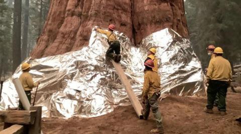 قالت وكالة المتنزهات الوطنية الأميركية إن أطقم مكافحة الحرائق في كاليفورنيا التجأت إلى تغليف جذوع بعض أشجار السيكويا العملاقة بأغطية مقاومة للنيران ضمن محاولاتها المستميتة لإنقاذ الأشجار الشاهقة الارتفاع، بما فيها الشجرة التي تحمل اسم «الجنرال شيرمان» وهي أكبر شجرة في العالم.