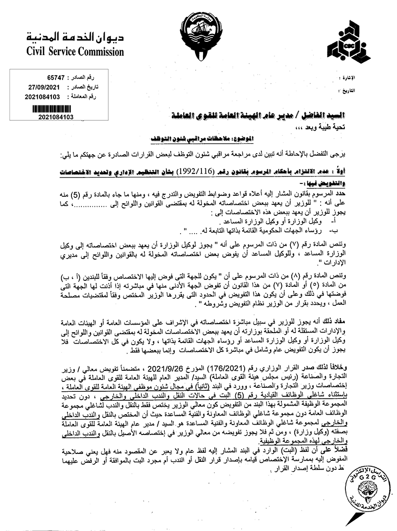 في ظل ما أسمته مصادر ((سبر)) “الصراع على قانون الـ ٦٠”، وصلت إلى ((سبر)) من هذه المصادر نسخة من رد ديوان الخدمة المدنية على قرار وزير التجارة والصناعة بتقليص صلاحيات مدير عام الهيئة العامة للقوى العاملة، والذي يتضمن رداً واضحاً من الديوان بأن القرار أتى بمخالفة لأحكام المرسوم ١١٦/١٩٩٢ بشأن التنظيم الإداري وتحديد الصلاحيات والتفويض فيها.