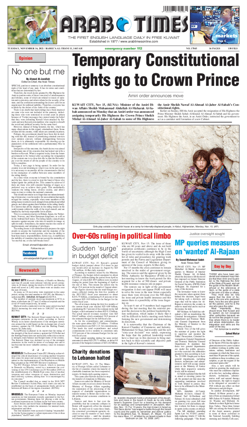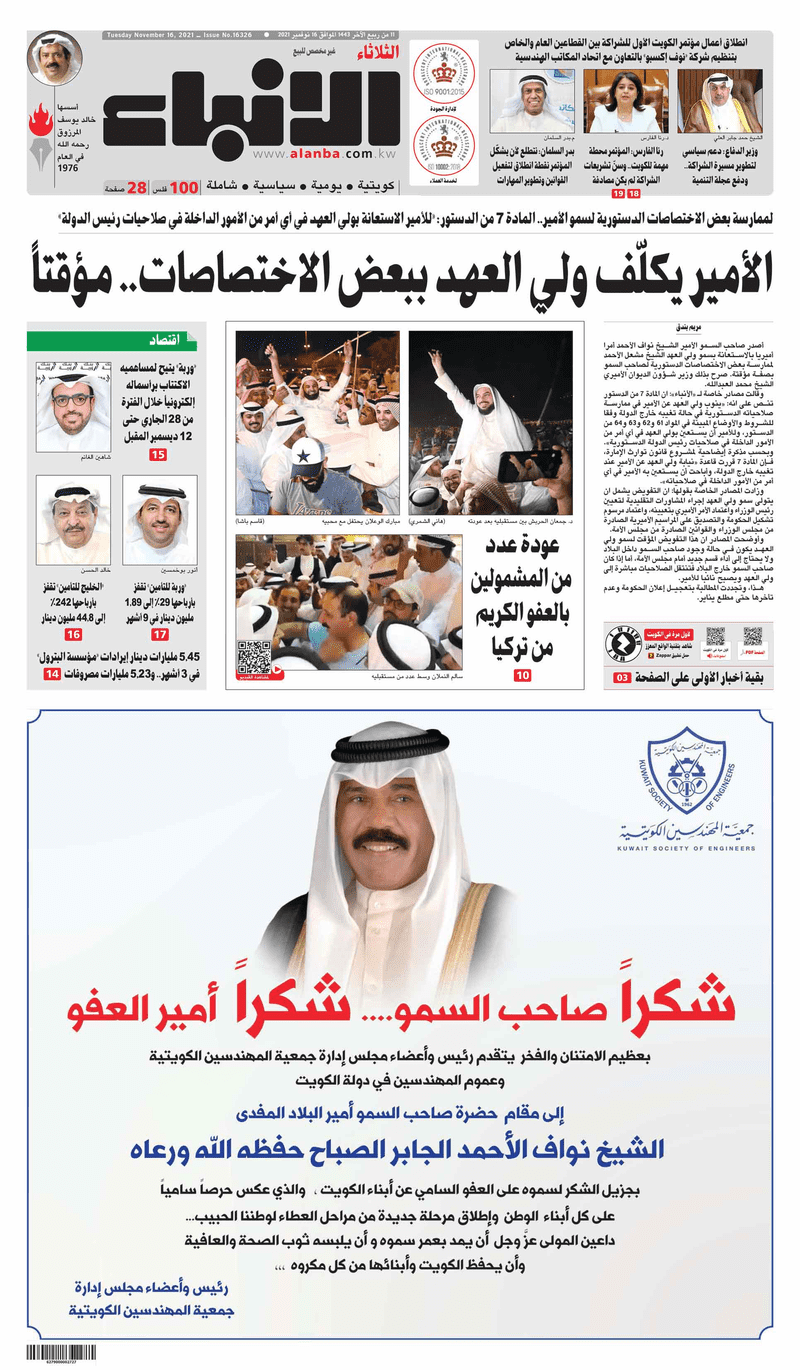 عناوين الصحف الكويتية ليوم الثلاثاء 16 نوفمبر 2021