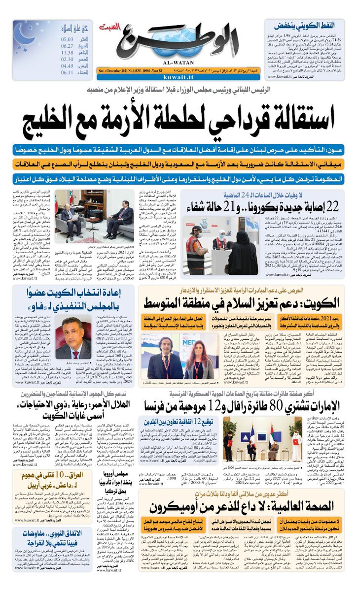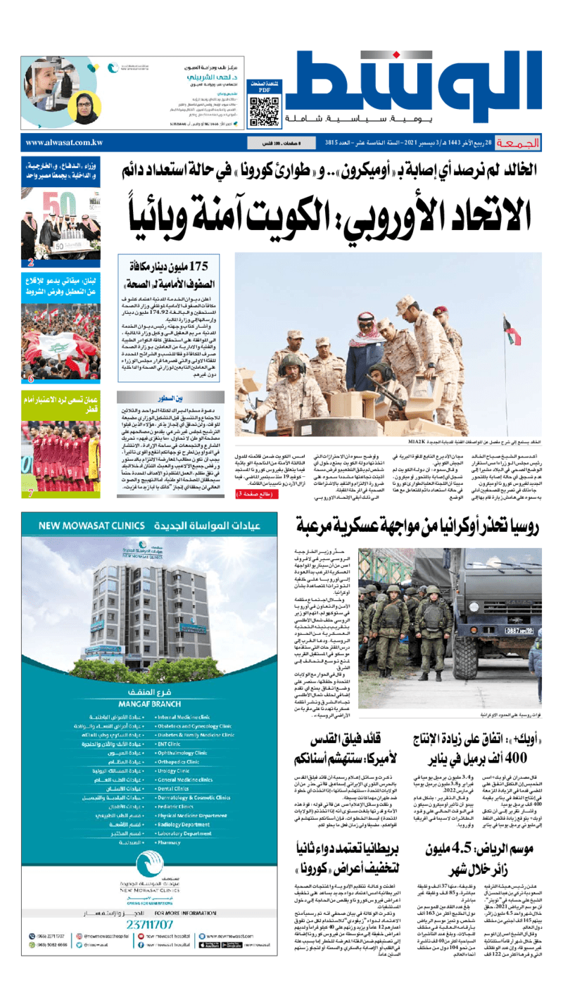 آخر الأخبار جرائم وقضايا “الجمارك” تضبط 29 ألف علبة مشروبات كحولية قادمة من دولة آسيوية في ميناء الشويخ 9 يونيو، 2024 محليات ممثلة عن دولة الكويت الطبيبة الكويتية أسماء الكندري تشارك في المؤتمر العالمي للمناظير في إيطاليا 8 يونيو، 2024 محليات “الصحة”: اكتمال وصول فريق الخدمات الطبية ببعثة الحج الكويتية لمكة المكرمة 8 يونيو، 2024 محليات “الصحة” تحدد 8 مراكز للصحة المدرسية لاستقبال الطلبة المبتعثين 8 يونيو، 2024 عربي وعالمي “الصحة العالمية”: تسجيل أول وفاة لشخص مصاب بـ«أنفلونزا الطيور» 7 يونيو، 2024 محليات عناوين الصحف الكويتية ليوم السبت 04 ديسمبر 2021 محرر المحليات4 ديسمبر، 2021أضف تعليق1 دقائق جريدة الوطن جريدة الوسط الوسومTop عناوين الصحف المحلية من الممكن أن يعجبك جرائم وقضايا “الجمارك” تضبط 29 ألف علبة مشروبات كحولية قادمة من دولة آسيوية في ميناء الشويخ محليات ممثلة عن دولة الكويت الطبيبة الكويتية أسماء الكندري تشارك في المؤتمر العالمي للمناظير في إيطاليا محليات “الصحة”: اكتمال وصول فريق الخدمات الطبية ببعثة الحج الكويتية لمكة المكرمة محليات “الصحة” تحدد 8 مراكز للصحة المدرسية لاستقبال الطلبة المبتعثين عربي وعالمي “الصحة العالمية”: تسجيل أول وفاة لشخص مصاب بـ«أنفلونزا الطيور» تكنولوجيا رش السحب بملح البحر.. تجربة “ثورية” لتبريد كوكب الأرض أضف تعليق أضغط هنا لإضافة تعليق إلغاء الردالتعليقالاسم البريد الإلكتروني الموقع الإلكتروني Δ هذا الموقع يستخدم خدمة أكيسميت للتقليل من البريد المزعجة. اعرف المزيد عن كيفية التعامل مع بيانات التعليقات الخاصة بك processed.