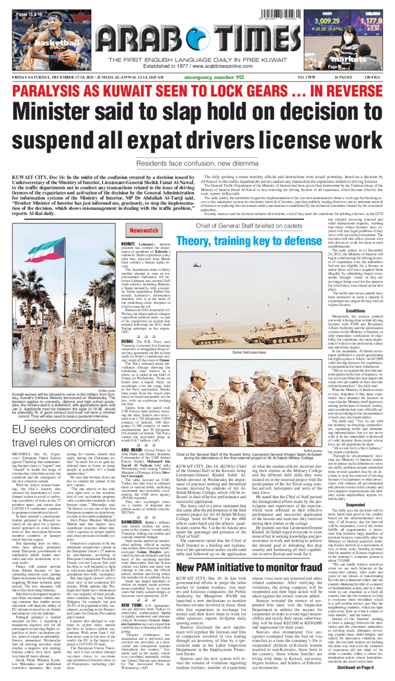 عناوين الصحف الكويتية ليوم الجمعة 17 ديسمبر 2021