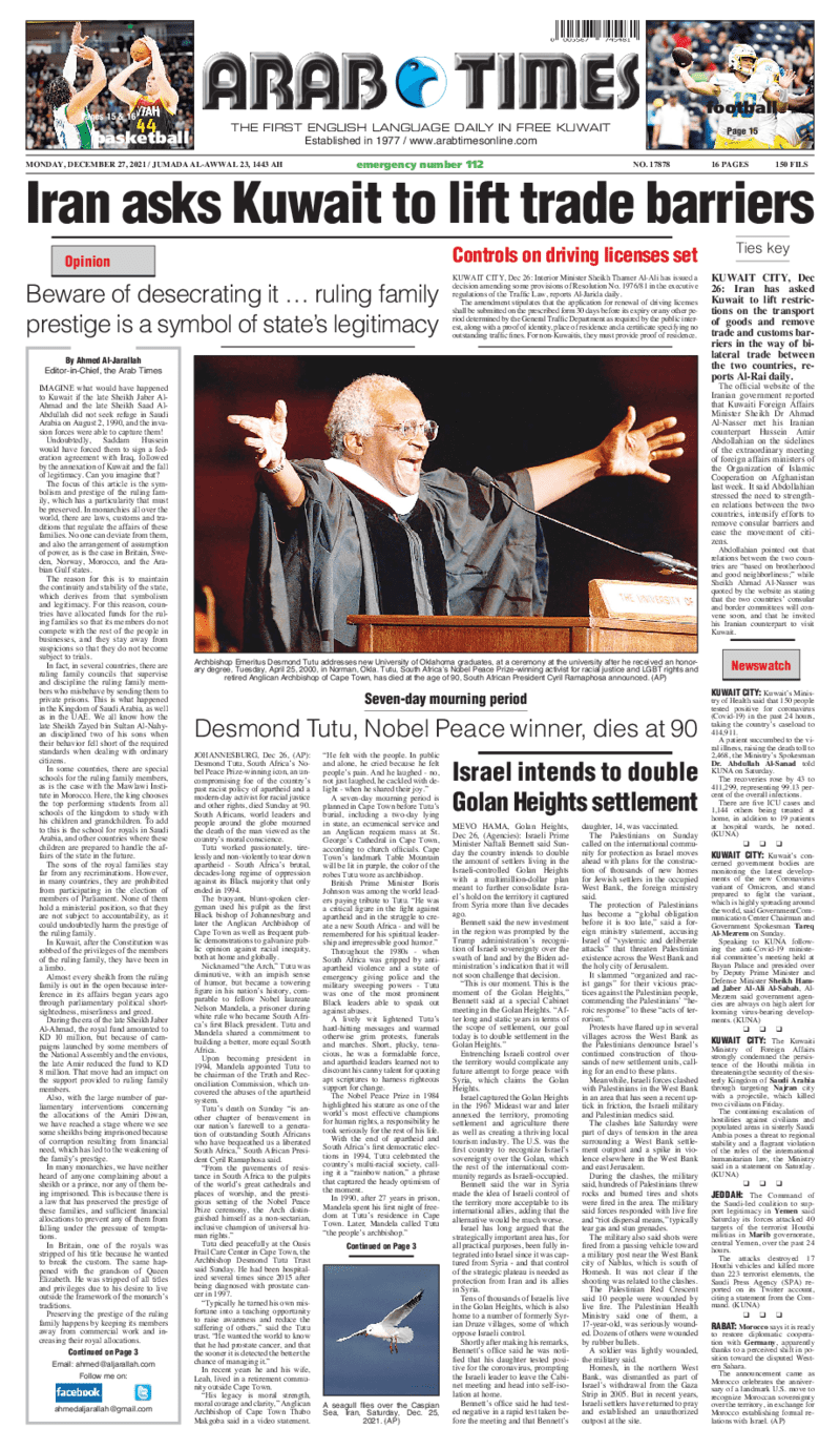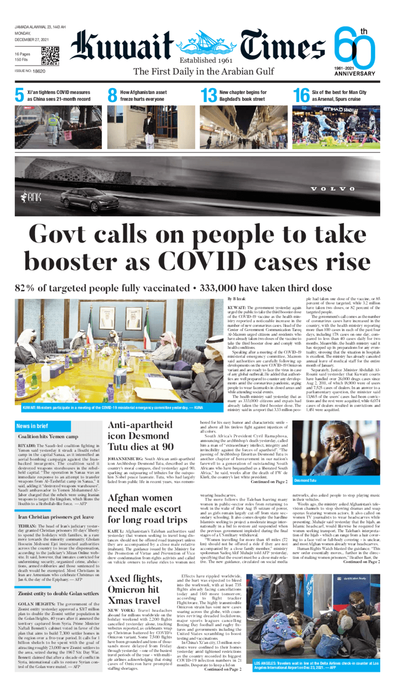 عناوين الصحف الكويتية ليوم الاثنين 27 ديسمبر 2021