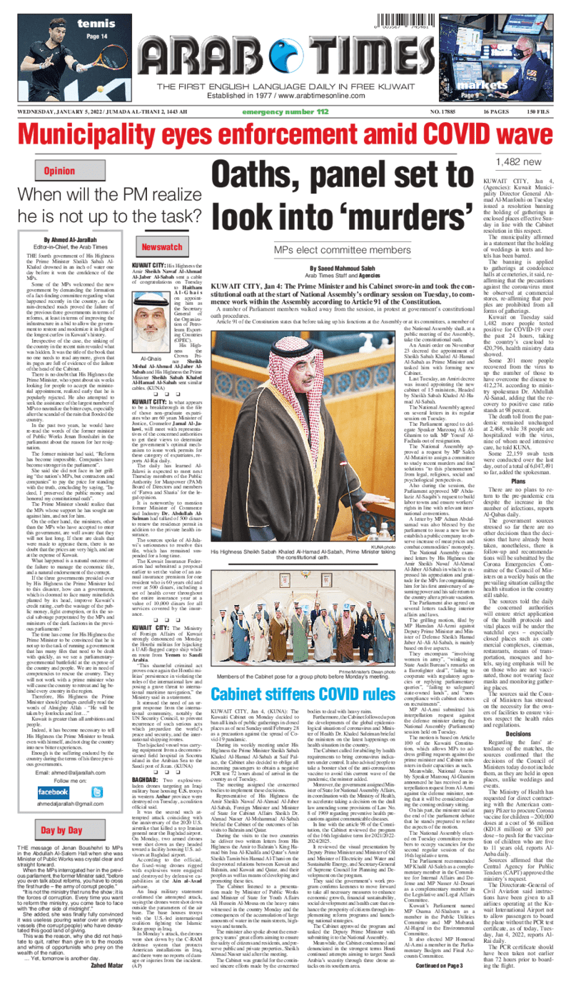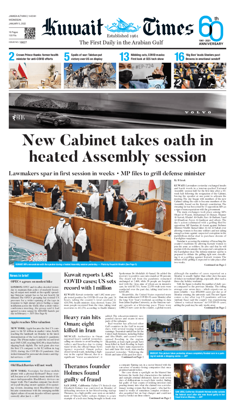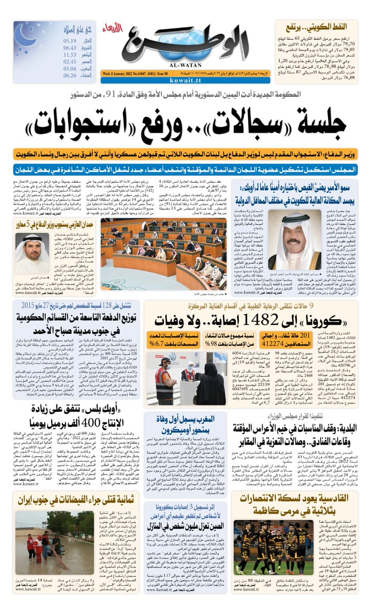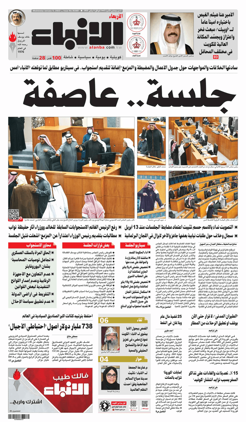 آخر الأخبار جرائم وقضايا “الجمارك” تضبط 29 ألف علبة مشروبات كحولية قادمة من دولة آسيوية في ميناء الشويخ 9 يونيو، 2024 محليات ممثلة عن دولة الكويت الطبيبة الكويتية أسماء الكندري تشارك في المؤتمر العالمي للمناظير في إيطاليا 8 يونيو، 2024 محليات “الصحة”: اكتمال وصول فريق الخدمات الطبية ببعثة الحج الكويتية لمكة المكرمة 8 يونيو، 2024 محليات “الصحة” تحدد 8 مراكز للصحة المدرسية لاستقبال الطلبة المبتعثين 8 يونيو، 2024 عربي وعالمي “الصحة العالمية”: تسجيل أول وفاة لشخص مصاب بـ«أنفلونزا الطيور» 7 يونيو، 2024 محليات عناوين الصحف الكويتية ليوم الأربعاء 05 يناير 2022 محرر المحليات5 يناير، 2022أضف تعليق1 دقائق جريدة الجريدة جريدة الأنباء جريدة القبس جريدة السياسة جريدة الوطن جريدة الصباح جريدة عرب تايمز جريدة كويت تايمز الوسومTop عناوين الصحف المحلية من الممكن أن يعجبك جرائم وقضايا “الجمارك” تضبط 29 ألف علبة مشروبات كحولية قادمة من دولة آسيوية في ميناء الشويخ محليات ممثلة عن دولة الكويت الطبيبة الكويتية أسماء الكندري تشارك في المؤتمر العالمي للمناظير في إيطاليا محليات “الصحة”: اكتمال وصول فريق الخدمات الطبية ببعثة الحج الكويتية لمكة المكرمة محليات “الصحة” تحدد 8 مراكز للصحة المدرسية لاستقبال الطلبة المبتعثين عربي وعالمي “الصحة العالمية”: تسجيل أول وفاة لشخص مصاب بـ«أنفلونزا الطيور» تكنولوجيا رش السحب بملح البحر.. تجربة “ثورية” لتبريد كوكب الأرض أضف تعليق أضغط هنا لإضافة تعليق إلغاء الردالتعليقالاسم البريد الإلكتروني الموقع الإلكتروني Δ هذا الموقع يستخدم خدمة أكيسميت للتقليل من البريد المزعجة. اعرف المزيد عن كيفية التعامل مع بيانات التعليقات الخاصة بك processed.