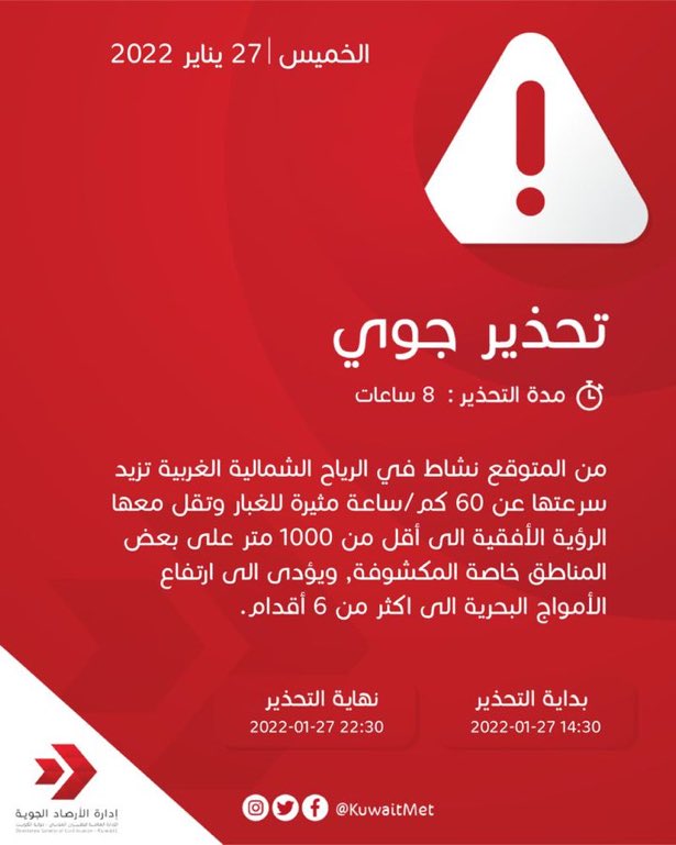 حذرت إدارة الأرصاد الجوية من نشاط في الرياح الشمالية الغربية المتوقع أن تزيد سرعتها عن 60 كيلو متر في الساعة، ما يثير معها الغبار وبالتالي تقل الرؤية الأفقية إلى أقل من 1000 متر في بعض المناطق المكشوفة، ويؤدي إلى ارتفاع الأمواج البحرية إلى أكثر من 6 أقدام.