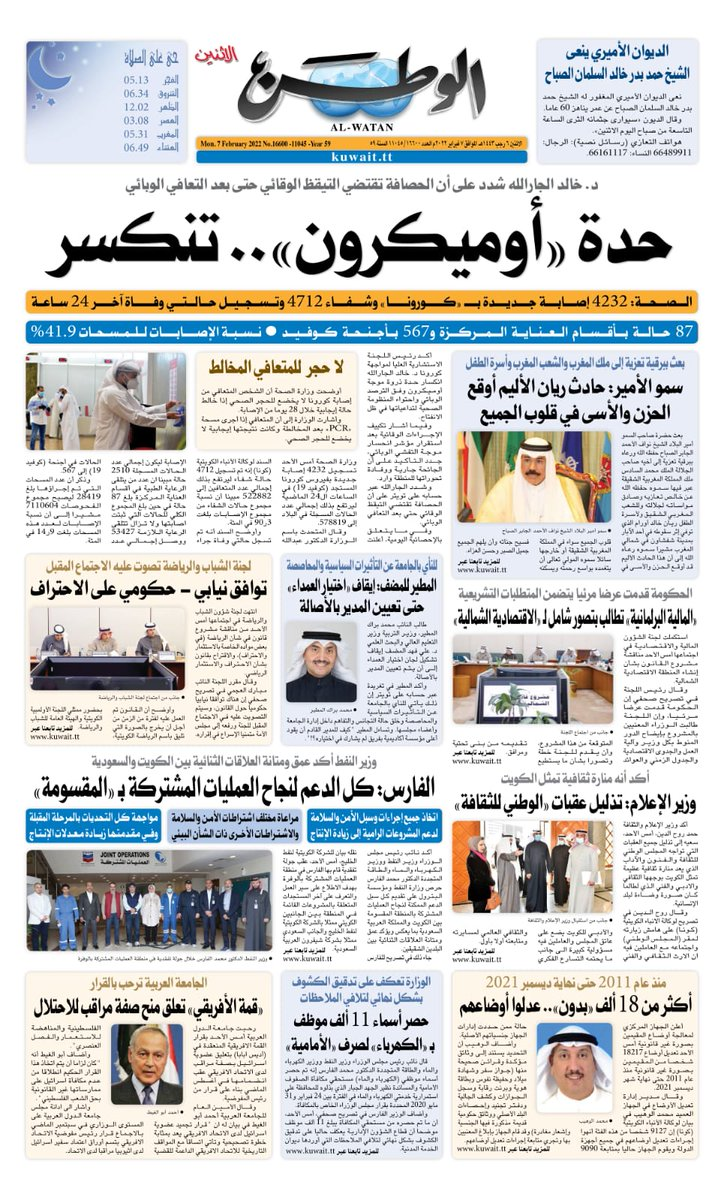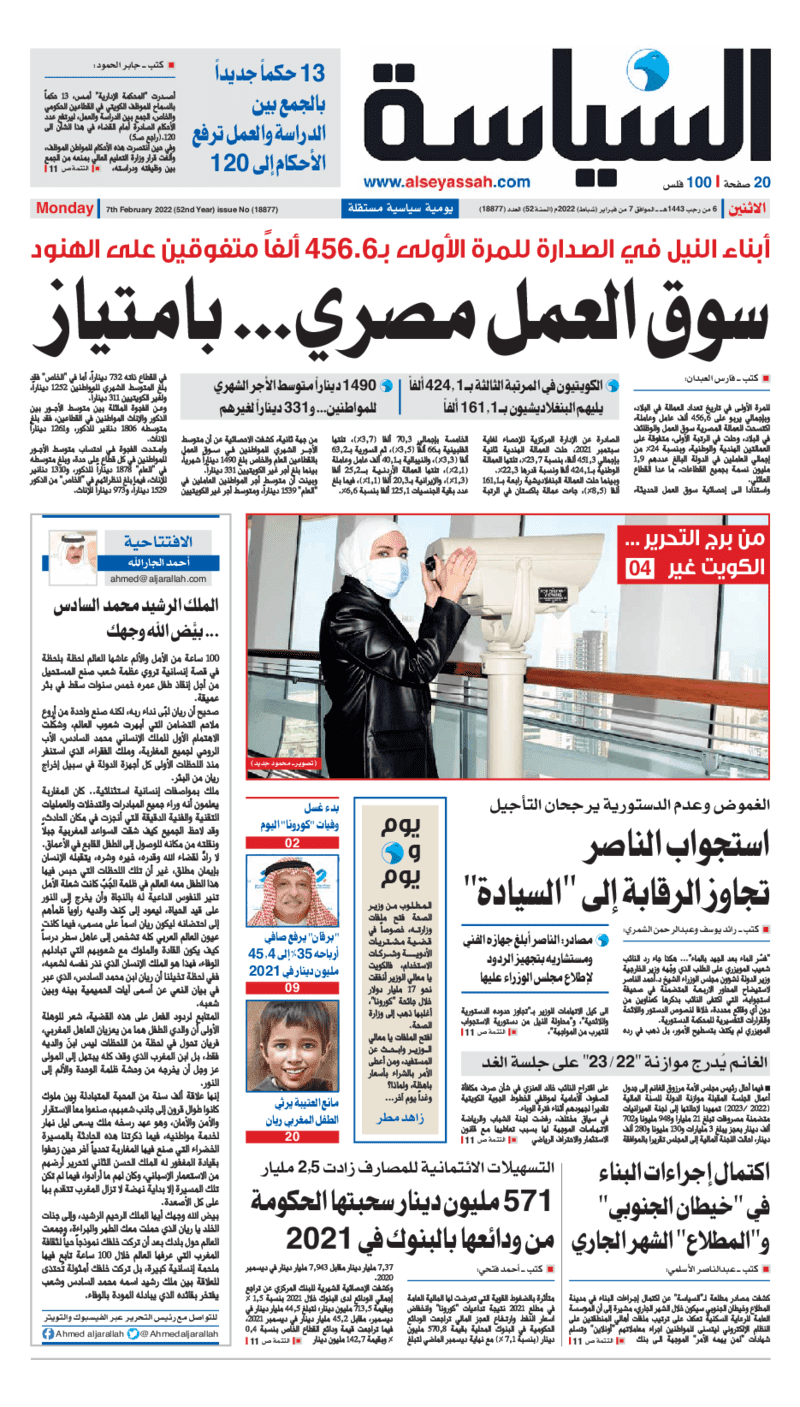 آخر الأخبار جرائم وقضايا “الجمارك” تضبط 29 ألف علبة مشروبات كحولية قادمة من دولة آسيوية في ميناء الشويخ 9 يونيو، 2024 محليات ممثلة عن دولة الكويت الطبيبة الكويتية أسماء الكندري تشارك في المؤتمر العالمي للمناظير في إيطاليا 8 يونيو، 2024 محليات “الصحة”: اكتمال وصول فريق الخدمات الطبية ببعثة الحج الكويتية لمكة المكرمة 8 يونيو، 2024 محليات “الصحة” تحدد 8 مراكز للصحة المدرسية لاستقبال الطلبة المبتعثين 8 يونيو، 2024 عربي وعالمي “الصحة العالمية”: تسجيل أول وفاة لشخص مصاب بـ«أنفلونزا الطيور» 7 يونيو، 2024 محليات عناوين الصحف الكويتية ليوم الاثنين 07 فبراير 2022 محرر المحليات7 فبراير، 2022أضف تعليق1 دقائق جريدة الجريدة جريدة الأنباء جريدة القبس جريدة السياسة جريدة الوطن جريدة النهار جريدة الصباح جريدة عرب تايمز الوسومTop عناوين الصحف المحلية من الممكن أن يعجبك جرائم وقضايا “الجمارك” تضبط 29 ألف علبة مشروبات كحولية قادمة من دولة آسيوية في ميناء الشويخ محليات ممثلة عن دولة الكويت الطبيبة الكويتية أسماء الكندري تشارك في المؤتمر العالمي للمناظير في إيطاليا محليات “الصحة”: اكتمال وصول فريق الخدمات الطبية ببعثة الحج الكويتية لمكة المكرمة محليات “الصحة” تحدد 8 مراكز للصحة المدرسية لاستقبال الطلبة المبتعثين عربي وعالمي “الصحة العالمية”: تسجيل أول وفاة لشخص مصاب بـ«أنفلونزا الطيور» تكنولوجيا رش السحب بملح البحر.. تجربة “ثورية” لتبريد كوكب الأرض أضف تعليق أضغط هنا لإضافة تعليق إلغاء الردالتعليقالاسم البريد الإلكتروني الموقع الإلكتروني Δ هذا الموقع يستخدم خدمة أكيسميت للتقليل من البريد المزعجة. اعرف المزيد عن كيفية التعامل مع بيانات التعليقات الخاصة بك processed.