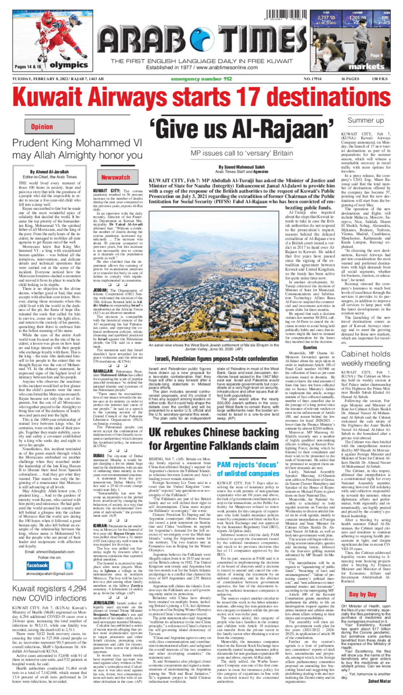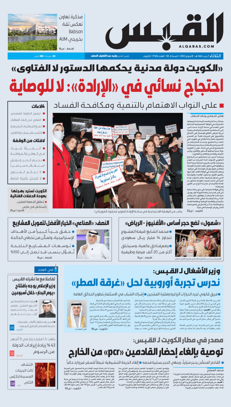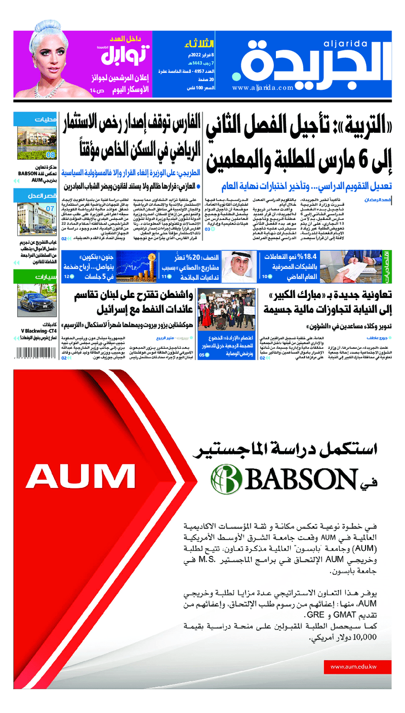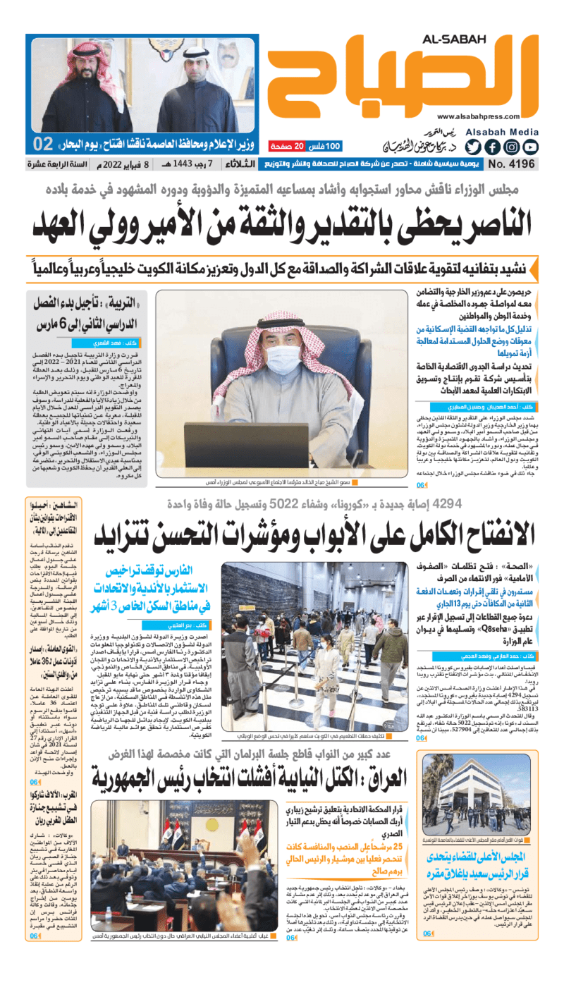 آخر الأخبار جرائم وقضايا “الجمارك” تضبط 29 ألف علبة مشروبات كحولية قادمة من دولة آسيوية في ميناء الشويخ 9 يونيو، 2024 محليات ممثلة عن دولة الكويت الطبيبة الكويتية أسماء الكندري تشارك في المؤتمر العالمي للمناظير في إيطاليا 8 يونيو، 2024 محليات “الصحة”: اكتمال وصول فريق الخدمات الطبية ببعثة الحج الكويتية لمكة المكرمة 8 يونيو، 2024 محليات “الصحة” تحدد 8 مراكز للصحة المدرسية لاستقبال الطلبة المبتعثين 8 يونيو، 2024 عربي وعالمي “الصحة العالمية”: تسجيل أول وفاة لشخص مصاب بـ«أنفلونزا الطيور» 7 يونيو، 2024 محليات عناوين الصحف الكويتية ليوم الثلاثاء 08 فبراير 2022 محرر المحليات8 فبراير، 2022أضف تعليق1 دقائق جريدة الجريدة جريدة الأنباء جريدة القبس جريدة السياسة جريدة الوطن جريدة النهار جريدة الصباح جريدة عرب تايمز الوسومTop عناوين الصحف المحلية من الممكن أن يعجبك جرائم وقضايا “الجمارك” تضبط 29 ألف علبة مشروبات كحولية قادمة من دولة آسيوية في ميناء الشويخ محليات ممثلة عن دولة الكويت الطبيبة الكويتية أسماء الكندري تشارك في المؤتمر العالمي للمناظير في إيطاليا محليات “الصحة”: اكتمال وصول فريق الخدمات الطبية ببعثة الحج الكويتية لمكة المكرمة محليات “الصحة” تحدد 8 مراكز للصحة المدرسية لاستقبال الطلبة المبتعثين عربي وعالمي “الصحة العالمية”: تسجيل أول وفاة لشخص مصاب بـ«أنفلونزا الطيور» تكنولوجيا رش السحب بملح البحر.. تجربة “ثورية” لتبريد كوكب الأرض أضف تعليق أضغط هنا لإضافة تعليق إلغاء الردالتعليقالاسم البريد الإلكتروني الموقع الإلكتروني Δ هذا الموقع يستخدم خدمة أكيسميت للتقليل من البريد المزعجة. اعرف المزيد عن كيفية التعامل مع بيانات التعليقات الخاصة بك processed.