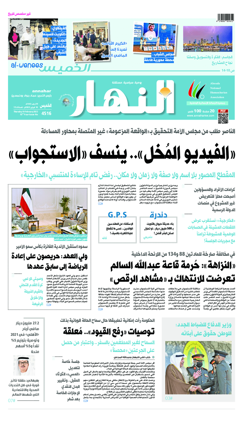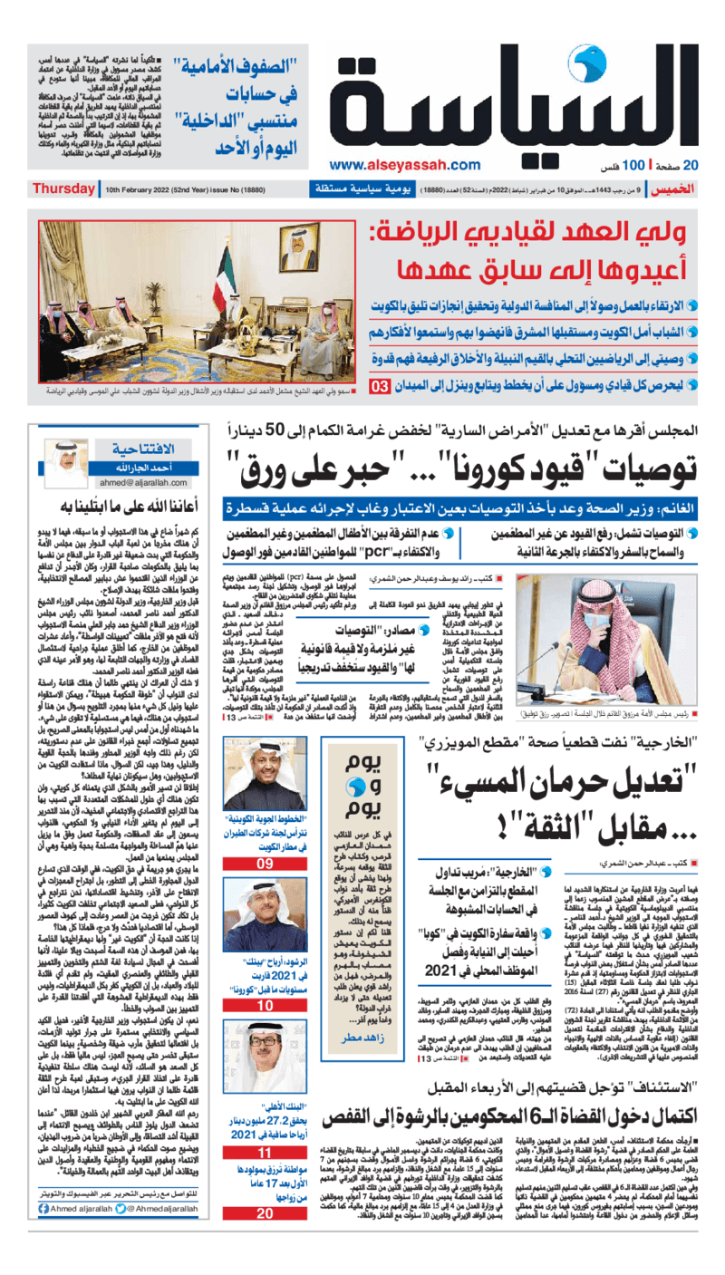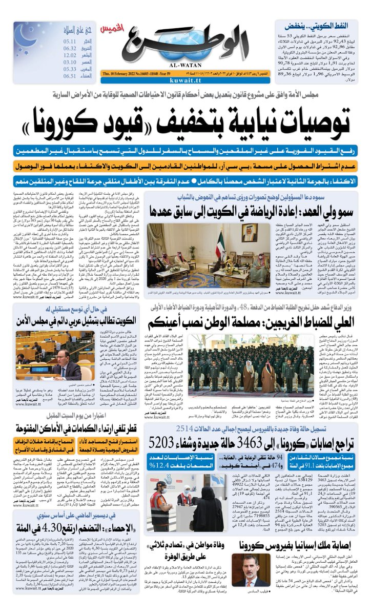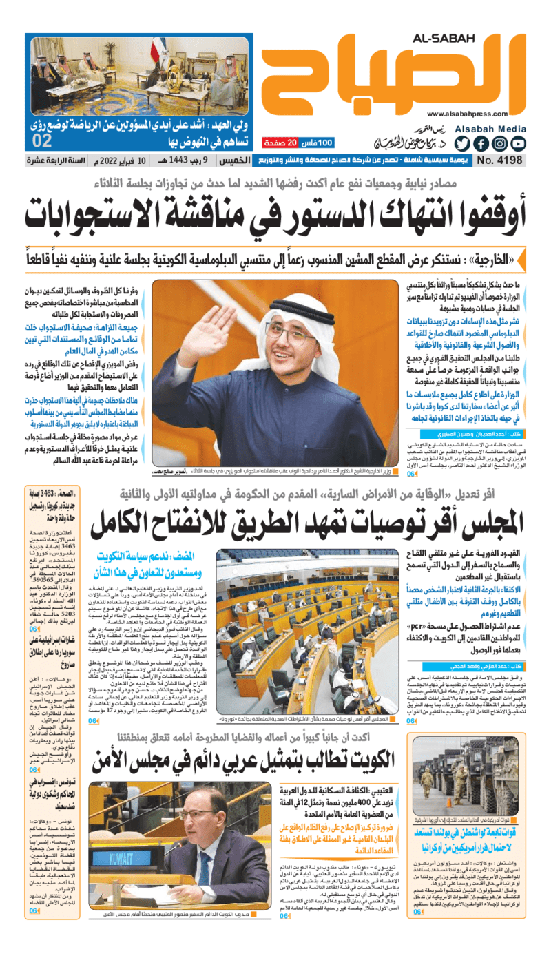 آخر الأخبار جرائم وقضايا “الجمارك” تضبط 29 ألف علبة مشروبات كحولية قادمة من دولة آسيوية في ميناء الشويخ 9 يونيو، 2024 محليات ممثلة عن دولة الكويت الطبيبة الكويتية أسماء الكندري تشارك في المؤتمر العالمي للمناظير في إيطاليا 8 يونيو، 2024 محليات “الصحة”: اكتمال وصول فريق الخدمات الطبية ببعثة الحج الكويتية لمكة المكرمة 8 يونيو، 2024 محليات “الصحة” تحدد 8 مراكز للصحة المدرسية لاستقبال الطلبة المبتعثين 8 يونيو، 2024 عربي وعالمي “الصحة العالمية”: تسجيل أول وفاة لشخص مصاب بـ«أنفلونزا الطيور» 7 يونيو، 2024 محليات عناوين الصحف الكويتية ليوم الخميس 10 فبراير 2022 محرر المحليات10 فبراير، 2022أضف تعليق1 دقائق جريدة الجريدة جريدة الأنباء جريدة القبس جريدة السياسة جريدة الوطن جريدة النهار جريدة الصباح جريدة عرب تايمز الوسومTop عناوين الصحف المحلية من الممكن أن يعجبك جرائم وقضايا “الجمارك” تضبط 29 ألف علبة مشروبات كحولية قادمة من دولة آسيوية في ميناء الشويخ محليات ممثلة عن دولة الكويت الطبيبة الكويتية أسماء الكندري تشارك في المؤتمر العالمي للمناظير في إيطاليا محليات “الصحة”: اكتمال وصول فريق الخدمات الطبية ببعثة الحج الكويتية لمكة المكرمة محليات “الصحة” تحدد 8 مراكز للصحة المدرسية لاستقبال الطلبة المبتعثين عربي وعالمي “الصحة العالمية”: تسجيل أول وفاة لشخص مصاب بـ«أنفلونزا الطيور» تكنولوجيا رش السحب بملح البحر.. تجربة “ثورية” لتبريد كوكب الأرض أضف تعليق أضغط هنا لإضافة تعليق إلغاء الردالتعليقالاسم البريد الإلكتروني الموقع الإلكتروني Δ هذا الموقع يستخدم خدمة أكيسميت للتقليل من البريد المزعجة. اعرف المزيد عن كيفية التعامل مع بيانات التعليقات الخاصة بك processed.