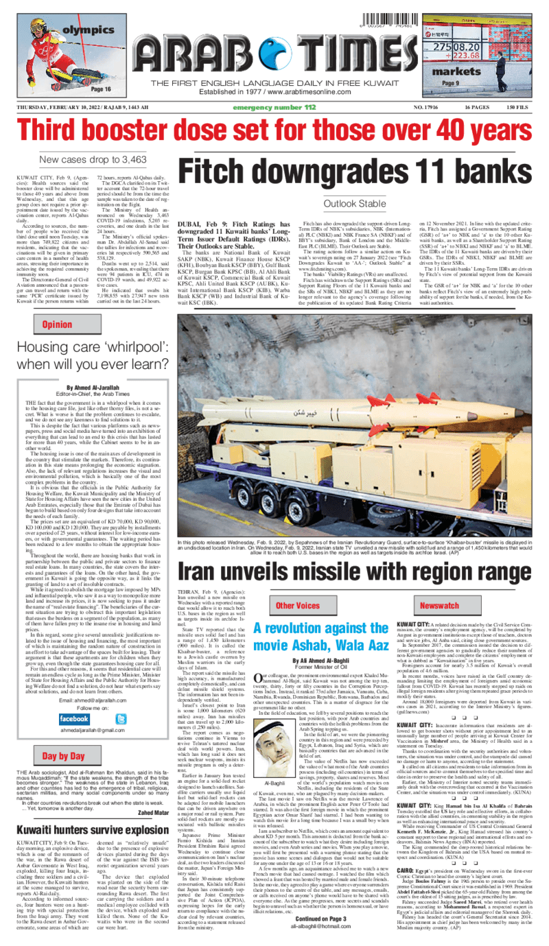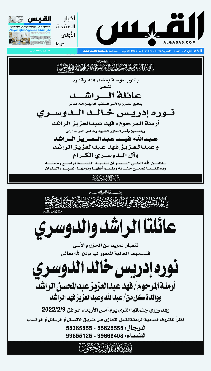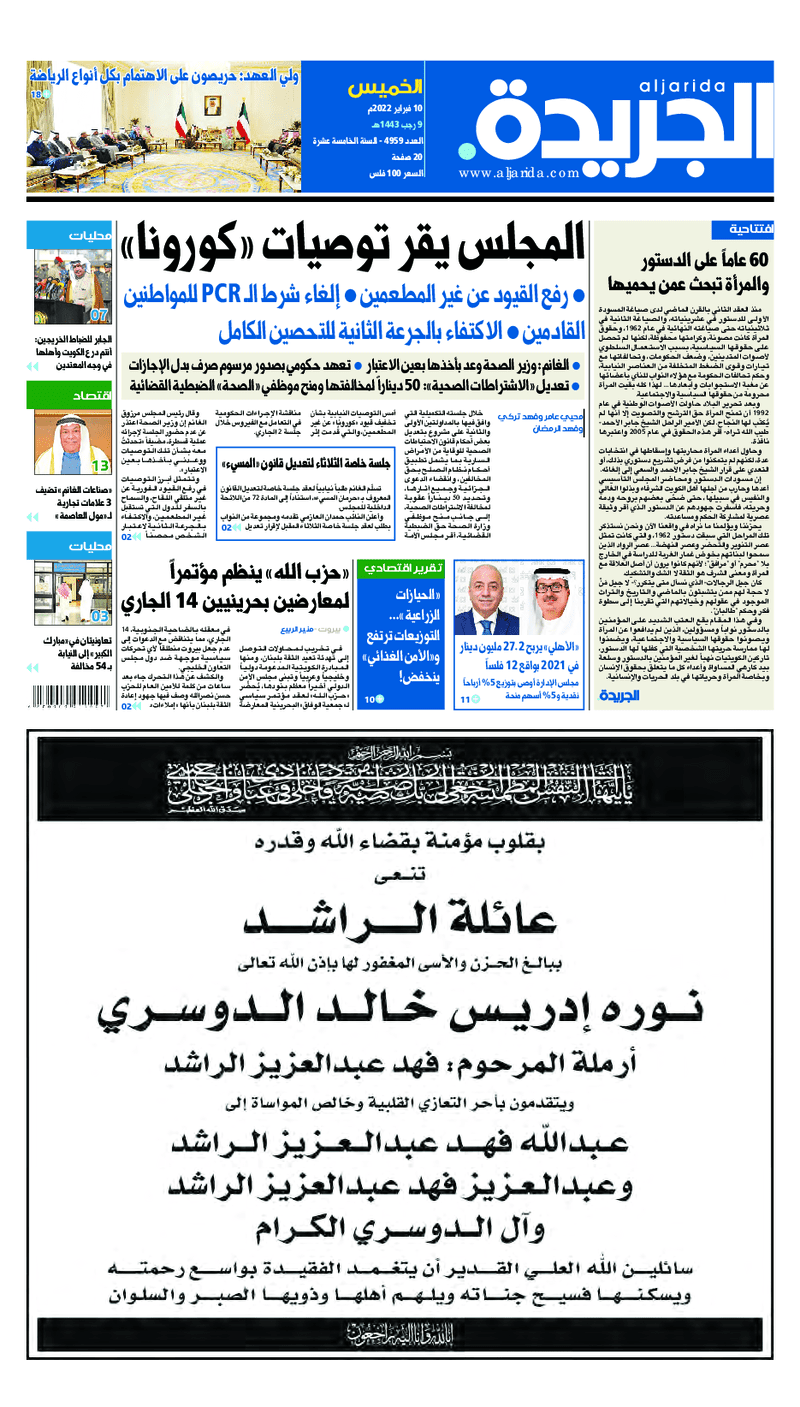 آخر الأخبار جرائم وقضايا “الجمارك” تضبط 29 ألف علبة مشروبات كحولية قادمة من دولة آسيوية في ميناء الشويخ 9 يونيو، 2024 محليات ممثلة عن دولة الكويت الطبيبة الكويتية أسماء الكندري تشارك في المؤتمر العالمي للمناظير في إيطاليا 8 يونيو، 2024 محليات “الصحة”: اكتمال وصول فريق الخدمات الطبية ببعثة الحج الكويتية لمكة المكرمة 8 يونيو، 2024 محليات “الصحة” تحدد 8 مراكز للصحة المدرسية لاستقبال الطلبة المبتعثين 8 يونيو، 2024 عربي وعالمي “الصحة العالمية”: تسجيل أول وفاة لشخص مصاب بـ«أنفلونزا الطيور» 7 يونيو، 2024 محليات عناوين الصحف الكويتية ليوم الخميس 10 فبراير 2022 محرر المحليات10 فبراير، 2022أضف تعليق1 دقائق جريدة الجريدة جريدة الأنباء جريدة القبس جريدة السياسة جريدة الوطن جريدة النهار جريدة الصباح جريدة عرب تايمز الوسومTop عناوين الصحف المحلية من الممكن أن يعجبك جرائم وقضايا “الجمارك” تضبط 29 ألف علبة مشروبات كحولية قادمة من دولة آسيوية في ميناء الشويخ محليات ممثلة عن دولة الكويت الطبيبة الكويتية أسماء الكندري تشارك في المؤتمر العالمي للمناظير في إيطاليا محليات “الصحة”: اكتمال وصول فريق الخدمات الطبية ببعثة الحج الكويتية لمكة المكرمة محليات “الصحة” تحدد 8 مراكز للصحة المدرسية لاستقبال الطلبة المبتعثين عربي وعالمي “الصحة العالمية”: تسجيل أول وفاة لشخص مصاب بـ«أنفلونزا الطيور» تكنولوجيا رش السحب بملح البحر.. تجربة “ثورية” لتبريد كوكب الأرض أضف تعليق أضغط هنا لإضافة تعليق إلغاء الردالتعليقالاسم البريد الإلكتروني الموقع الإلكتروني Δ هذا الموقع يستخدم خدمة أكيسميت للتقليل من البريد المزعجة. اعرف المزيد عن كيفية التعامل مع بيانات التعليقات الخاصة بك processed.